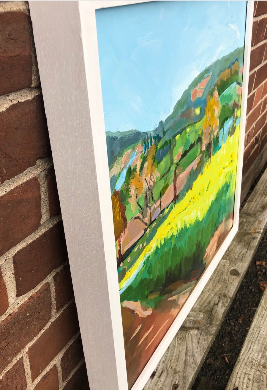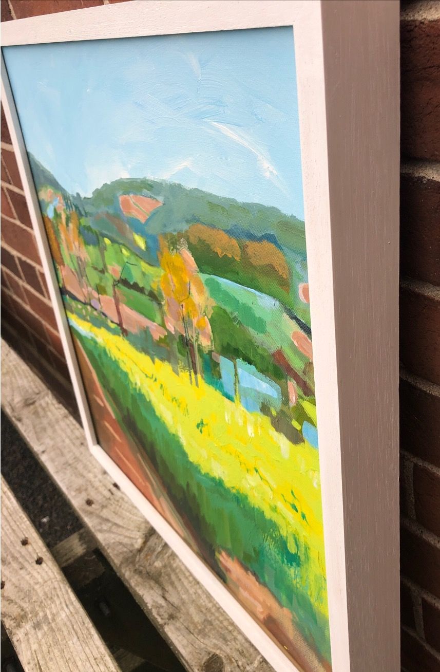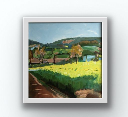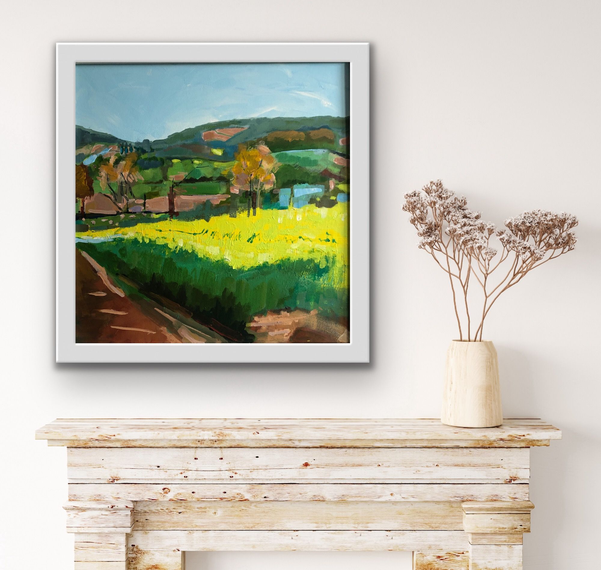 Rape fields was painted en plein air in Herefordshire, from Hardwick house Hereford. It was painted on 29th of September on the hottest September day recorded. The colours are so hot they have the feel of Provence. The citrus yellow rape fields contrasting with the veridian greens in the foliage.