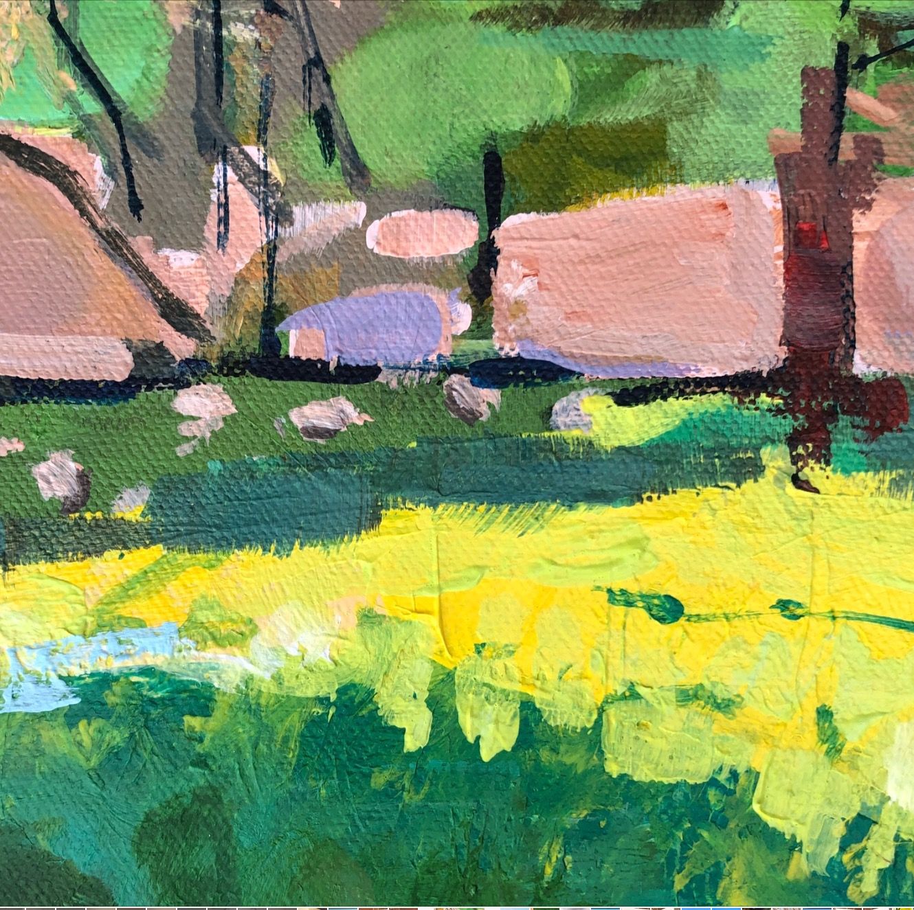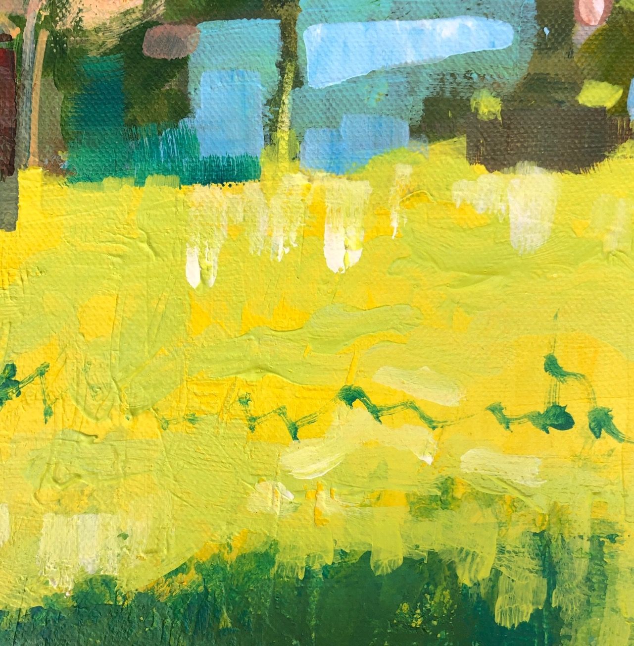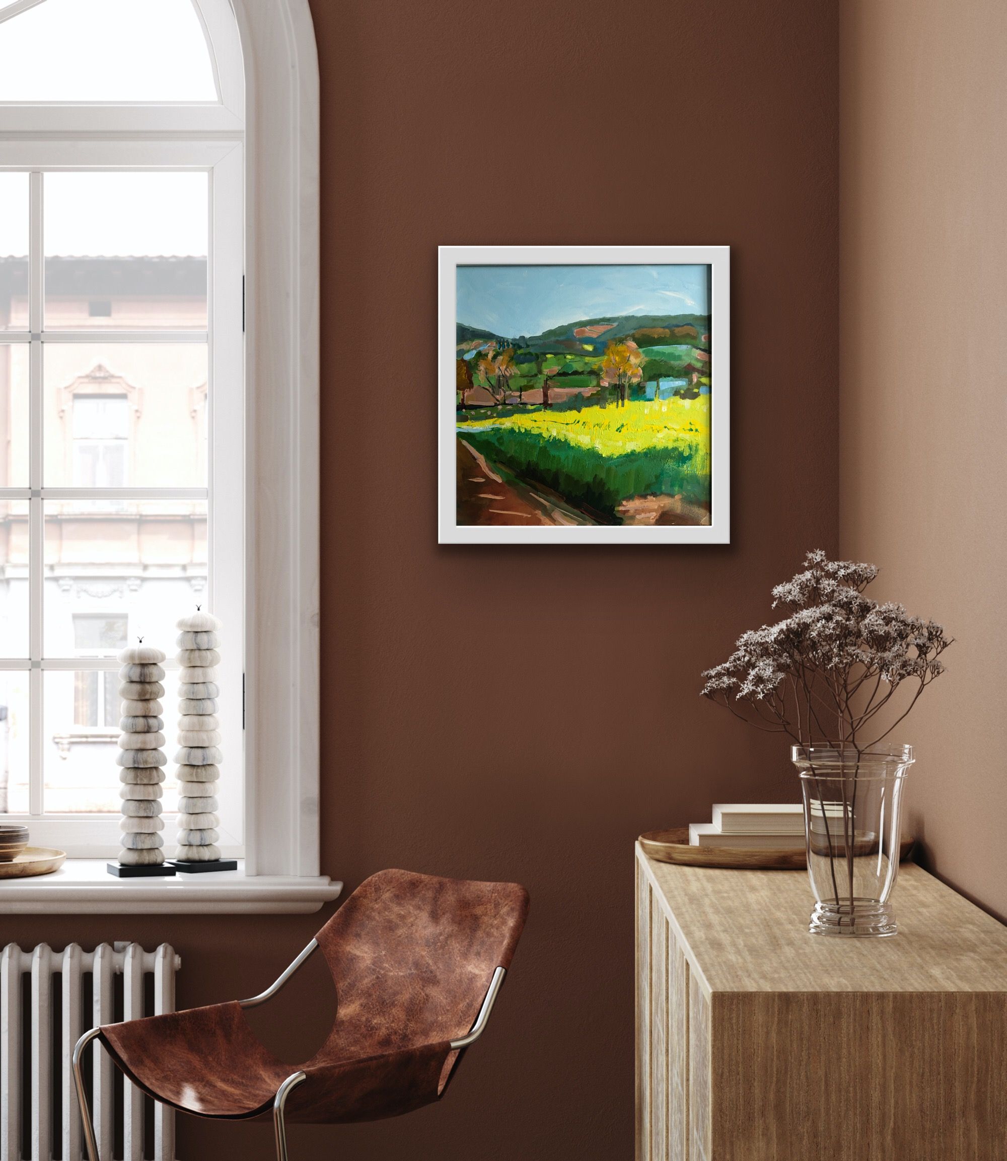 Rape fields was painted en plein air in Herefordshire, from Hardwick house Hereford. It was painted on 29th of September on the hottest September day recorded. The colours are so hot they have the feel of Provence. The citrus yellow rape fields contrasting with the veridian greens in the foliage.