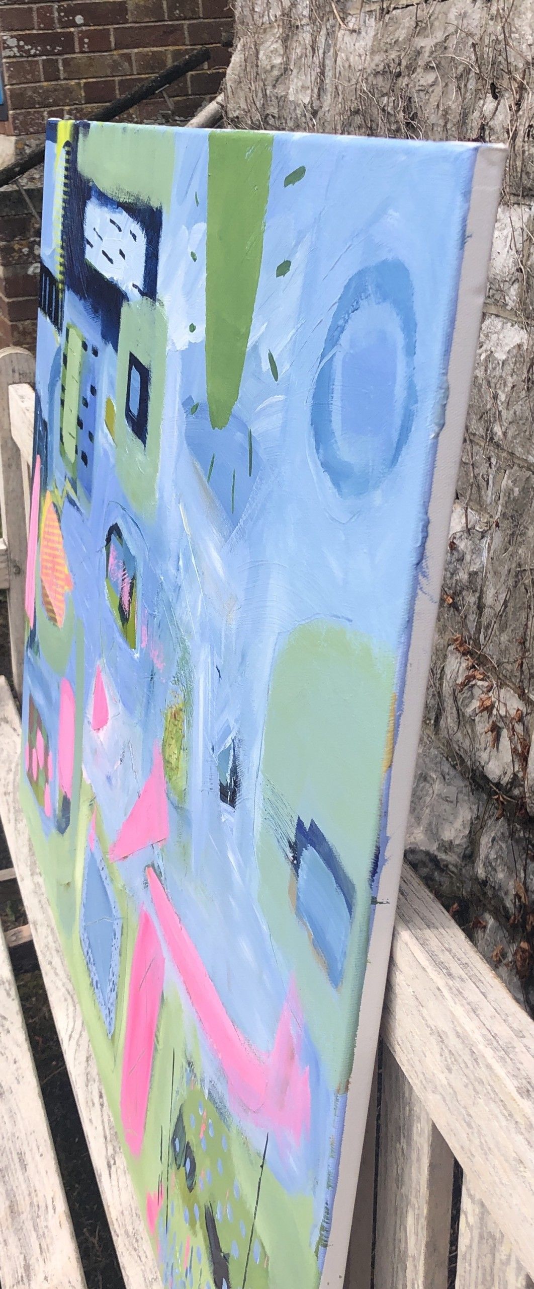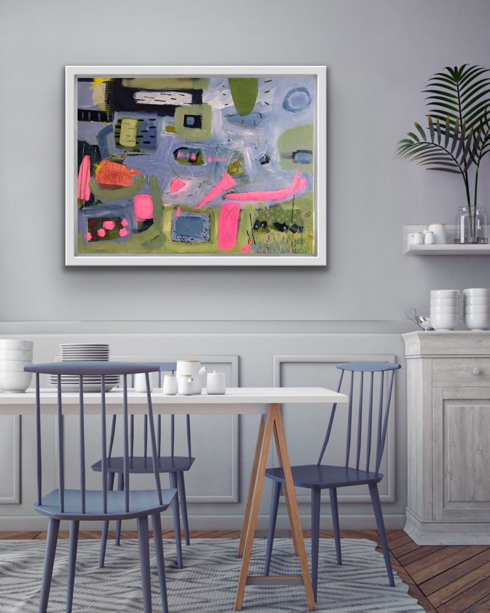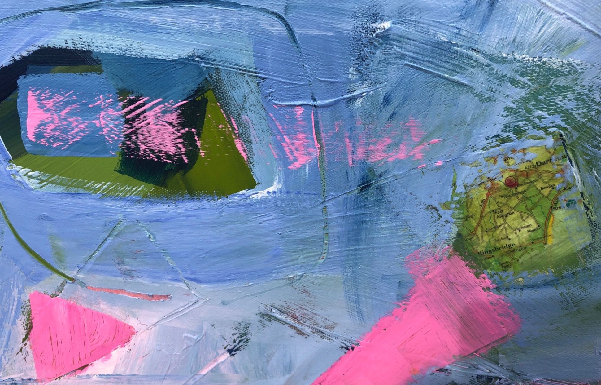 This large abstract canvas, is inspired by studies made 'en plein air' on Dartmoor. Collage is added and graffiti spray paint for a contemporary feel. Visits to beaches in the south Hams have further informed the work. Making for a lively fun summery feel , with juxtaposition between the moors,