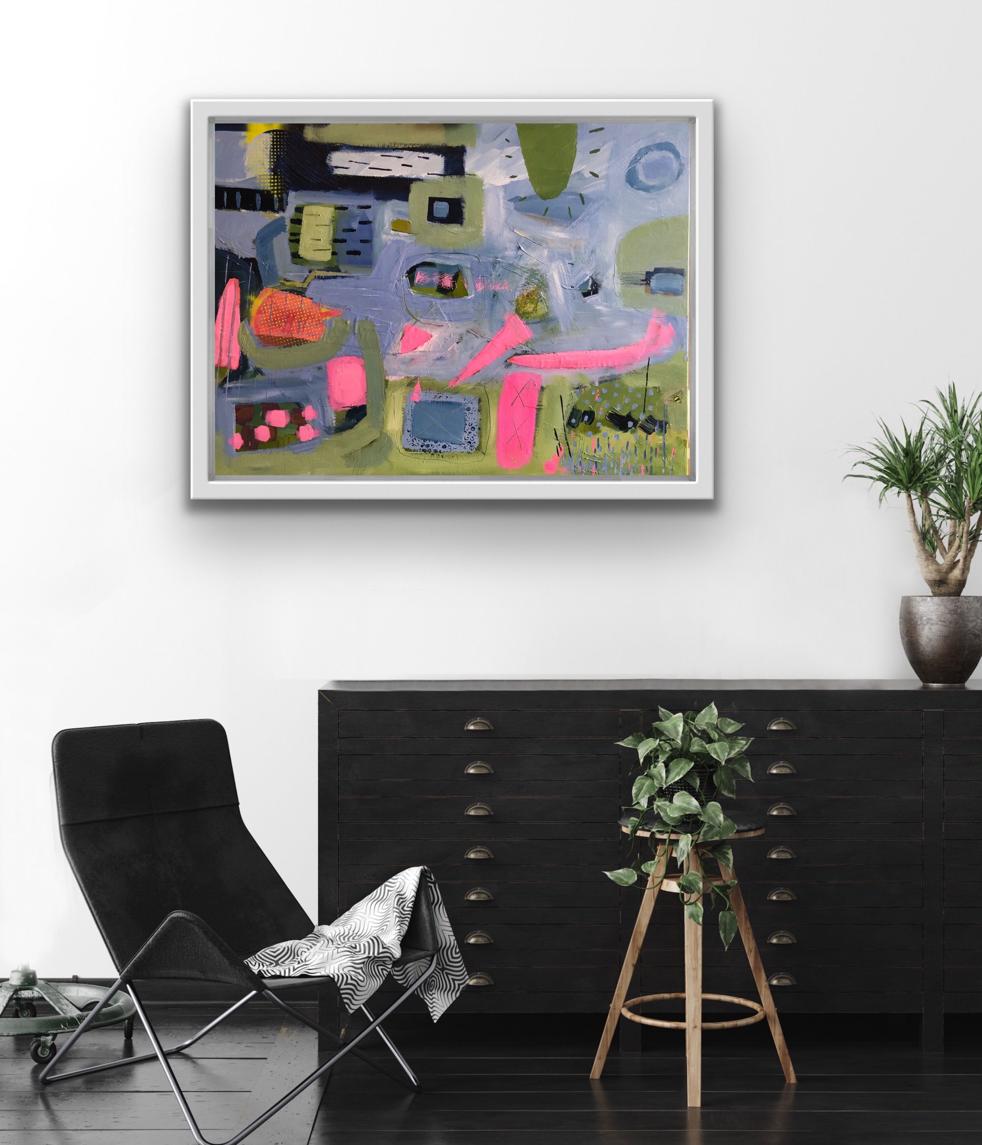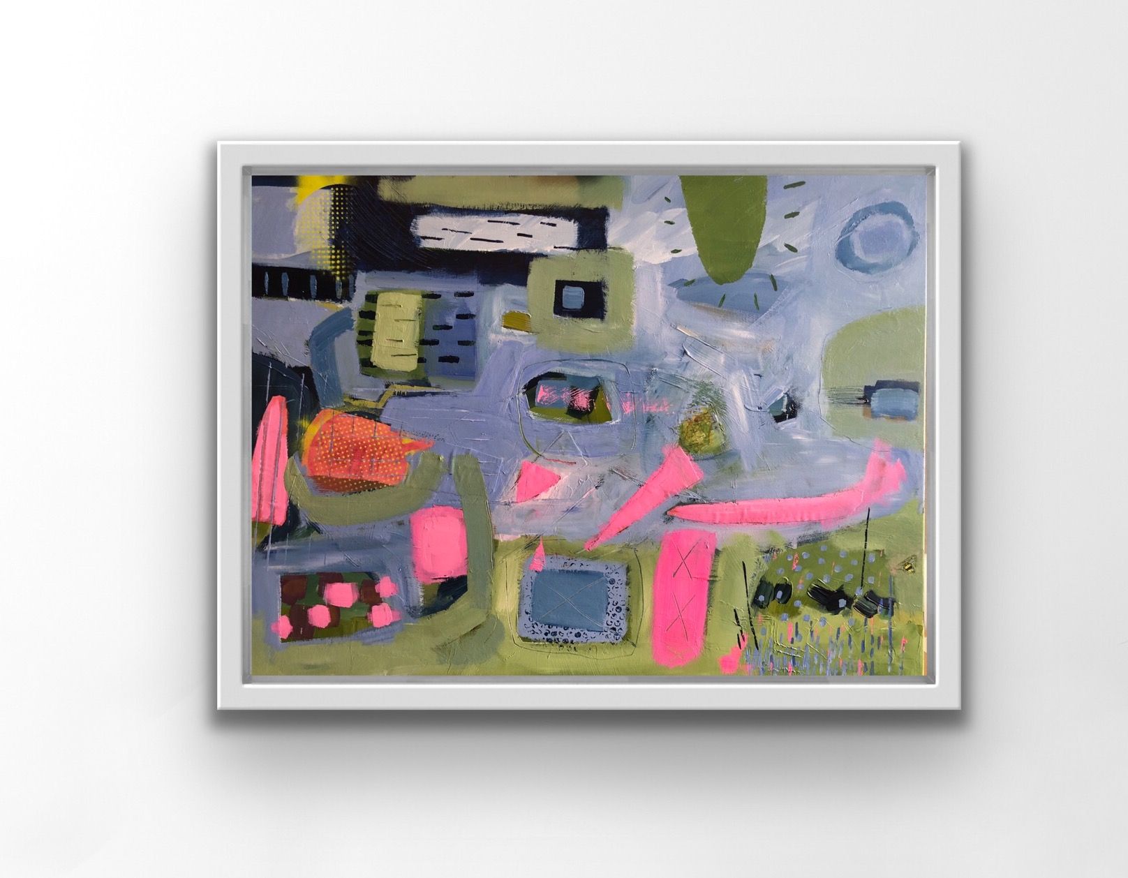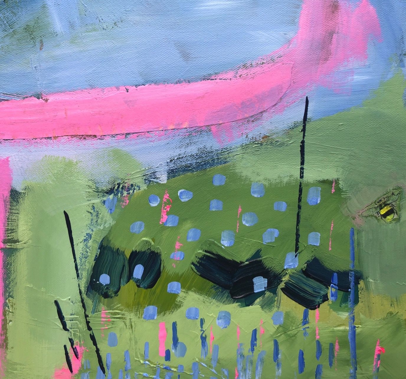 This large abstract canvas, is inspired by studies made 'en plein air' on Dartmoor. Collage is added and graffiti spray paint for a contemporary feel. Visits to beaches in the south Hams have further informed the work. Making for a lively fun summery feel , with juxtaposition between the moors,