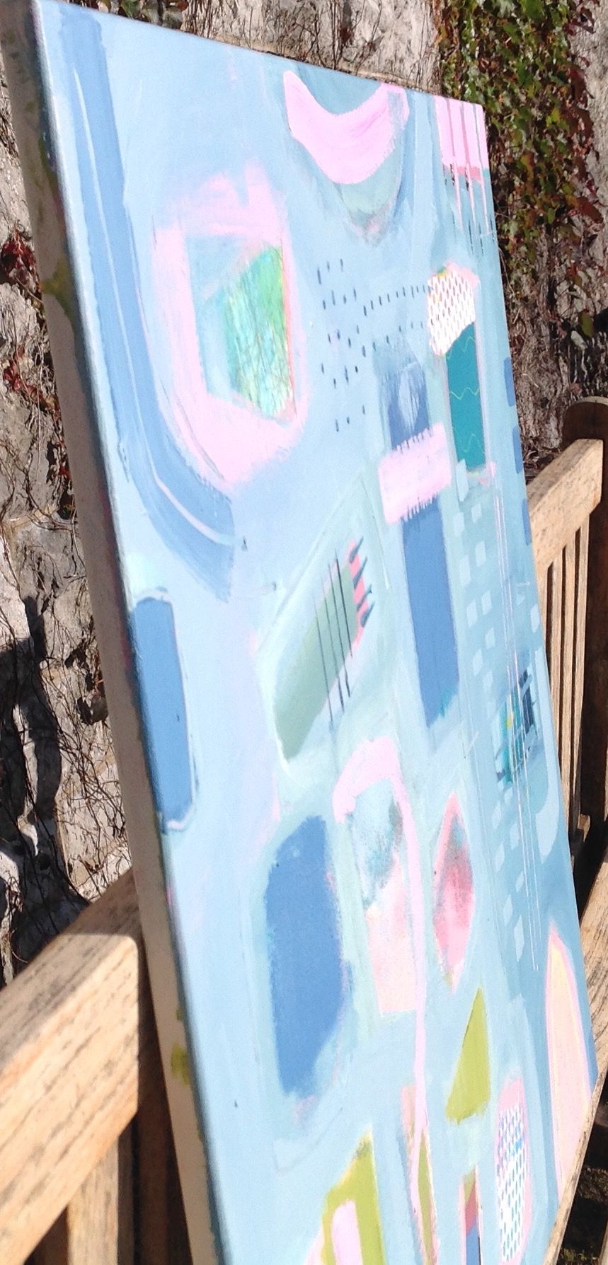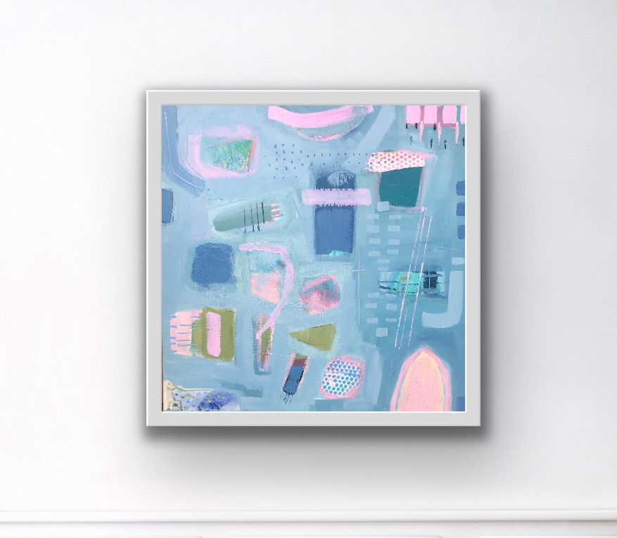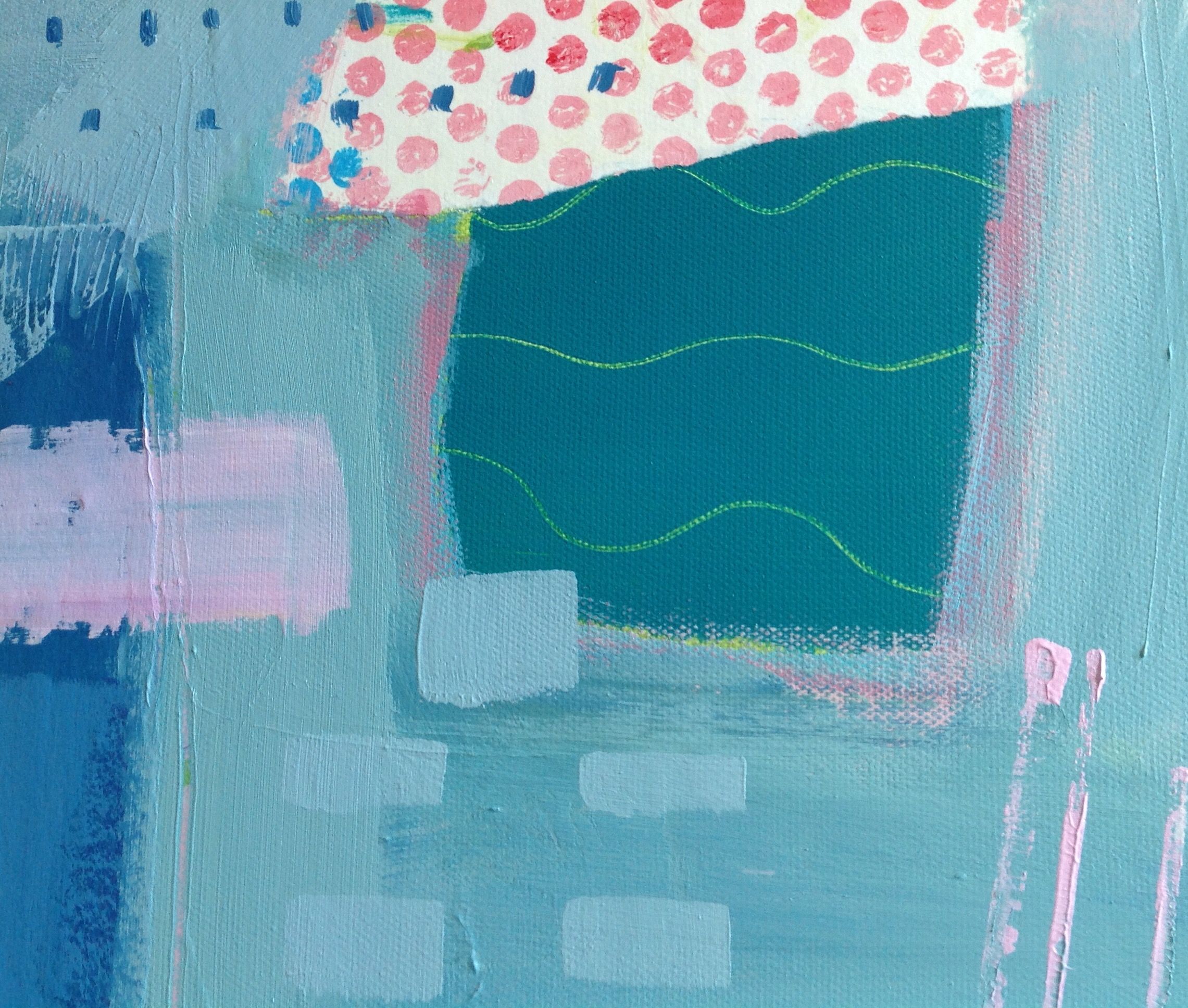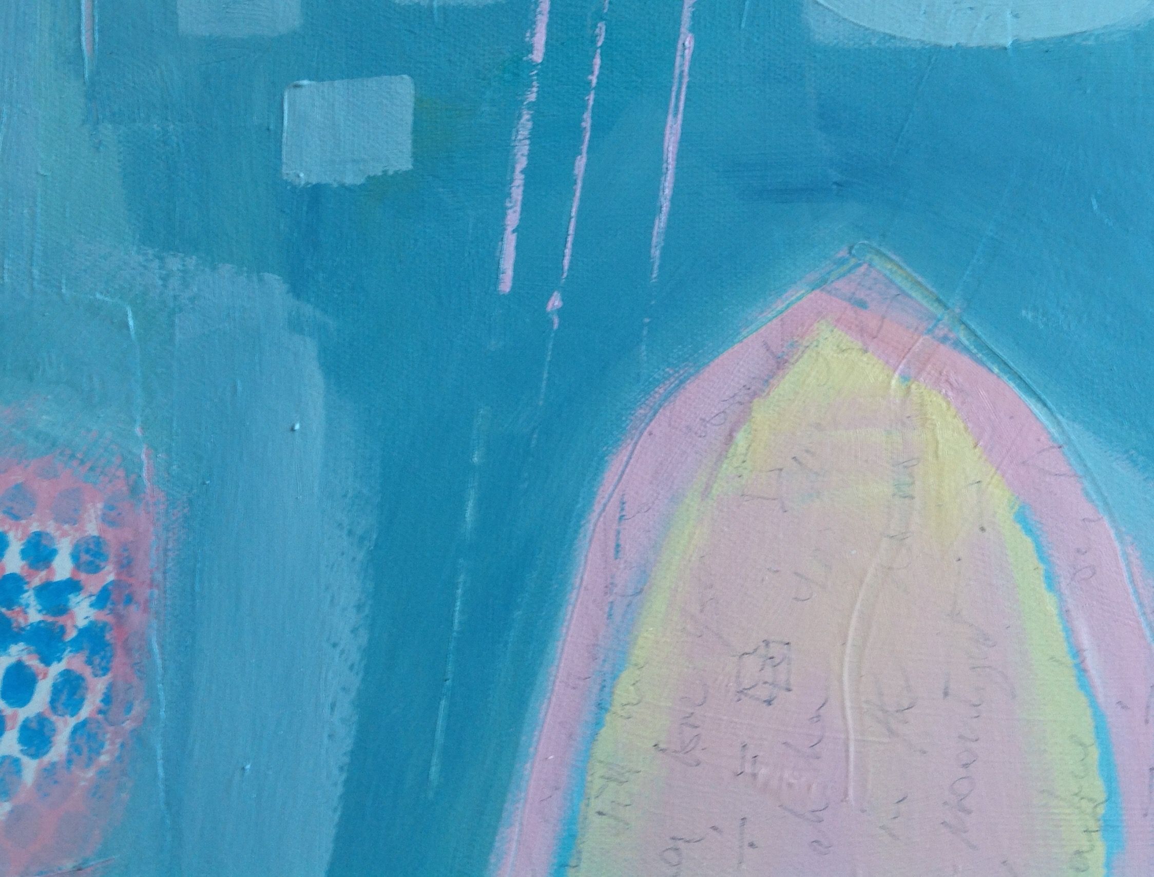 The colour palette for this work was inspired by a Devon sunset. The dark blues of the sky and the underlighting of the pink clouds. The duck egg blue inspired by my Tiffany gift box, sadly not containing a Tiffany blue diamond. The works incorporates collage, printmaking and text. The overall