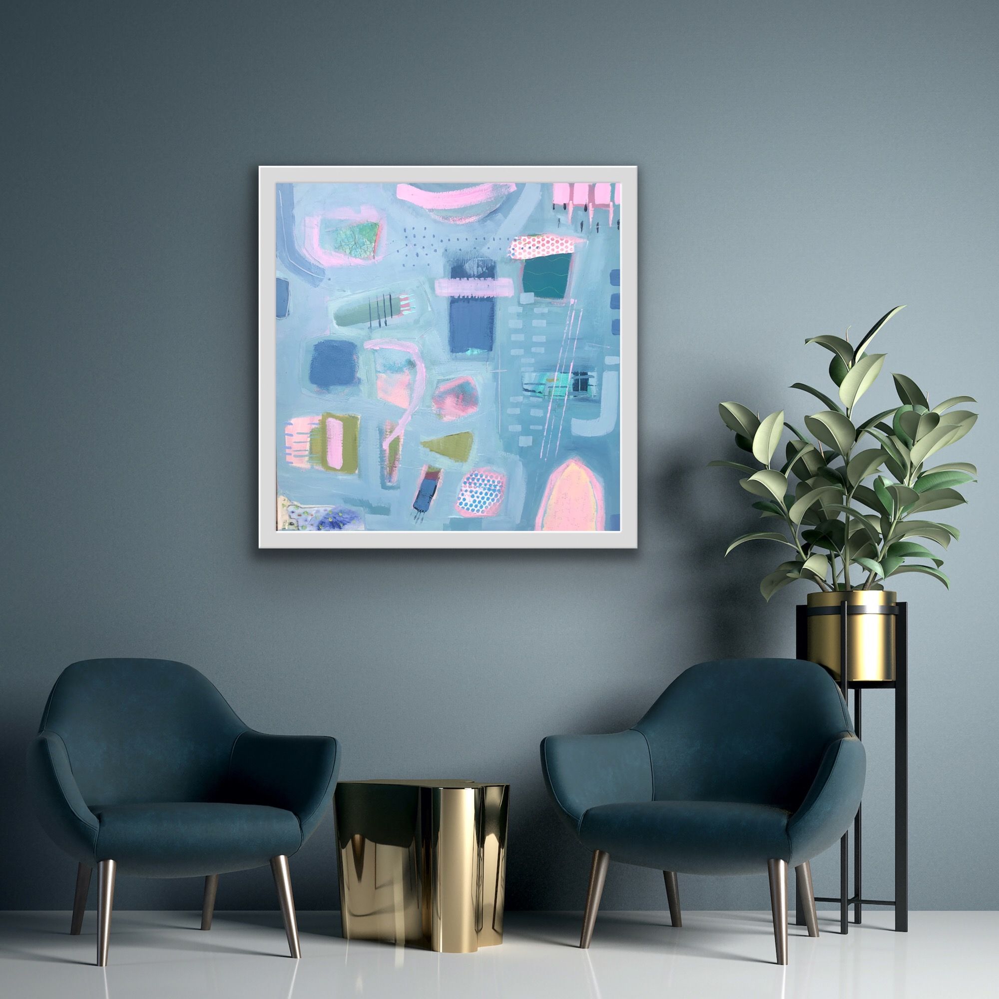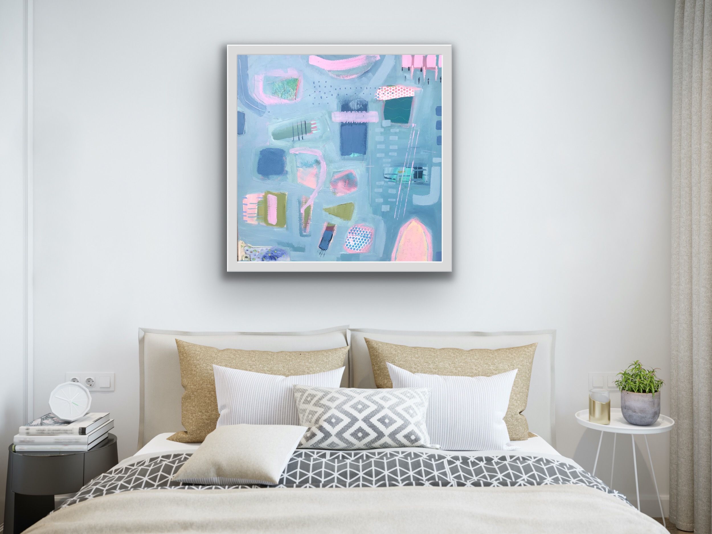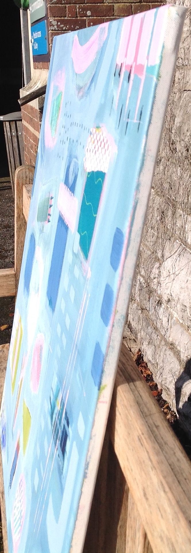 The colour palette for this work was inspired by a Devon sunset. The dark blues of the sky and the underlighting of the pink clouds. The duck egg blue inspired by my Tiffany gift box, sadly not containing a Tiffany blue diamond. The works incorporates collage, printmaking and text. The overall