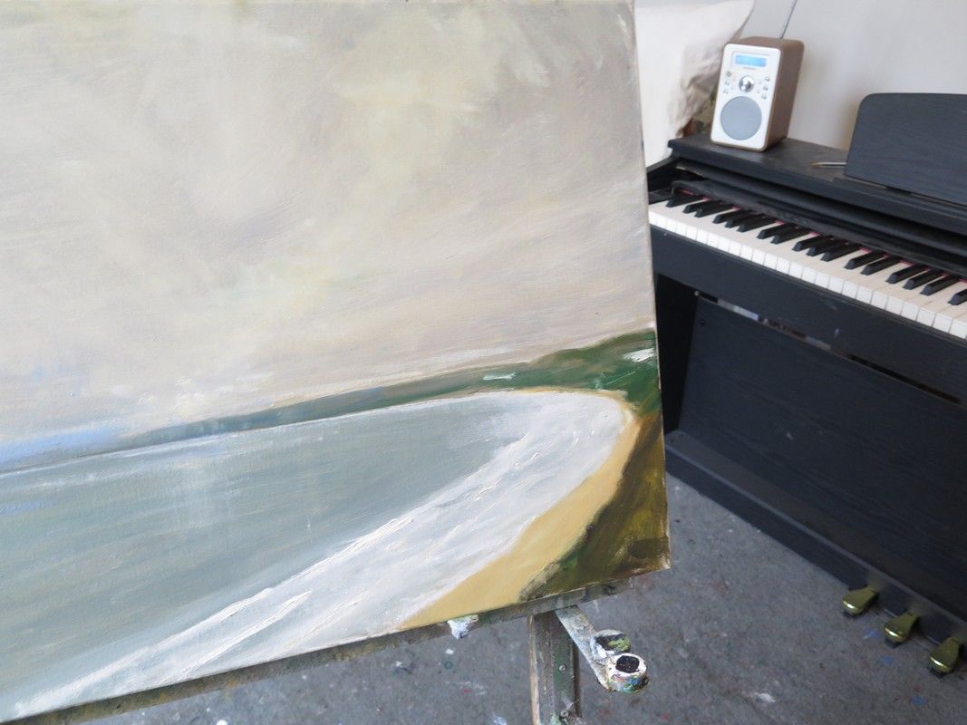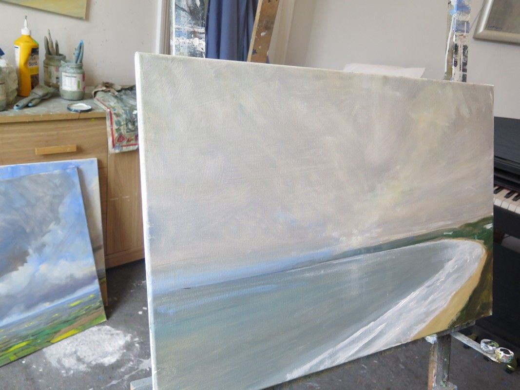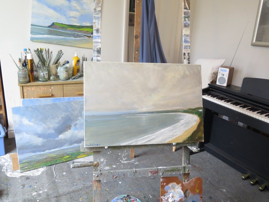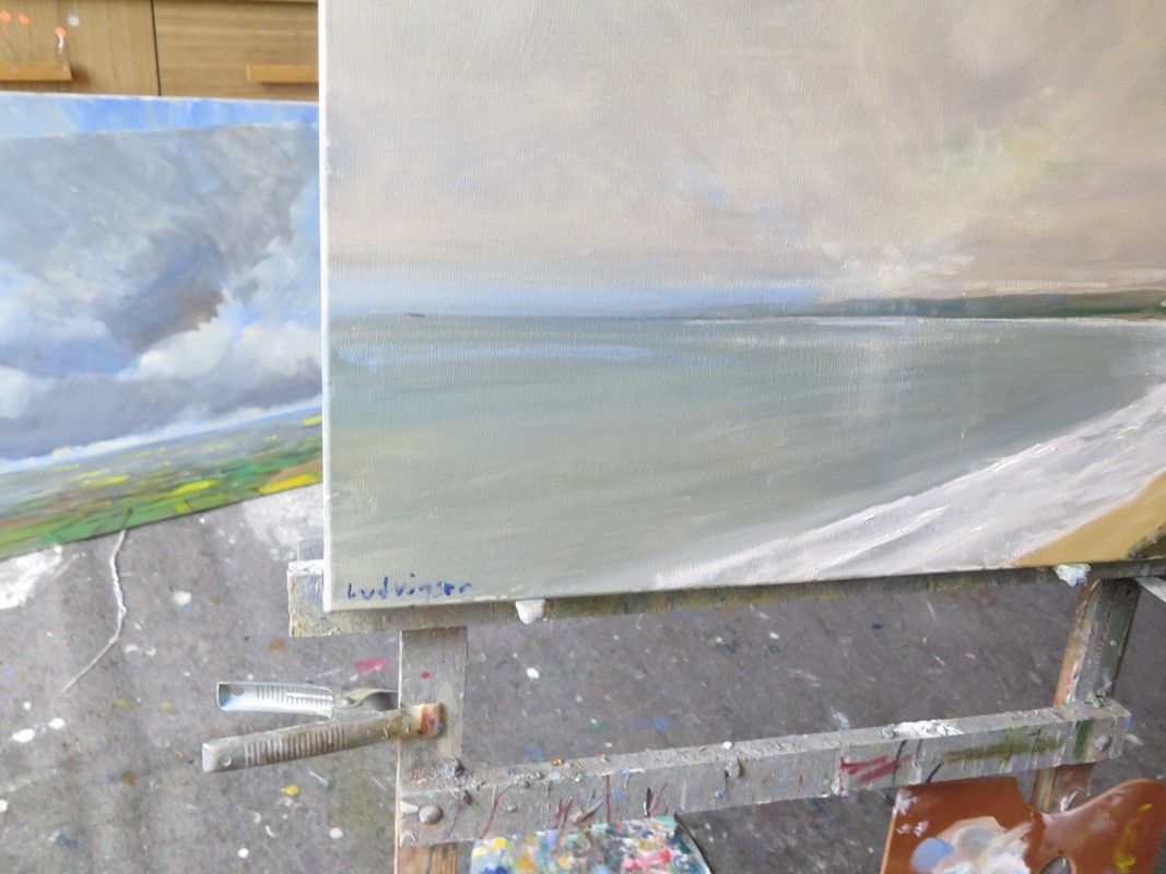THIS WORK IS NO LONGER AVAILABLE, PLEASE SEE THE ARTIST’S OTHER WORKS Filey, April 7, is an original painting by Malcom Ludvigsen. It’s a proper plein-air oil painting, painted on the spot from the clifftop at Filey looking towards Bempton Cliffs. It is unframed but painted round the edge and D-rings