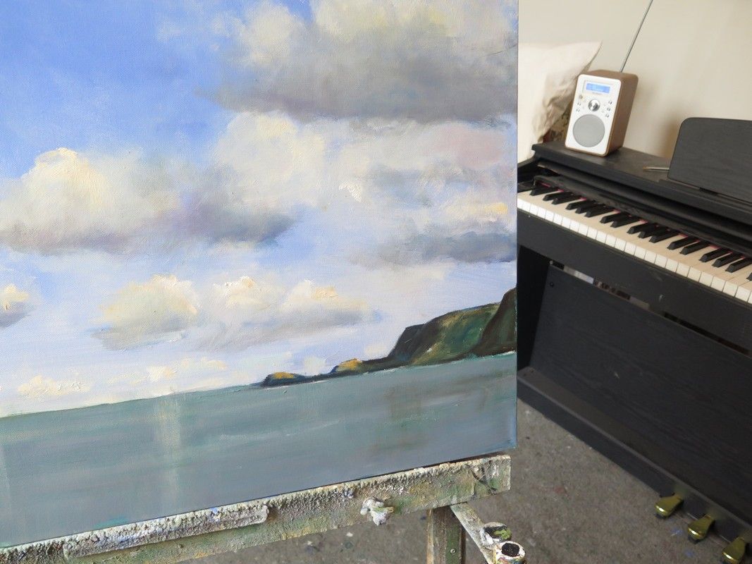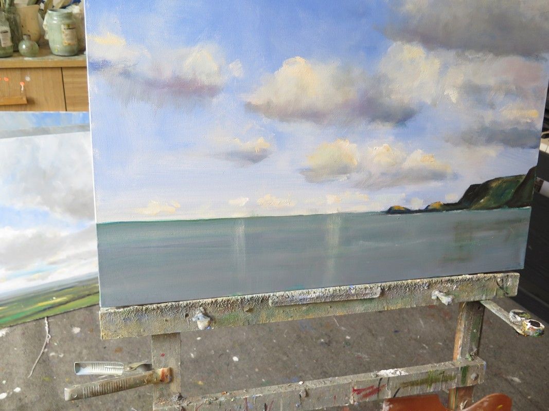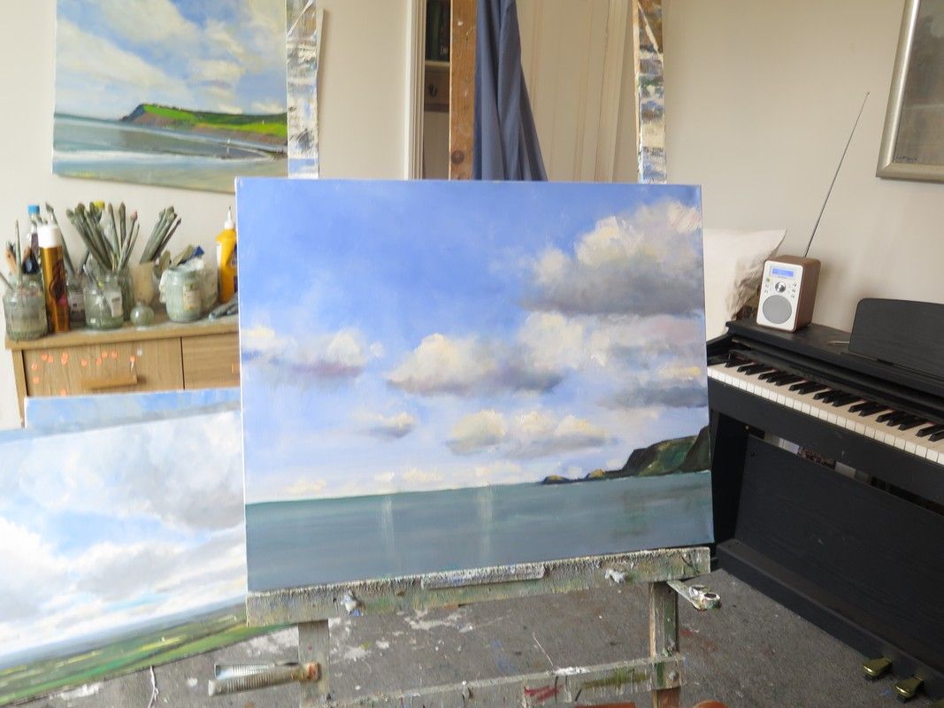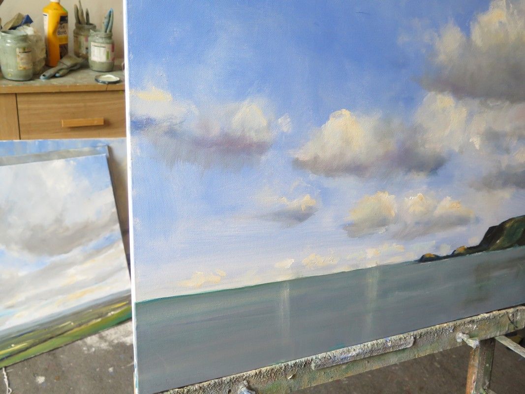 Whitby Clouds, is an original painting by Malcom Ludvigsen. It’s a proper plein-air oil painting, painted on the spot from Whitby East pier. It is unframed but painted round the edge and D-rings and chord are attached, so it is ready to hang. It'll look better in a proper frame,
