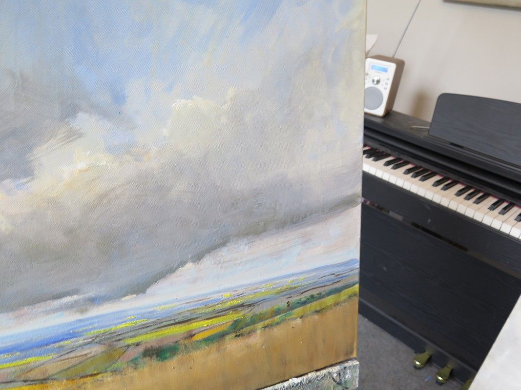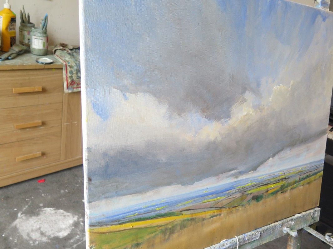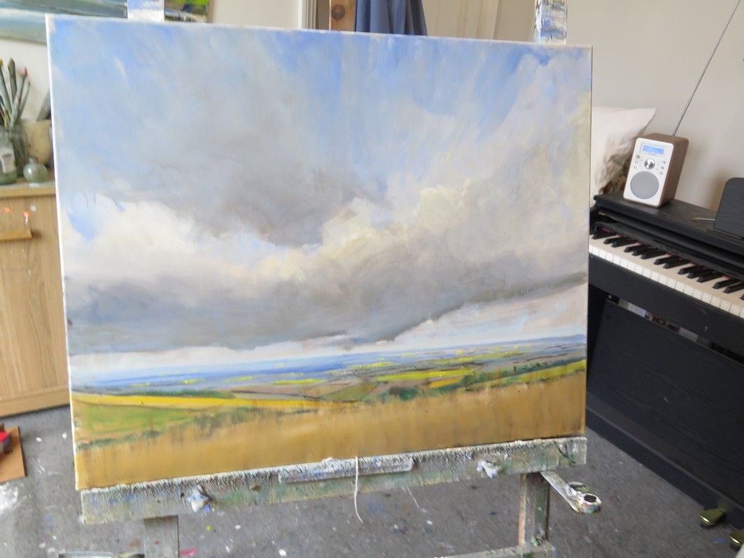 Wolds, July12, is an original painting by Malcom Ludvigsen. It’s a proper plein-air oil painting, painted on the spot from near Sledmere in the Yorkshire Wolds. It is unframed but painted round the edge and D-rings and chord are attached, so it is ready to hang. It'll look better in