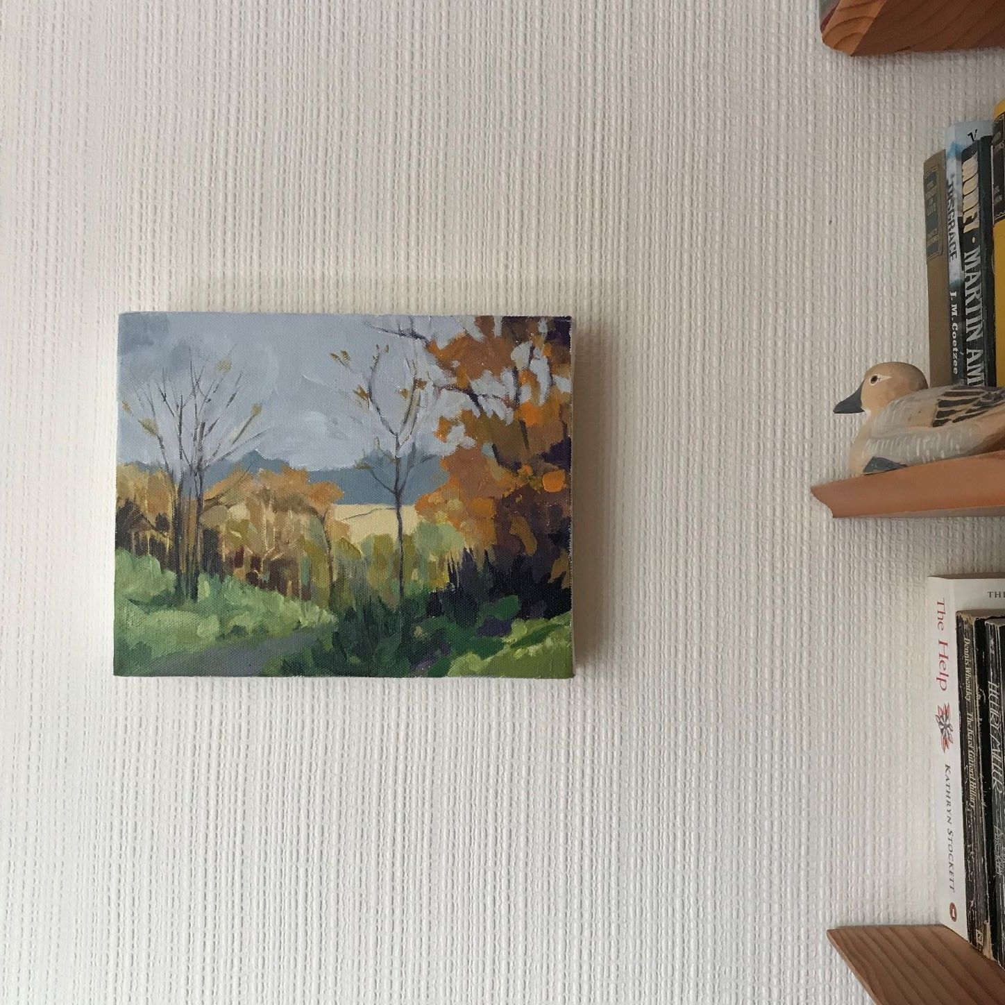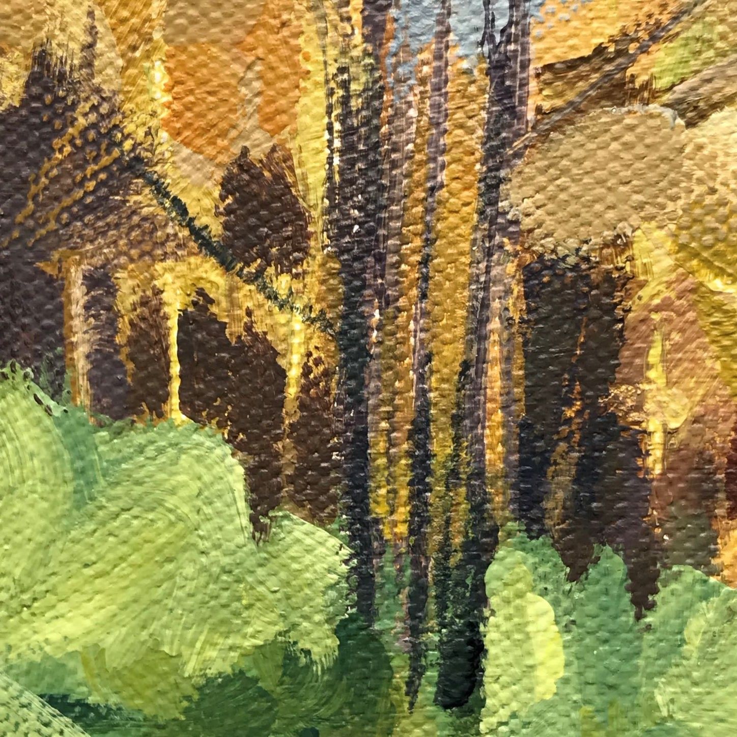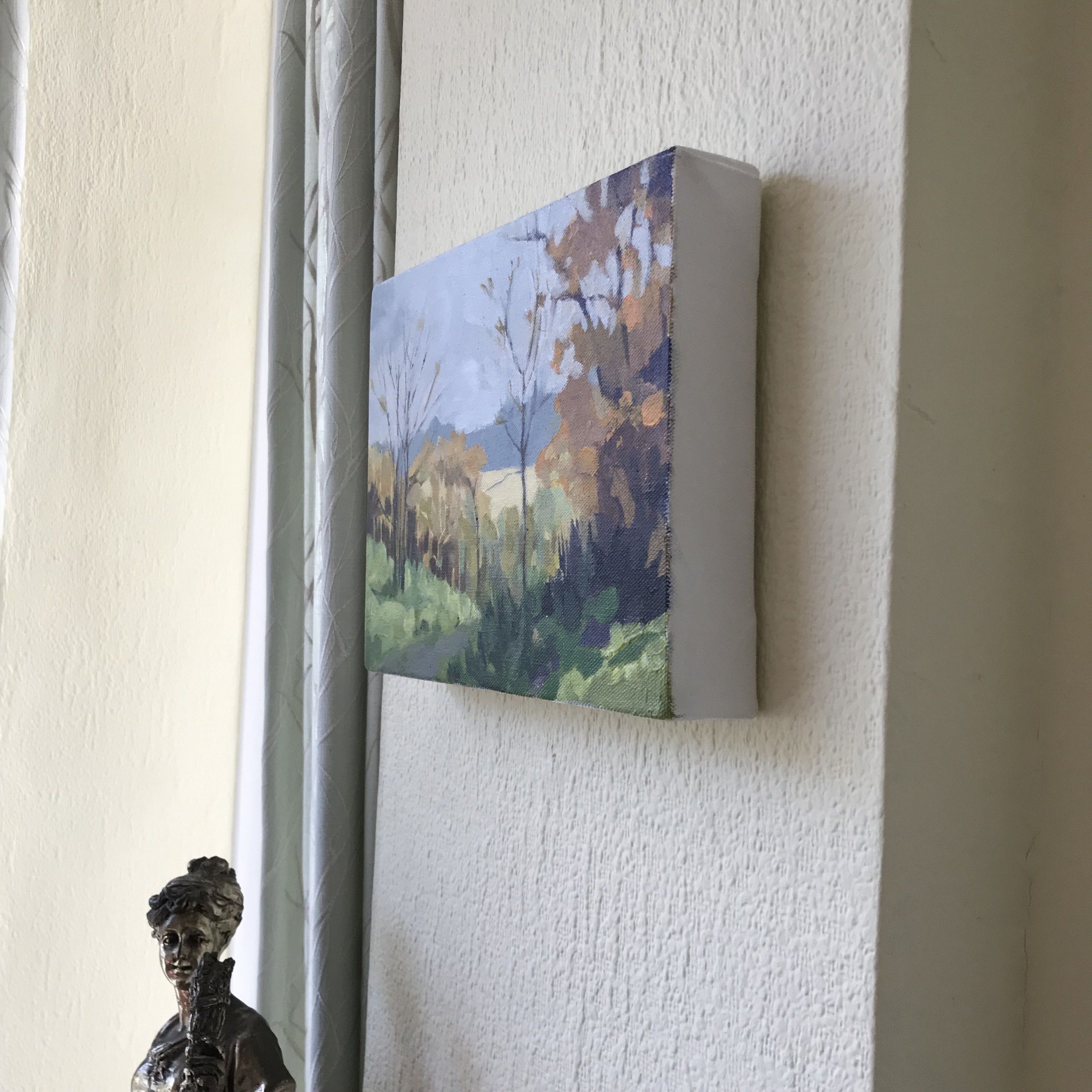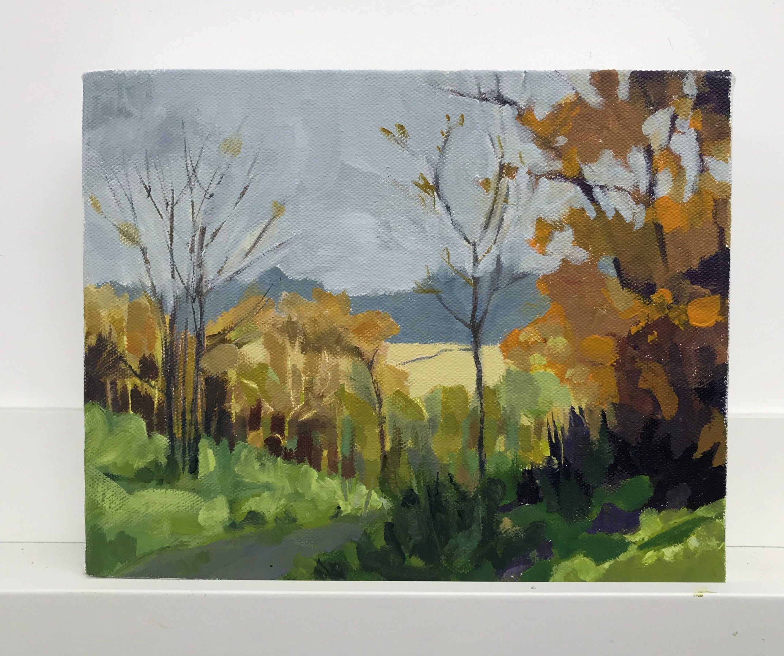 On a warm day, the glowing colours of Autumn are shown in large brushstrokes of acrylic paint. Echoing our life during the pandemic, the path goes on down the hill, but will we be able to reach the bright fields beyond?