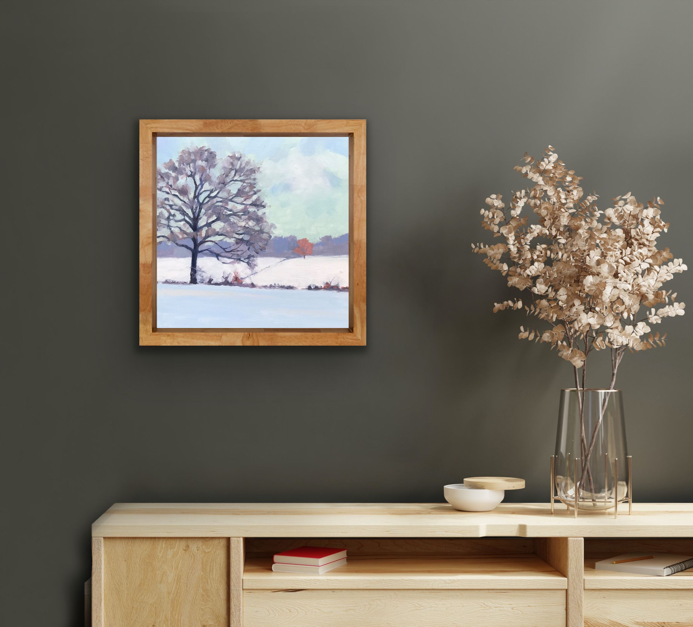 It is a calm, bright day in the countryside, where the snow lies thick in the fields, lit by the midday sun. A lone red tree stands out against the cool hues of the other trees and hedges, which are shown in subtle colours and loose brushstrokes.