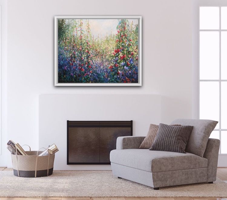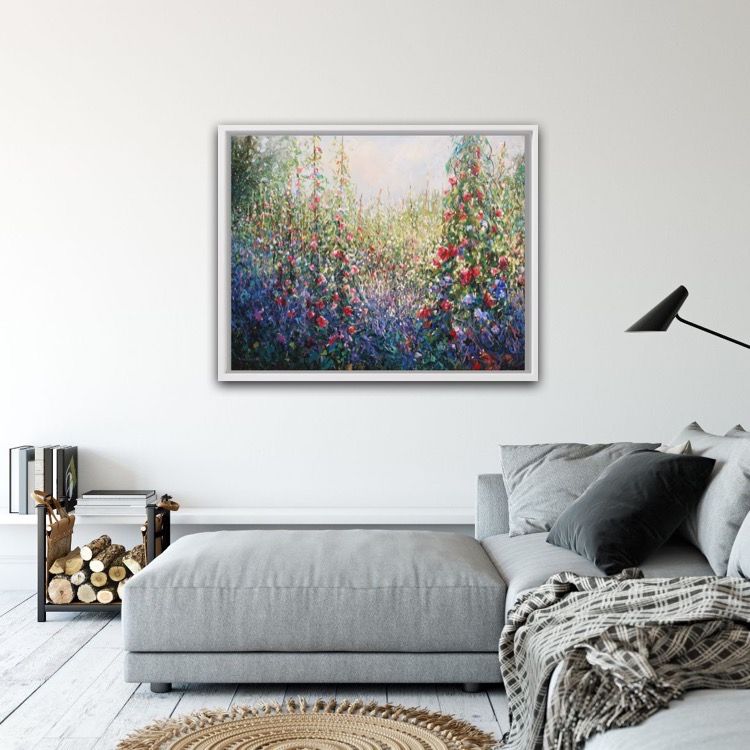Mariusz Kaldowski Cottage Garden Impressionist Landscape Painting Acrylic Paint on Canvas Canvas Size: H 80cm x W 100cm x D 2cm Sold Unframed Ready to Hang Please note that in situ images are purely an indication of how a piece may look. Cottage Garden is an original painting by Mariusz Kaldowski. An impressionistic beautiful depiction of sweet pea