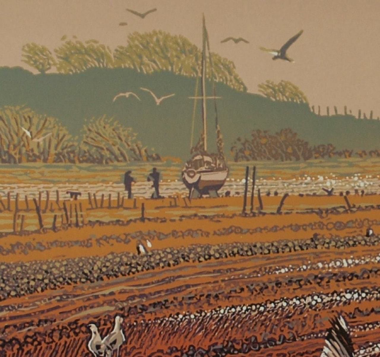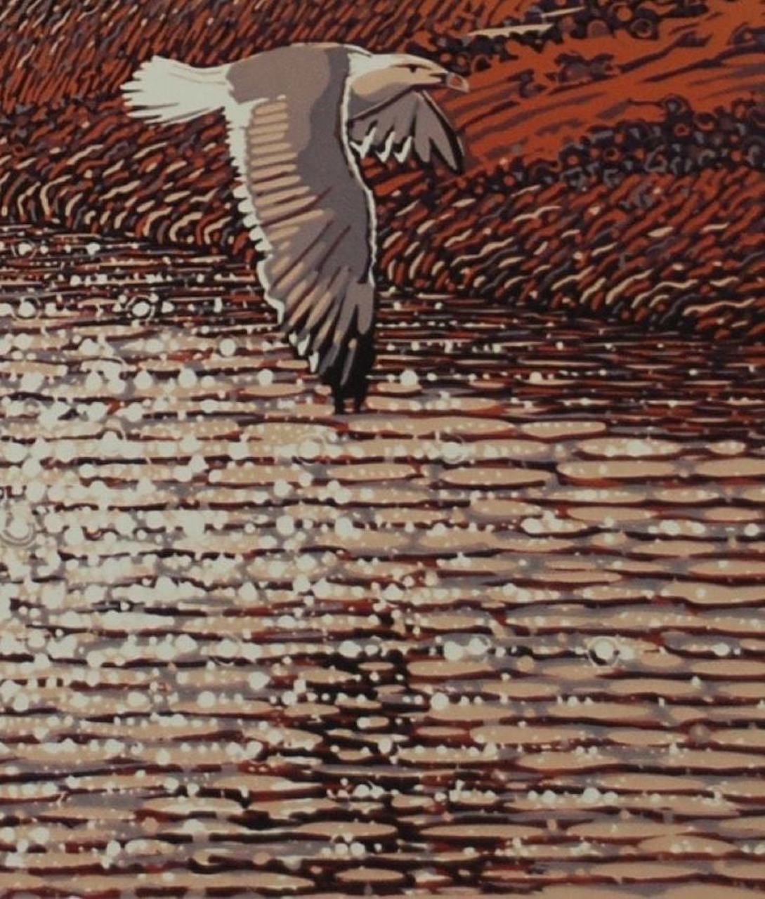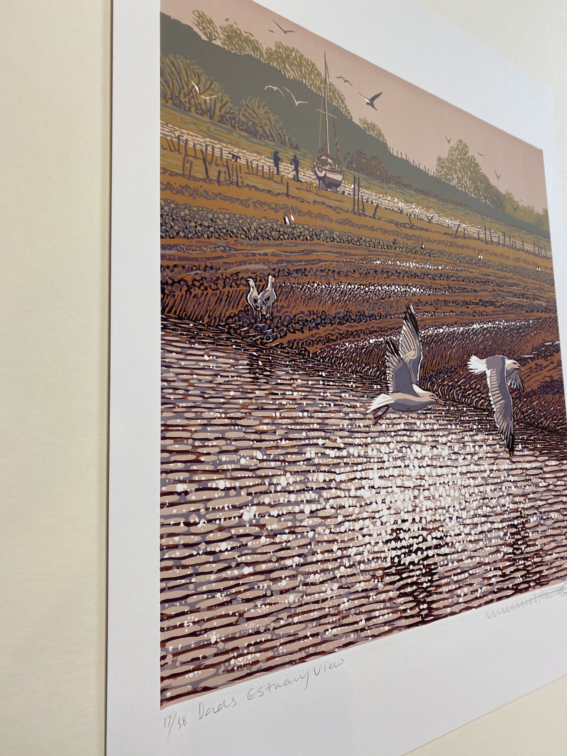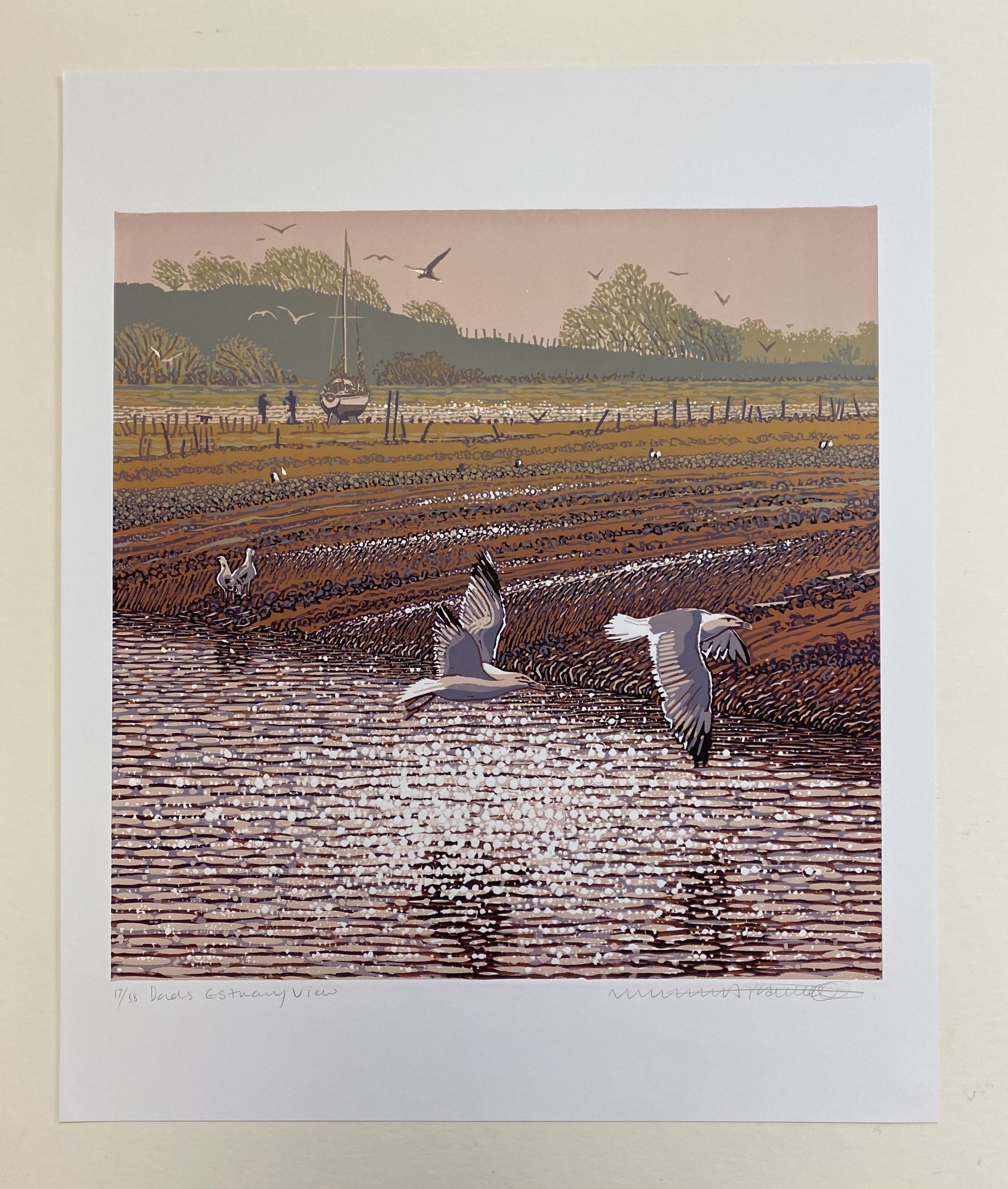 Mark A Pearce Dad's Estuary View Limited Edition Reduction Linocut Edition of 58 Image Size: H 44cm x W 44cm Paper Size: H 60.5cm x W 50cm x D 0.1cm Sold Unframed Please note that in situ images are purely an indication of how a piece may look. Dad's Estuary View is a limited edition print by