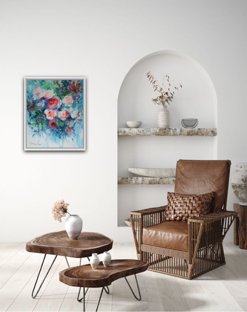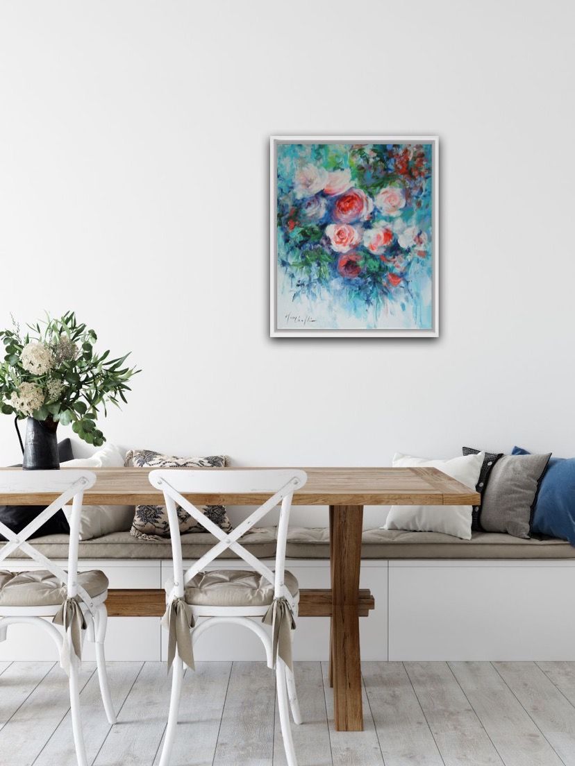 Mary Chaplin A Taste of June Original Impressionistic Floral Painting Acrylic on Canvas Canvas Size: H 55cm x W 46cm x D 2cm Sold Unframed Ready to Hang Please note that insitu images are purely an indication of how a piece may look. A taste of June by Mary Chaplin , impressionistic floral painting Mary Chaplin gathered in this