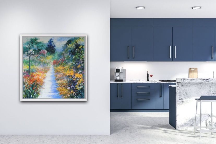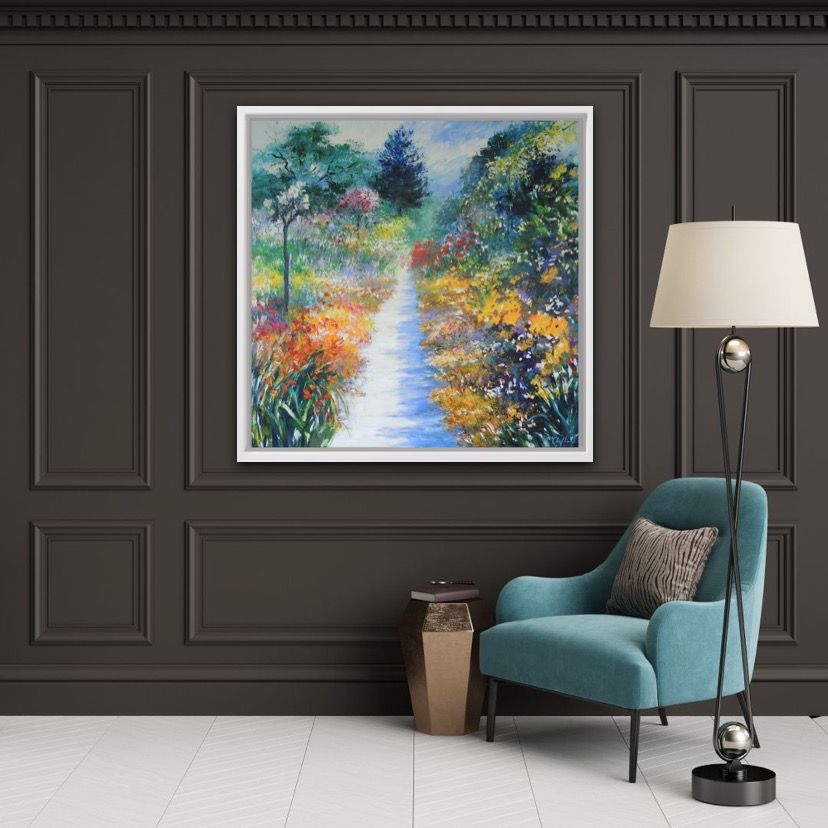 Mary Chaplin Summer promenade in Giverny Original Floral Painting Acrylic Paint on Canvas Individual Canvas Size: H 100cm x W 100cm x D 2cm Sold Unframed Ready to Hang Please note that in situ images are purely an indication of how a piece may look. The garden of Claude Monet is one of my favourite gardens that I
