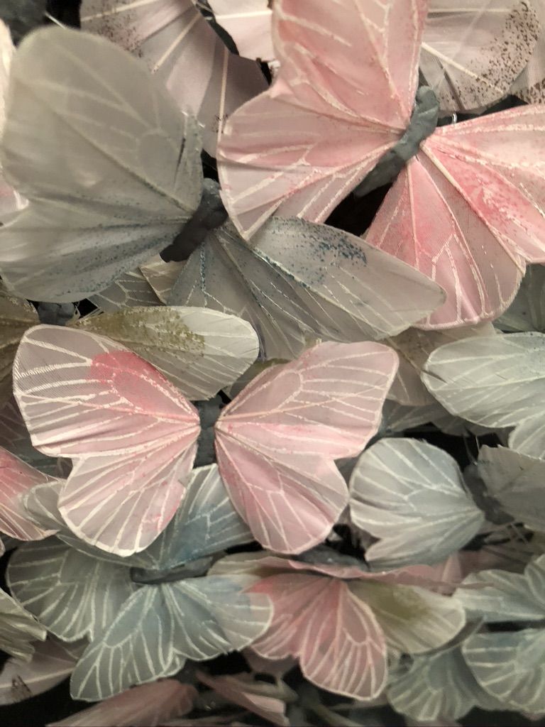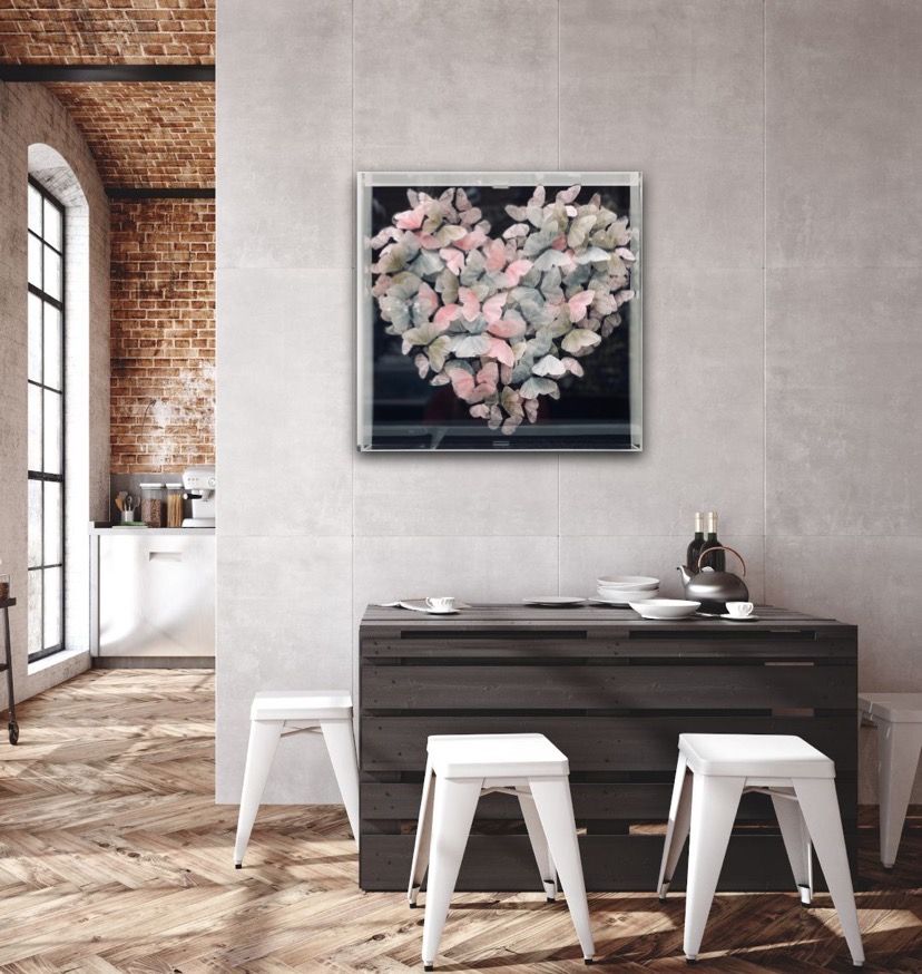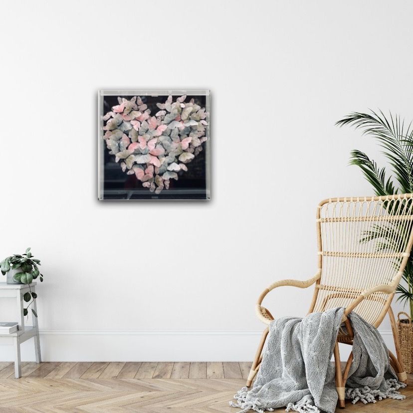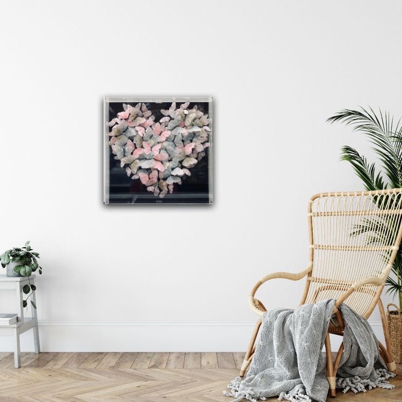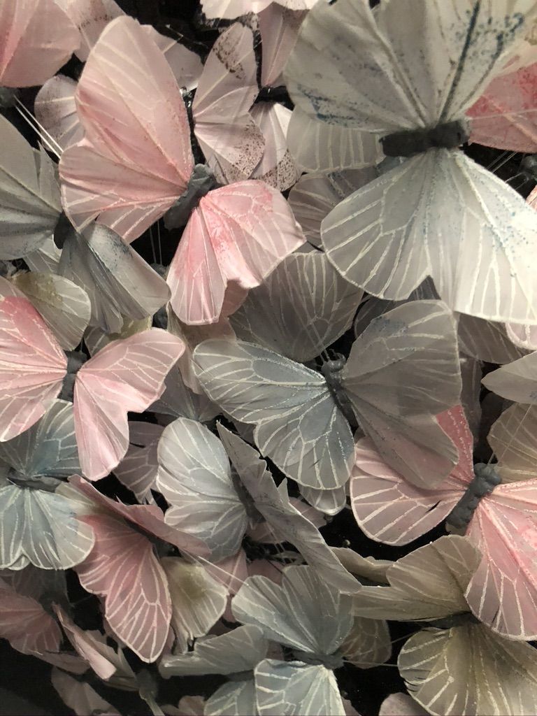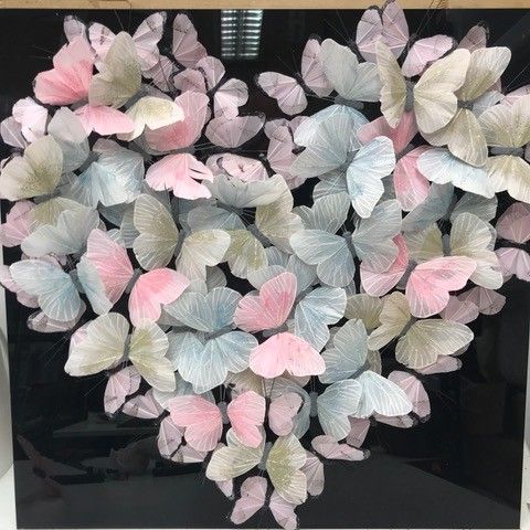 Michael Olsen Blue Veined White Original Installation Image Size: H 50cm x W 50cm x D 10cm Please note that insitu images are purely an indication of how a piece may look. Blue Veined White is an original piece by Michael Olsen. It displays a group of delicate hand embroidered butterflys arranged in a large