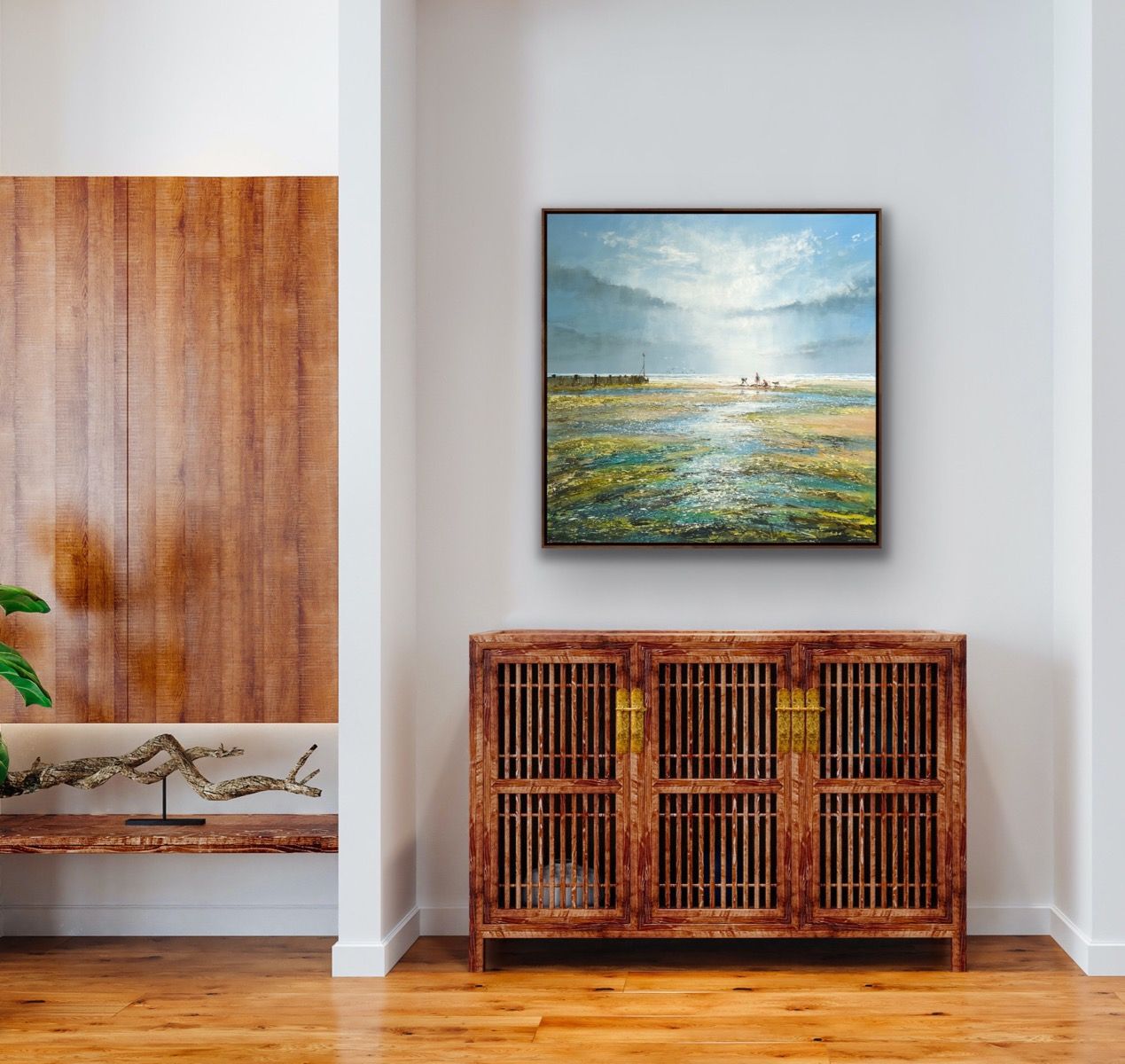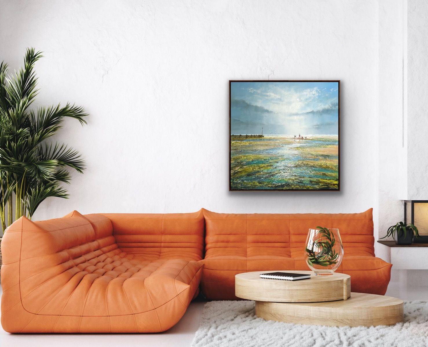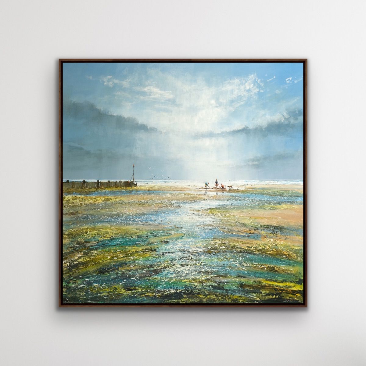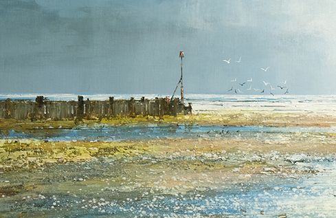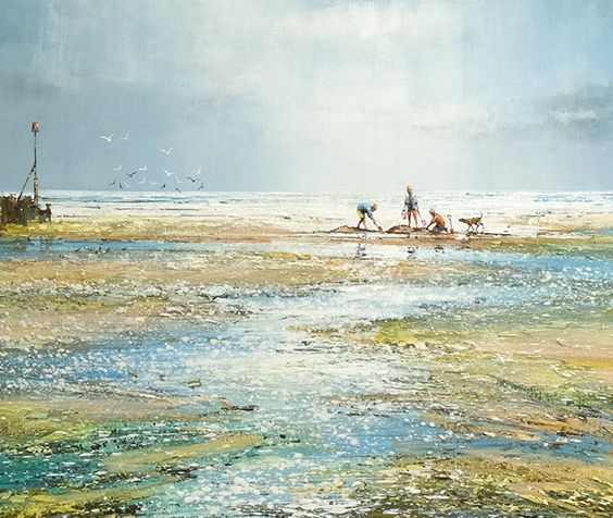 An original mixed-media painting by Michael Sanders.This painting features a beautifully atmospheric seascape with people in the distance walking along the beach. Michael paints in a style rooted in realism with some impressionist looser mark making along with a sophisticated colour palette and carefully considered compositions. 'A Great Day at