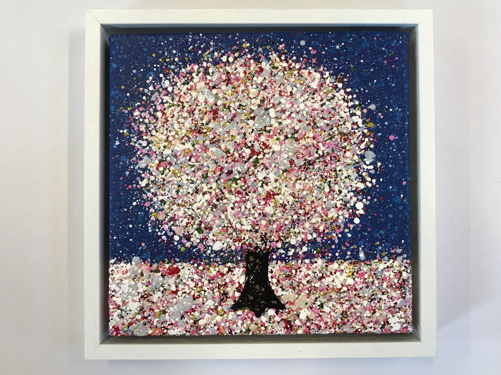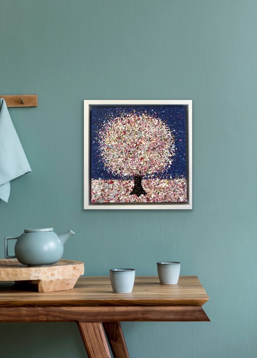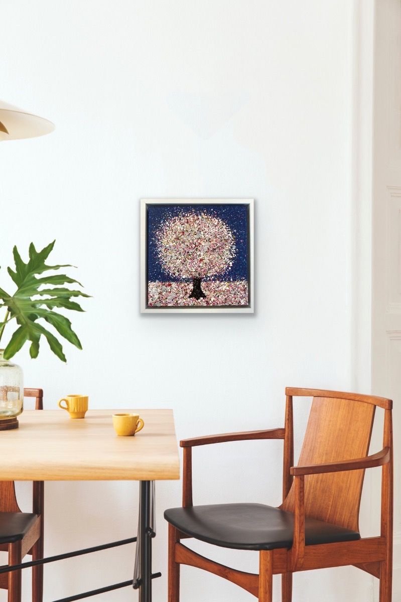 New original landscape painting by Nicky Chubb. Colourful and textured landscape painting of a tree with a shiny background. ADDITIONAL INFORMATION: signed and dated by artist on the back of the painting Acrylic on Canvas 23.2 H x 23.2 W x 4 D cm (9.13 x 9.13 x 1.57 in) Sold framed Image size: Height: 20.5cm