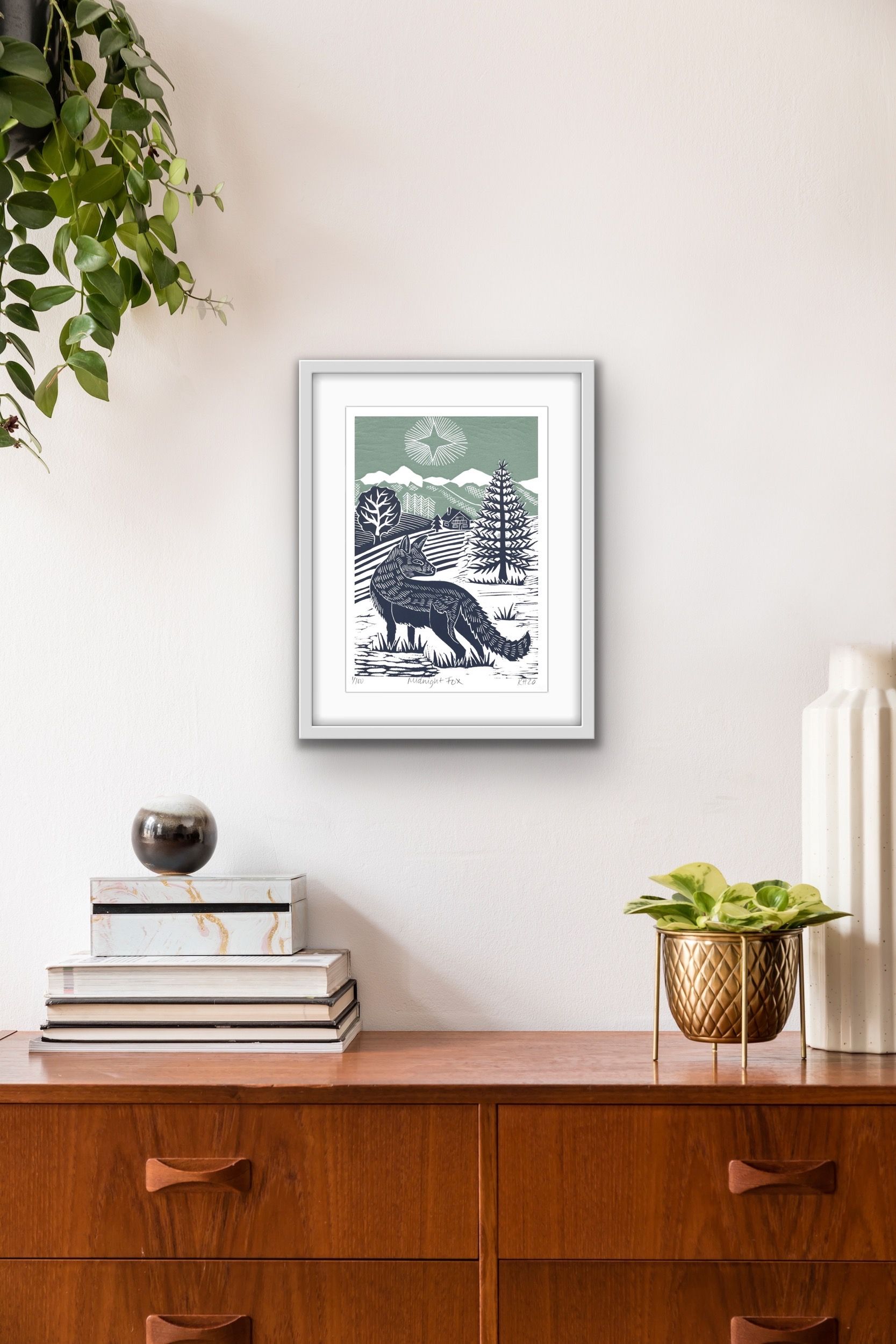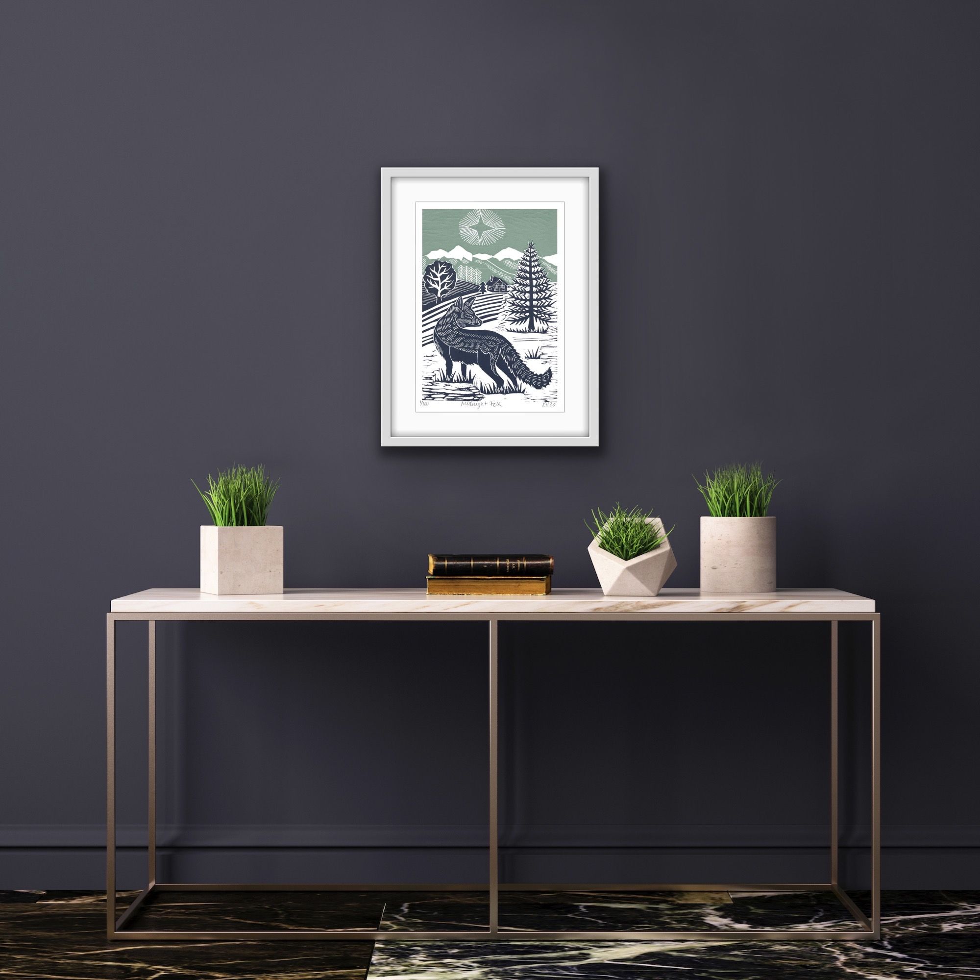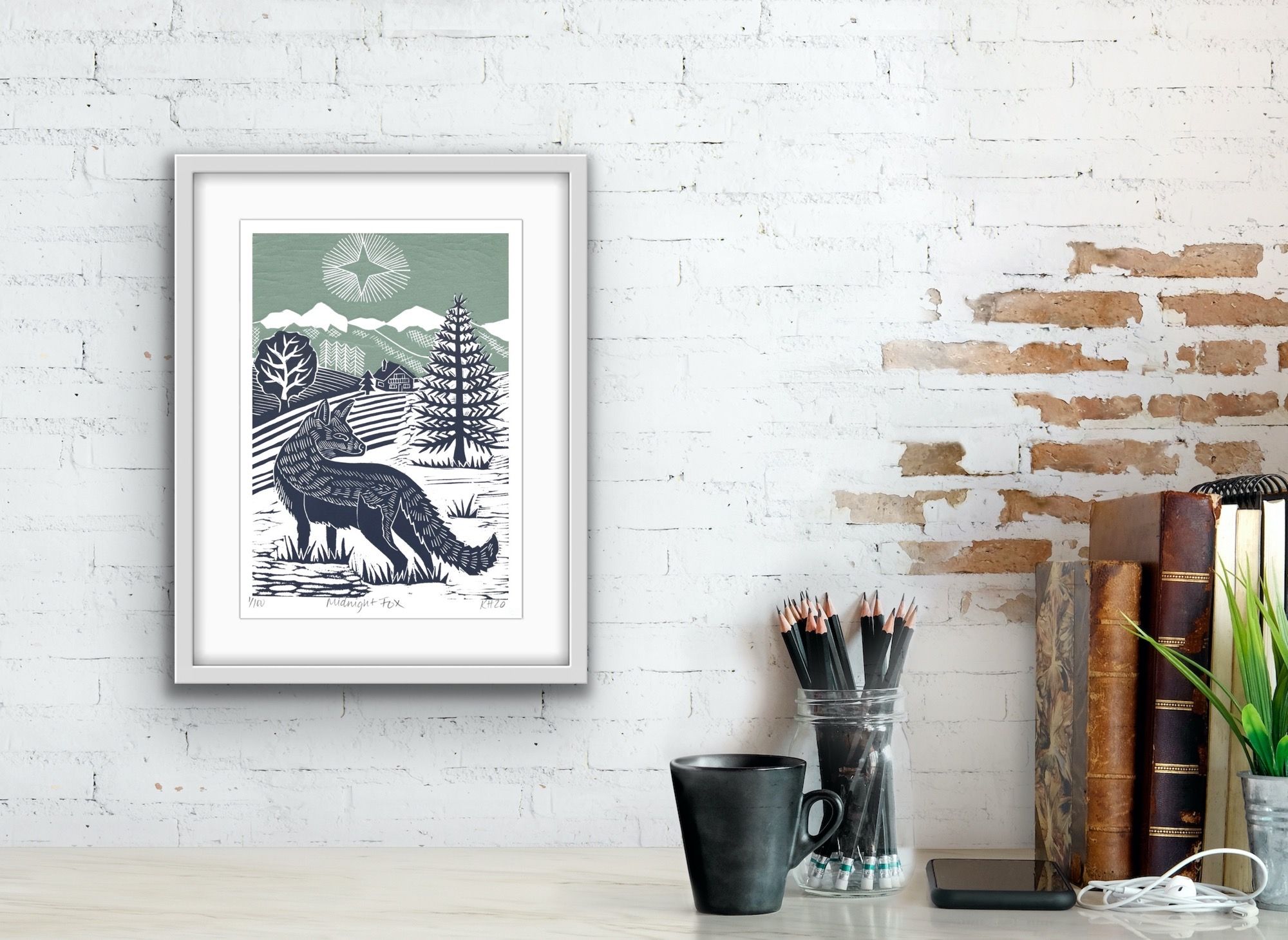 Kate Heiss Midnight Fox Limited Edition Linocut Print Edition of 100 Printed with oil based relief inks on 300gsm soft white Somerset velvet paper. Signed and dated on the front Image size 21.5 x 30cm Mounted size 30 x 40cm Sold Unframed Midnight Fox is part of my 2020 Winter range. The range is inspired by the Alpine scenery of