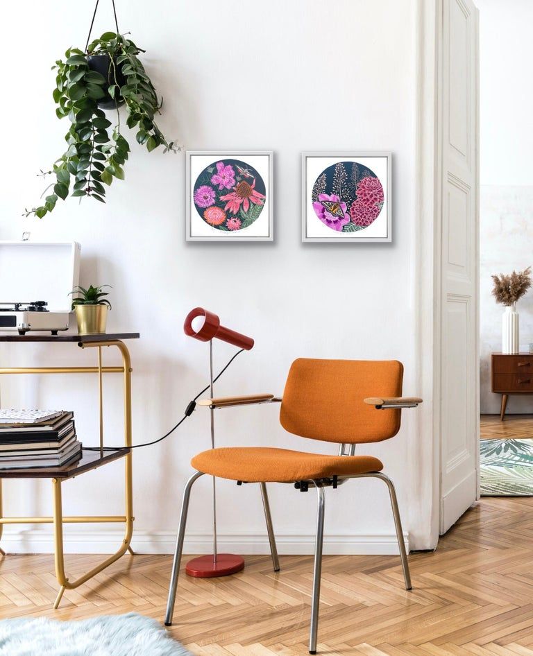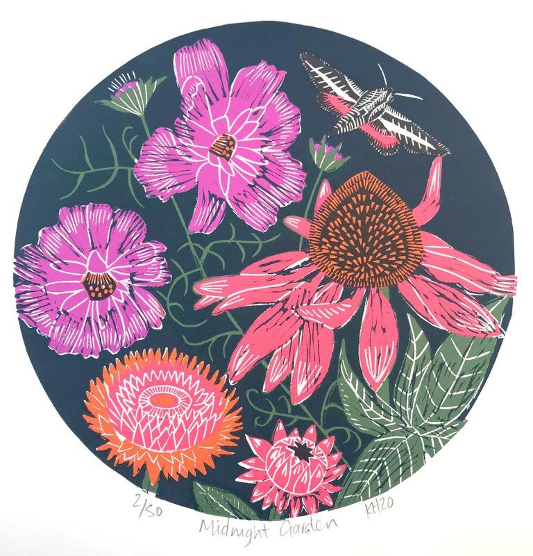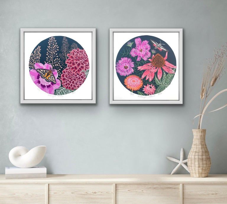 The complete unframed size of this diptych is 40cm x 80cm x 1cm Midnight Moth By Kate Heiss [2021] limited_edition Oil based inks on 300gsm Somerset Velvet paper Edition number 50 Image size: H:27 cm x W:27 cm Complete Size of Unframed Work: H:40 cm x W:40 cm x D:1cm Sold Unframed This circular garden print features a