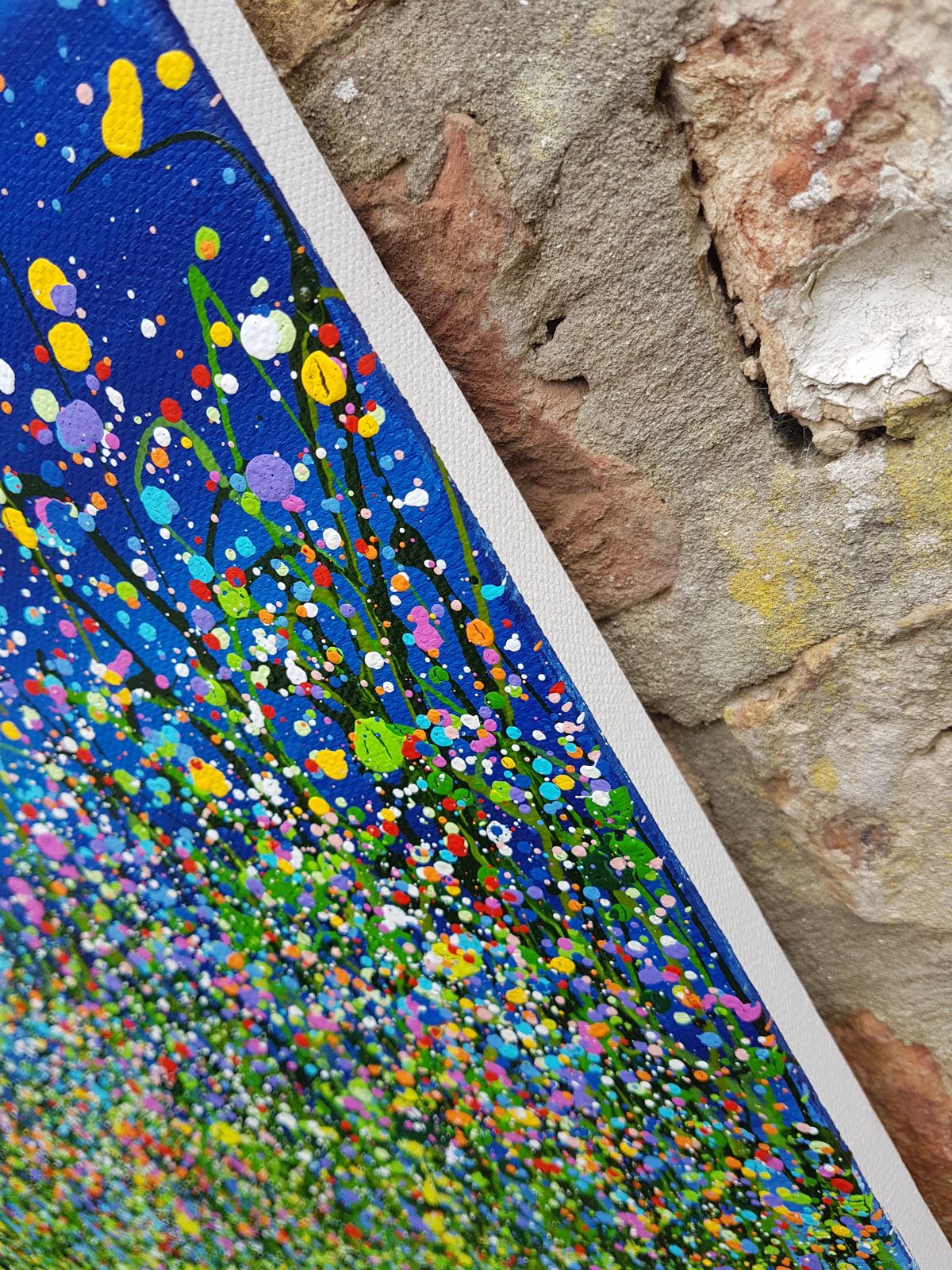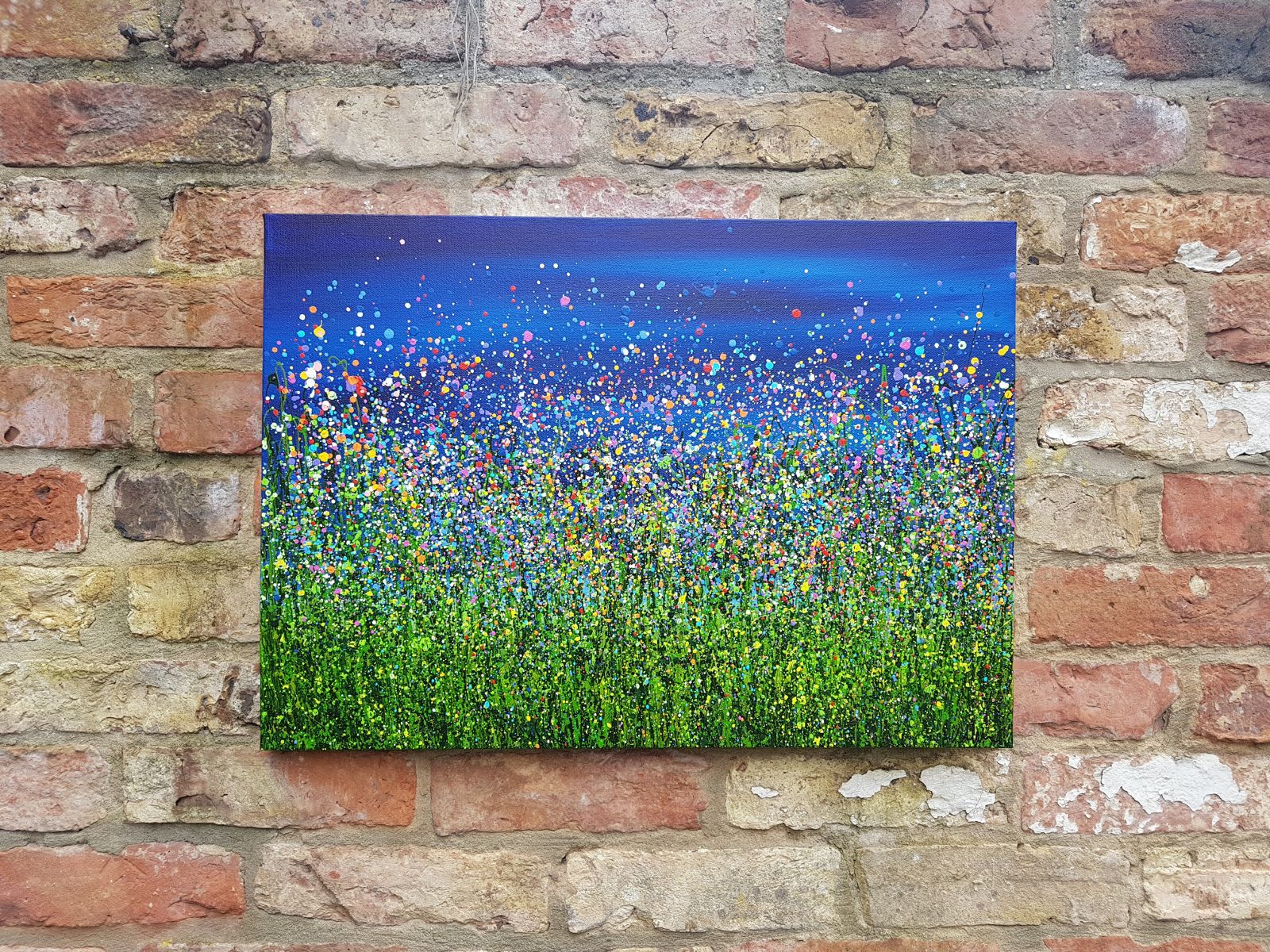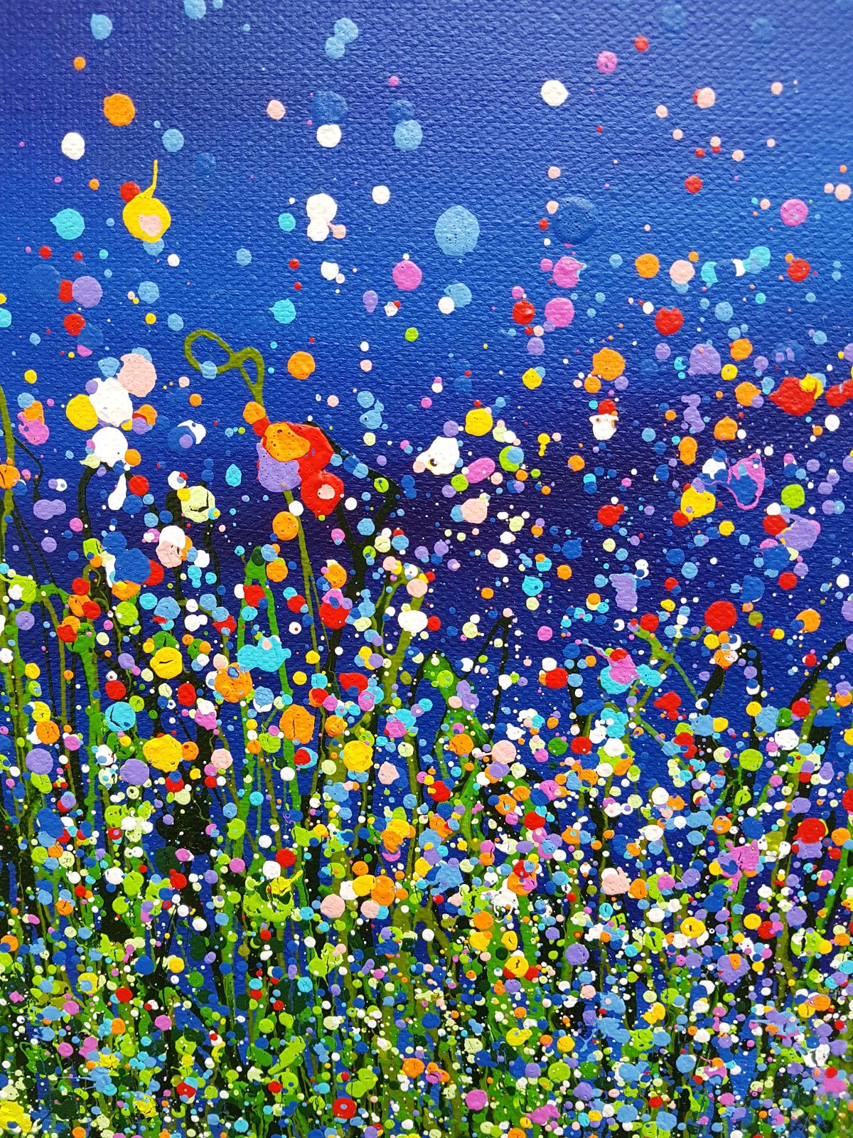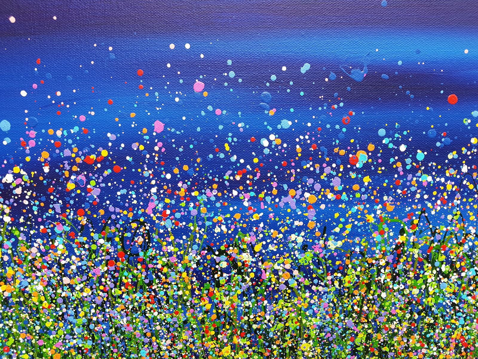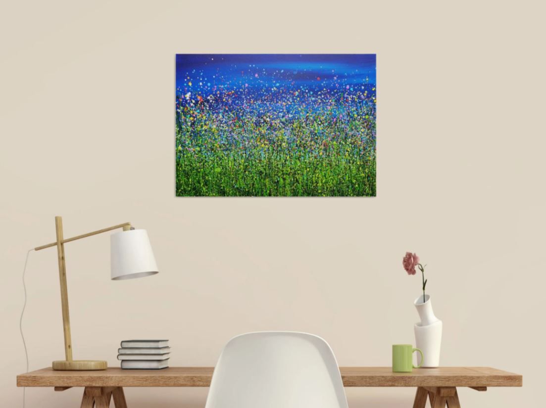 Original semi-abstract painting by Lucy Moore. Using her signature string grass technique Lucy has created a night time view of her classic meadow paintings. With an abstract twist I’ve created a vibrant statement meadow. This piece would brighten any home or office, bring a little of the outside inside. If you