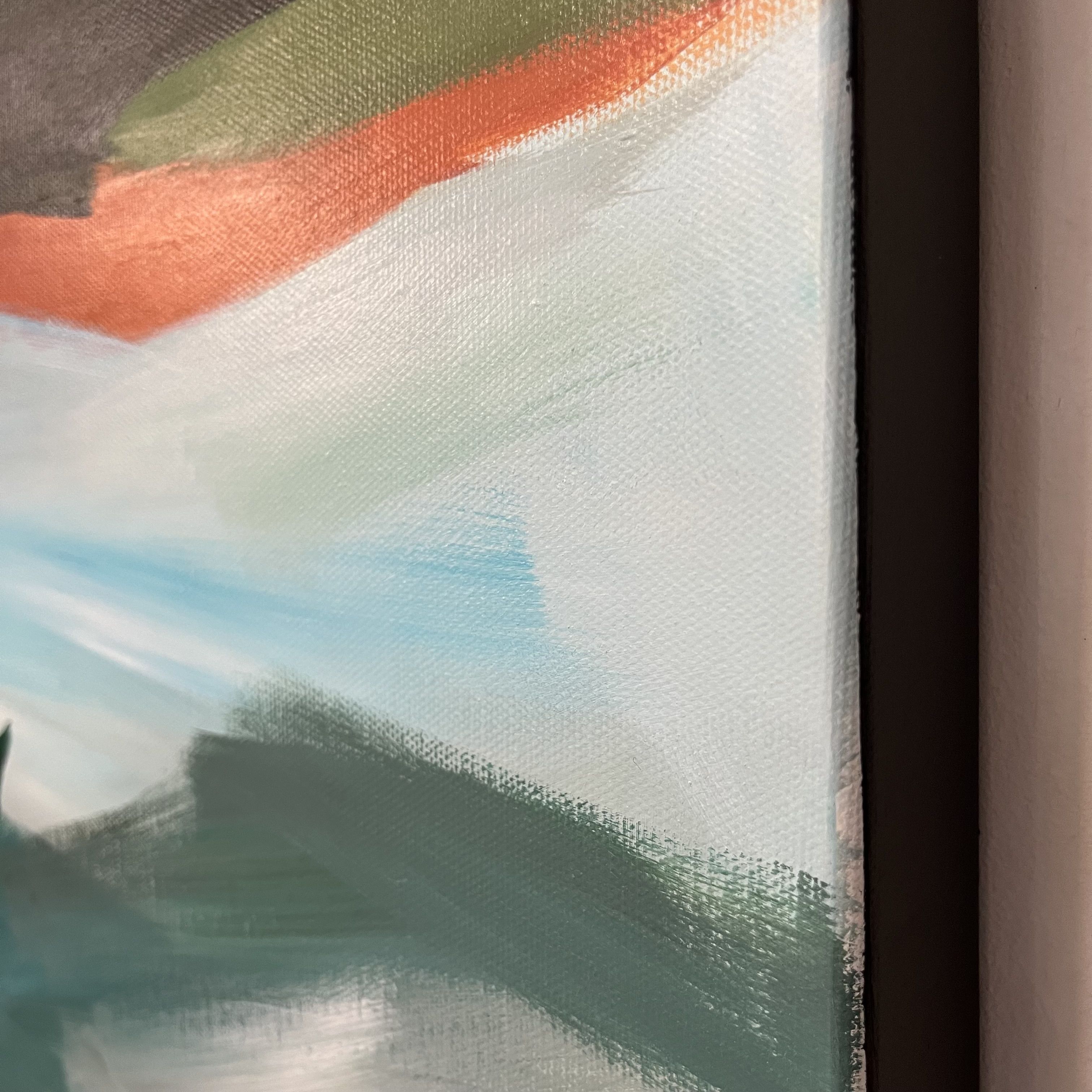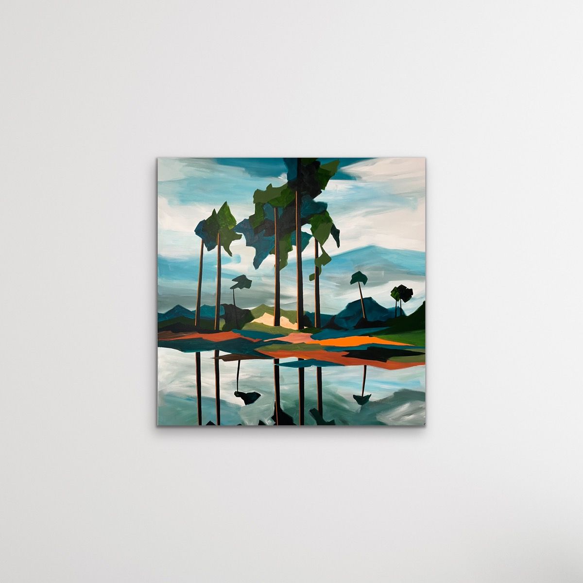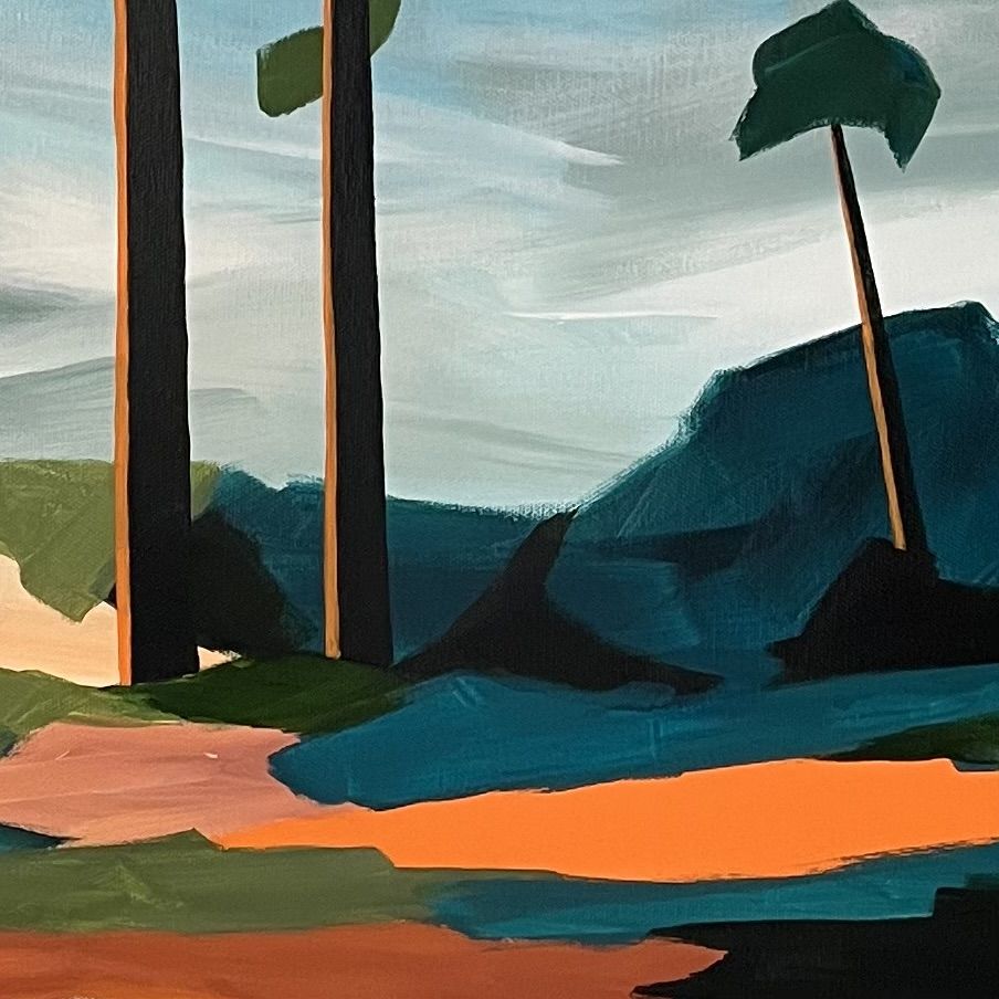 These majestic trees and their reflections were beautiful to paint. Many years ago I bought a piece of fabric with this colour palette on it and I have been waiting for the perfect painting to use it on. There is something about teal and orange that works so