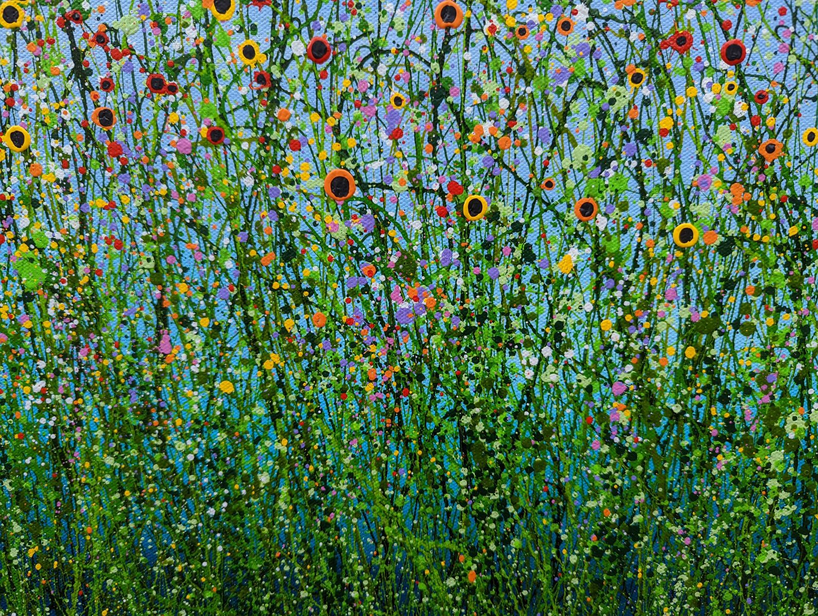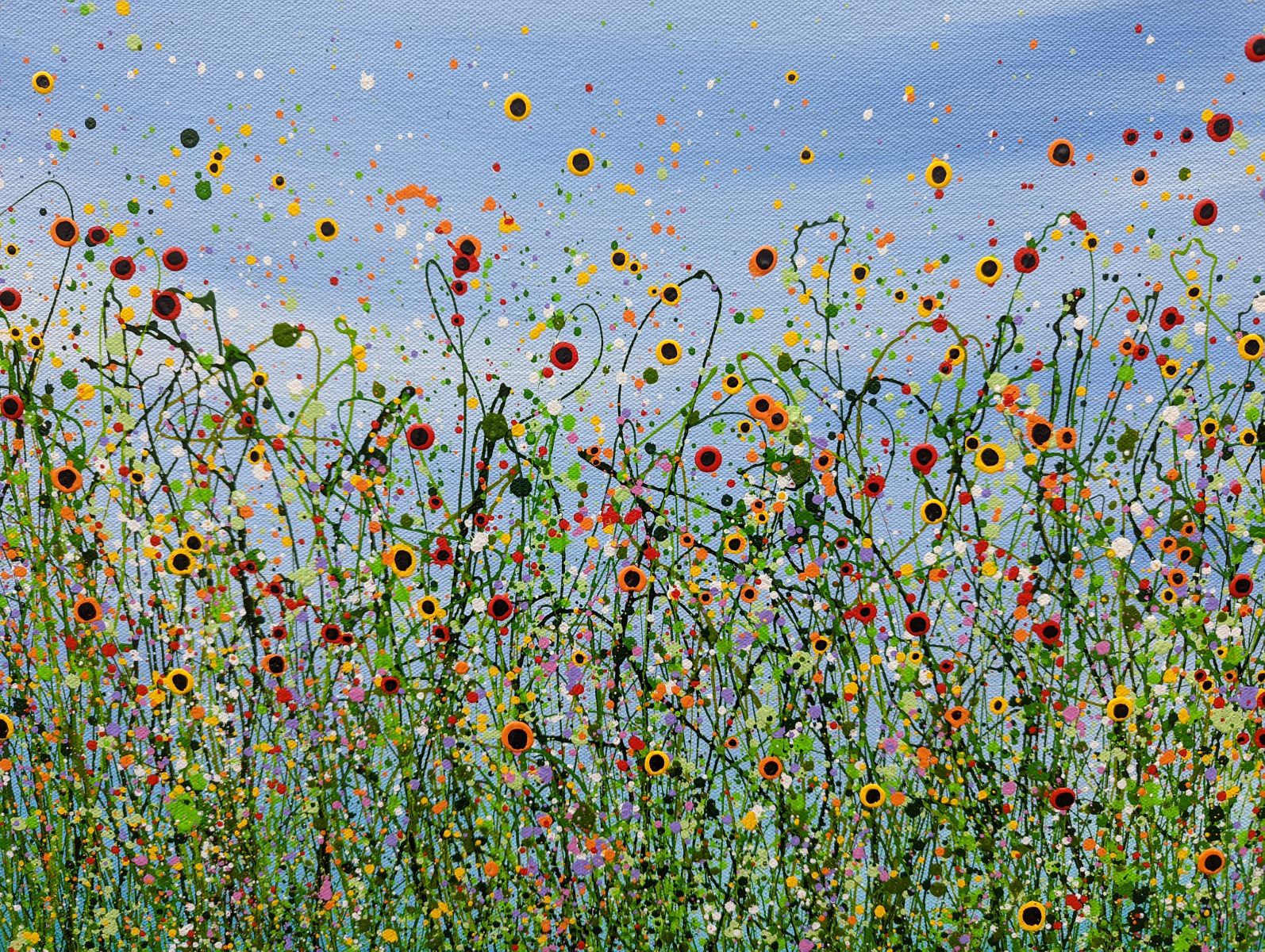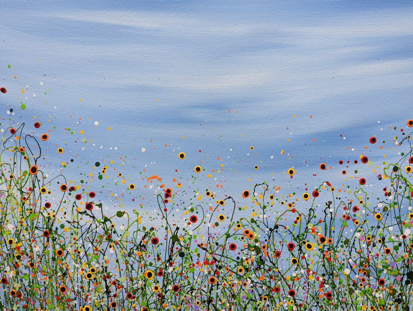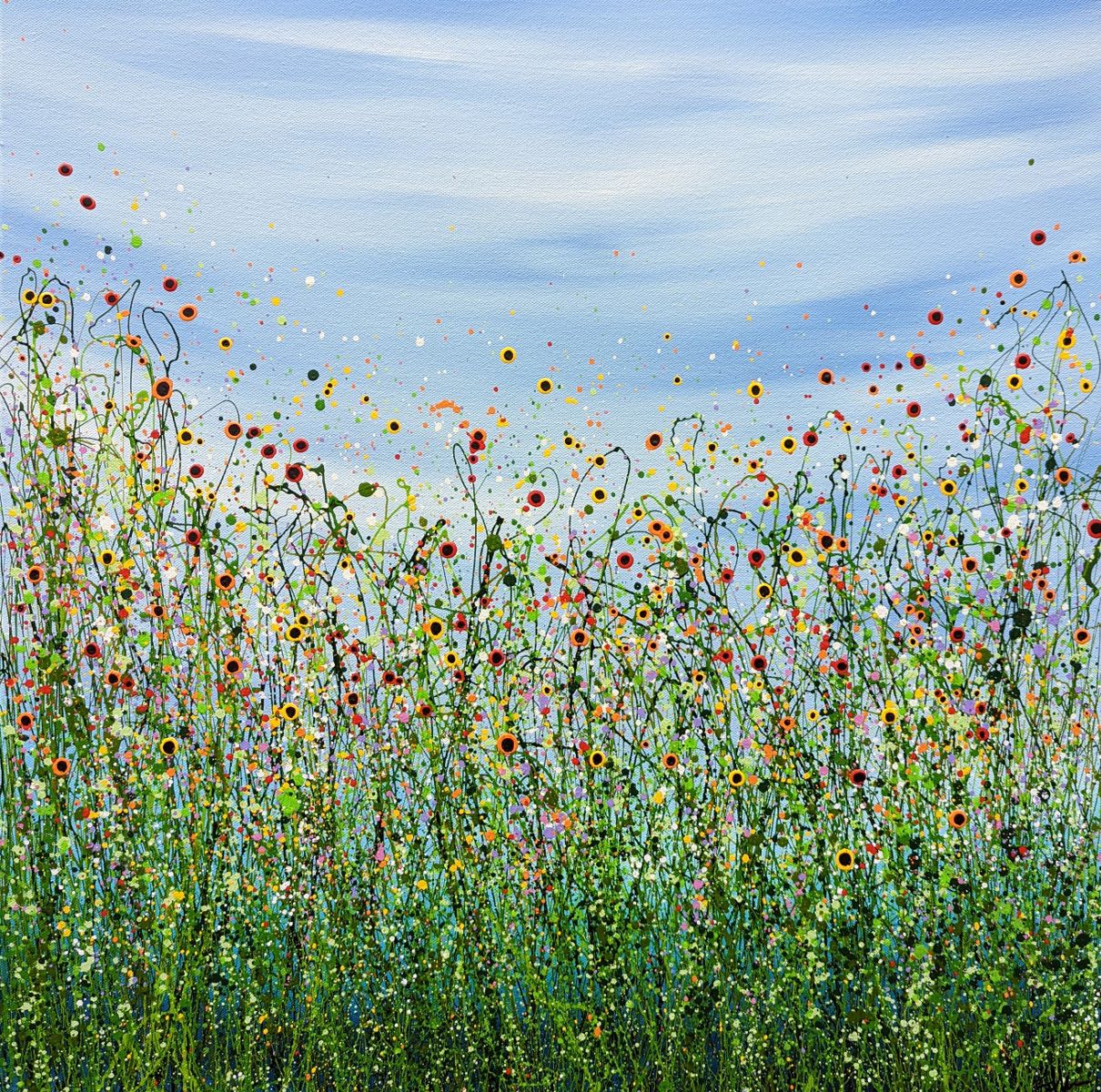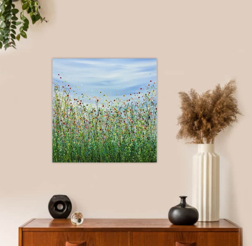 Morning Poppy Meadows #18 - An Original semi-abstract painting by Lucy Moore. Using her signature string grass technique Lucy has created a semi-abstract twist to her classic meadow paintings. Colourful poppies flowering beneath a sunlit skyline. This piece would brighten any home or office, bring a little of the outside