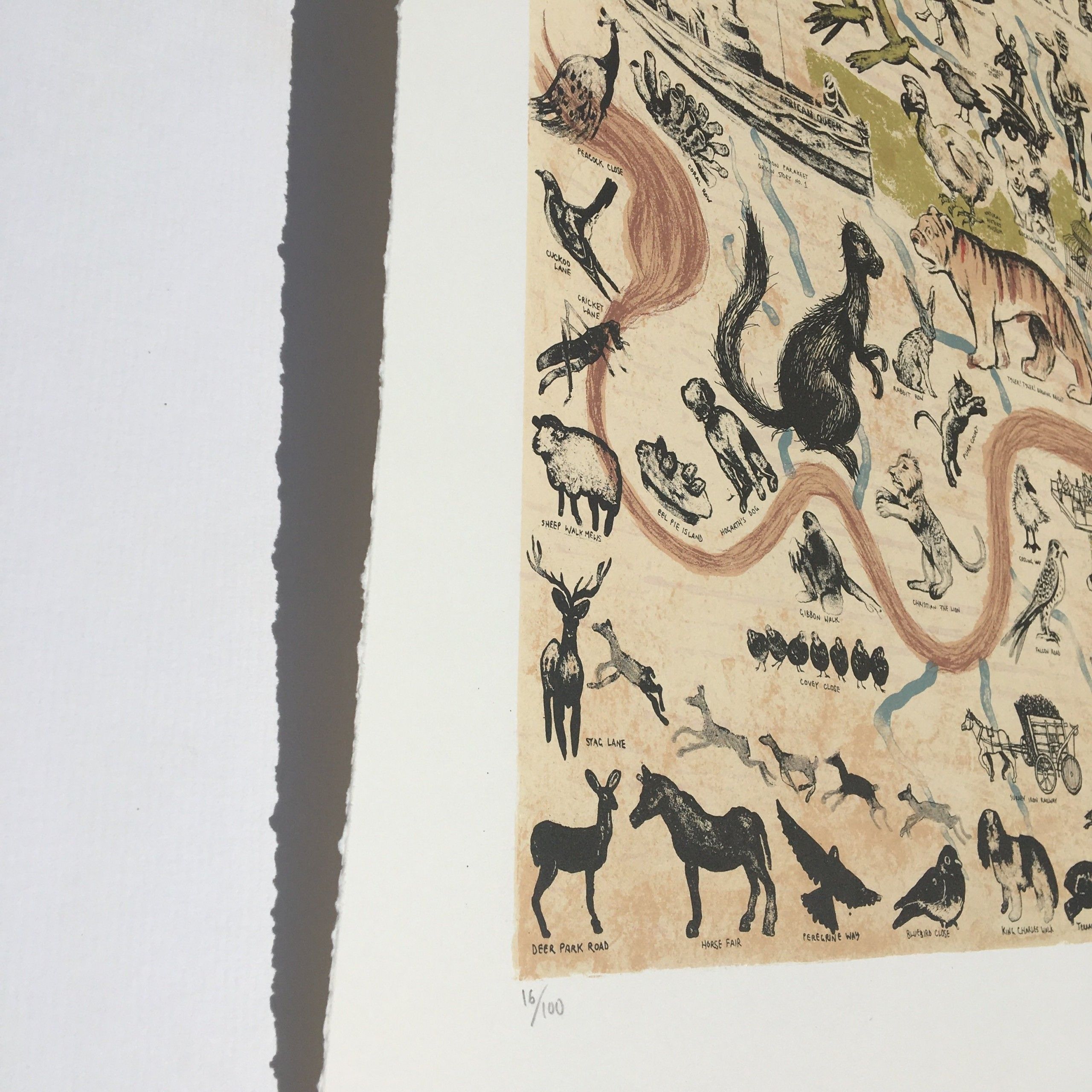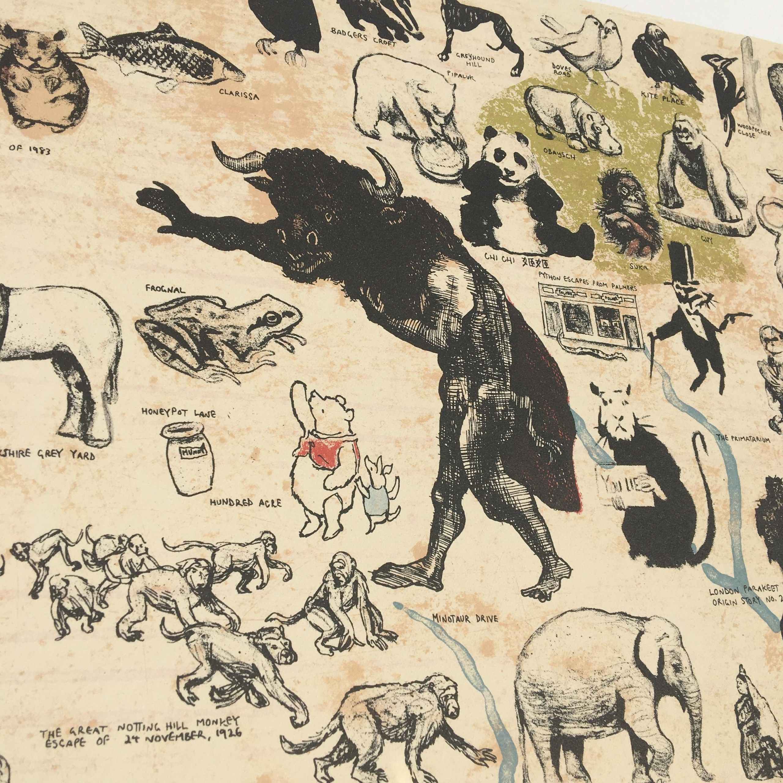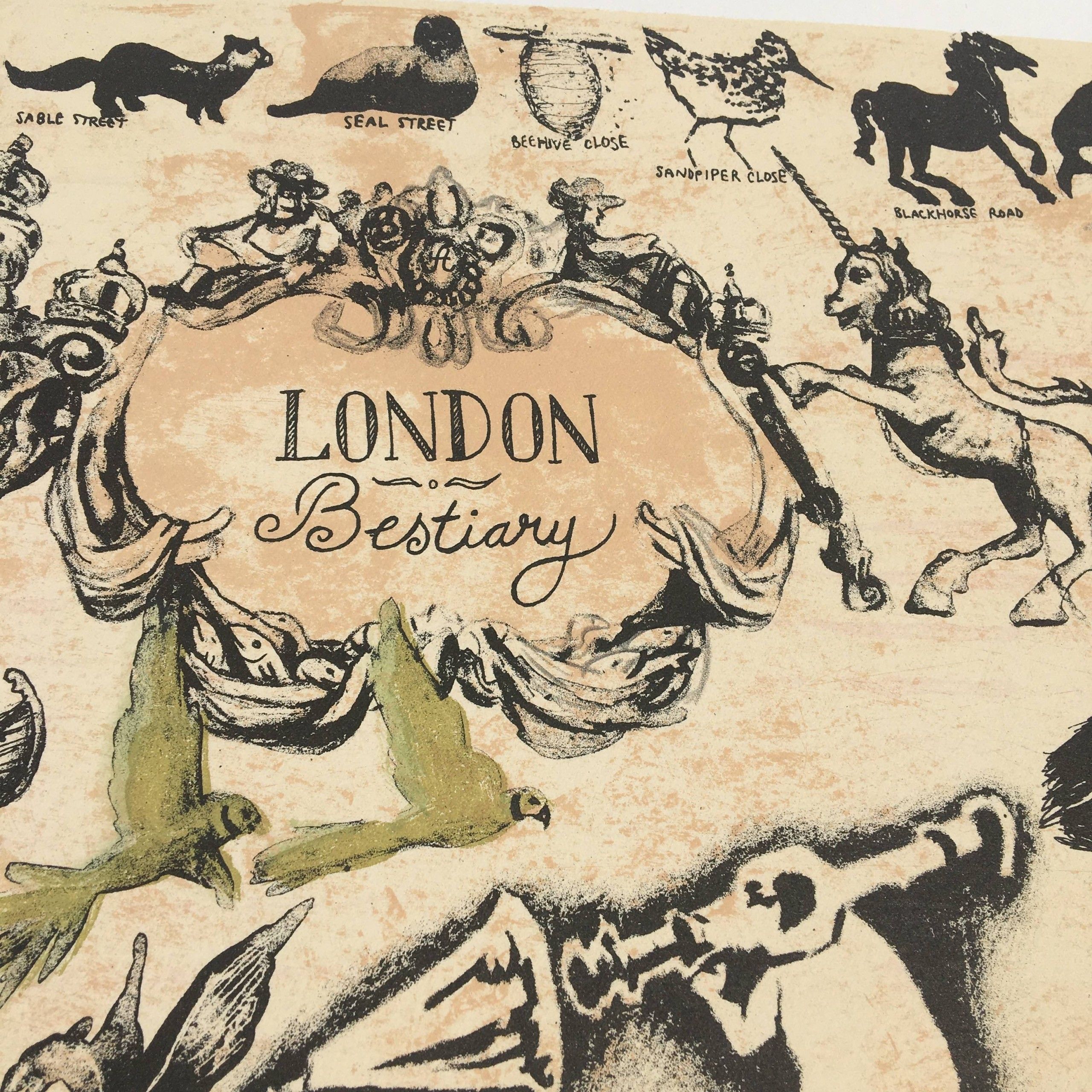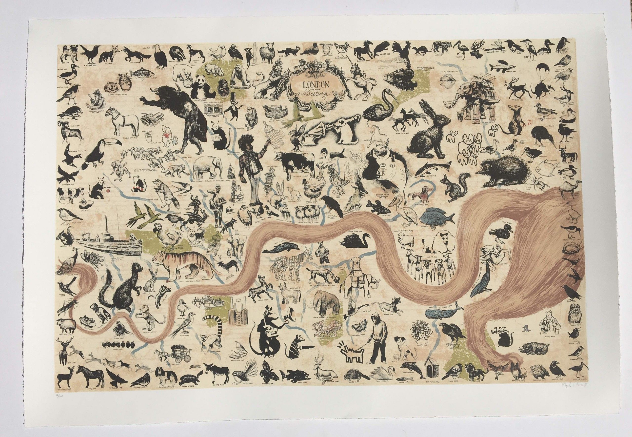 London Bestiary by Mychael Barratt. Limited Edition Silkscreen Print. Edition of 100. Image Size: H 66cm x W 99.7cm. Sheet Size: H 112.1cm x W 76.9cm x D 0.1cm. Signed and titled. Sold Unframed London Bestiary is a limited edition silkscreen print by Mychael Barratt. This beautifully illustrated map portrays an