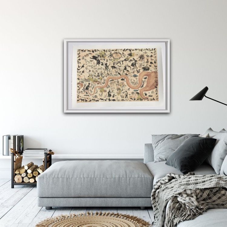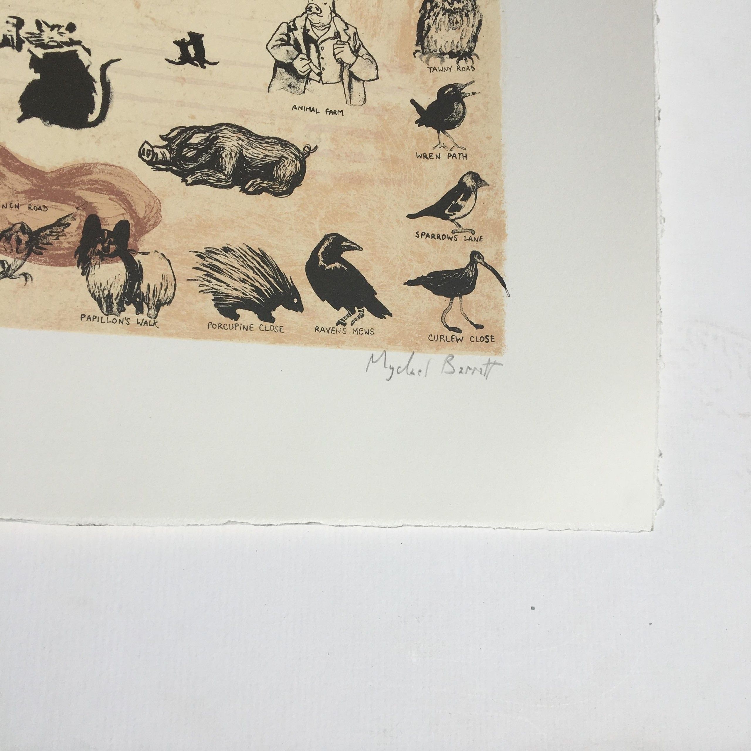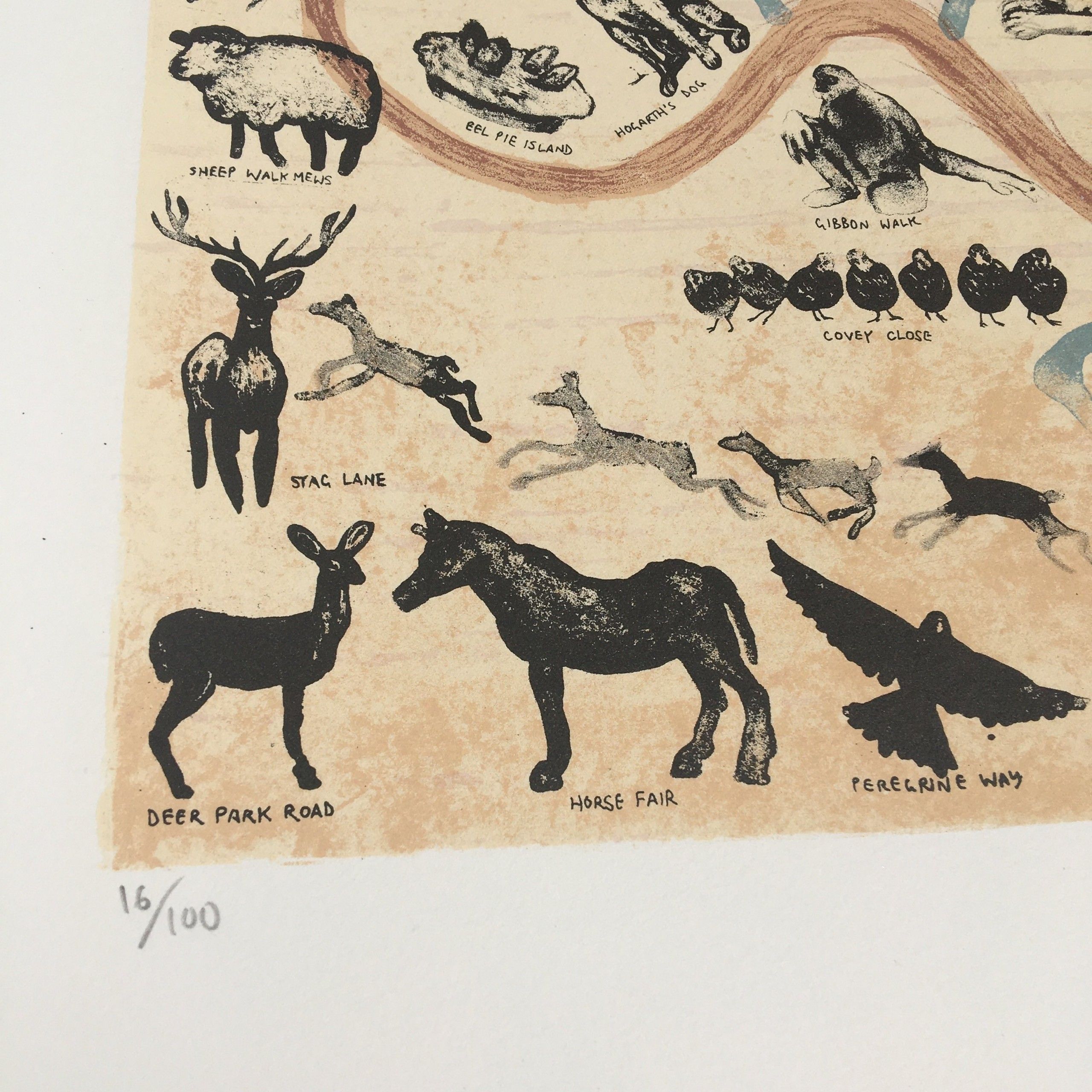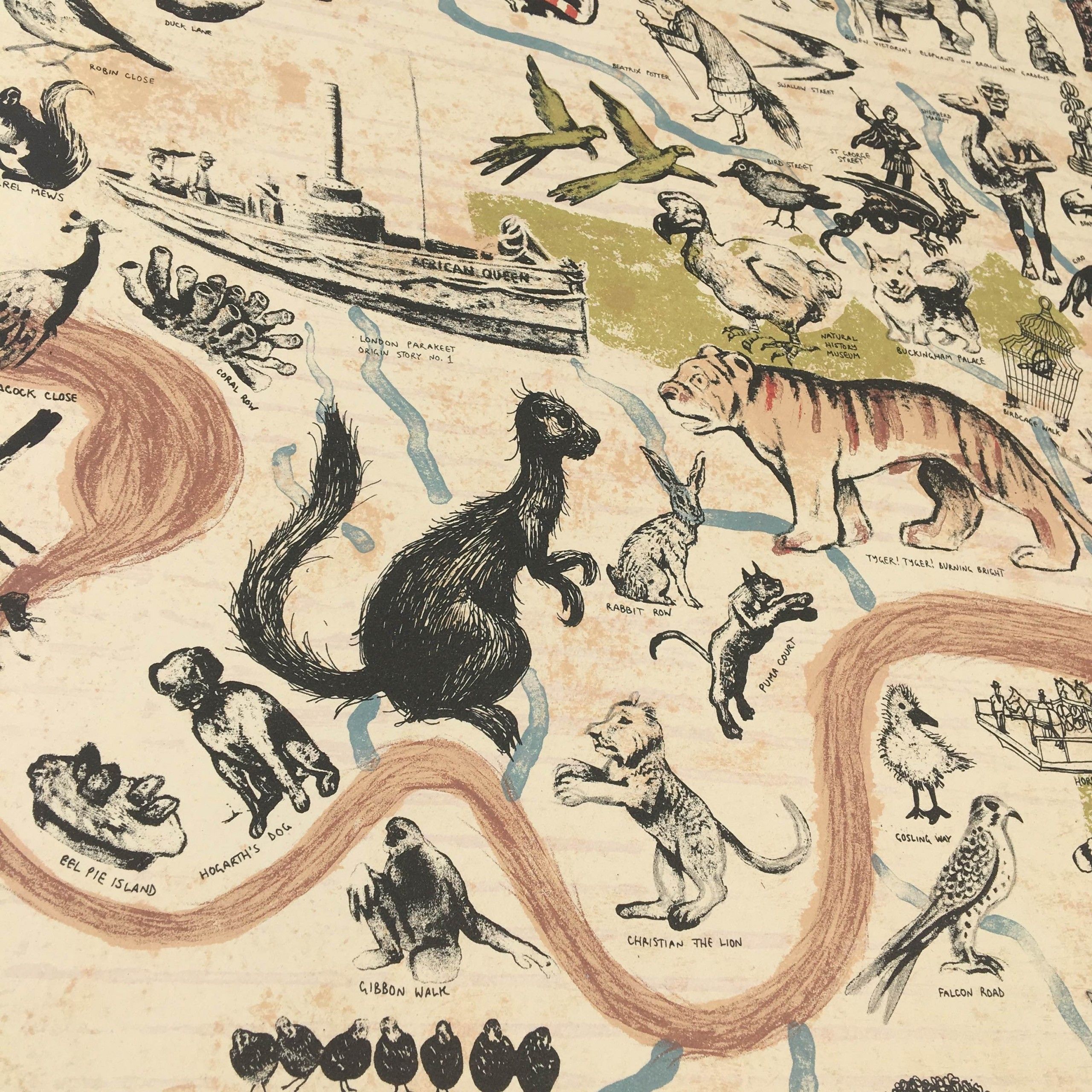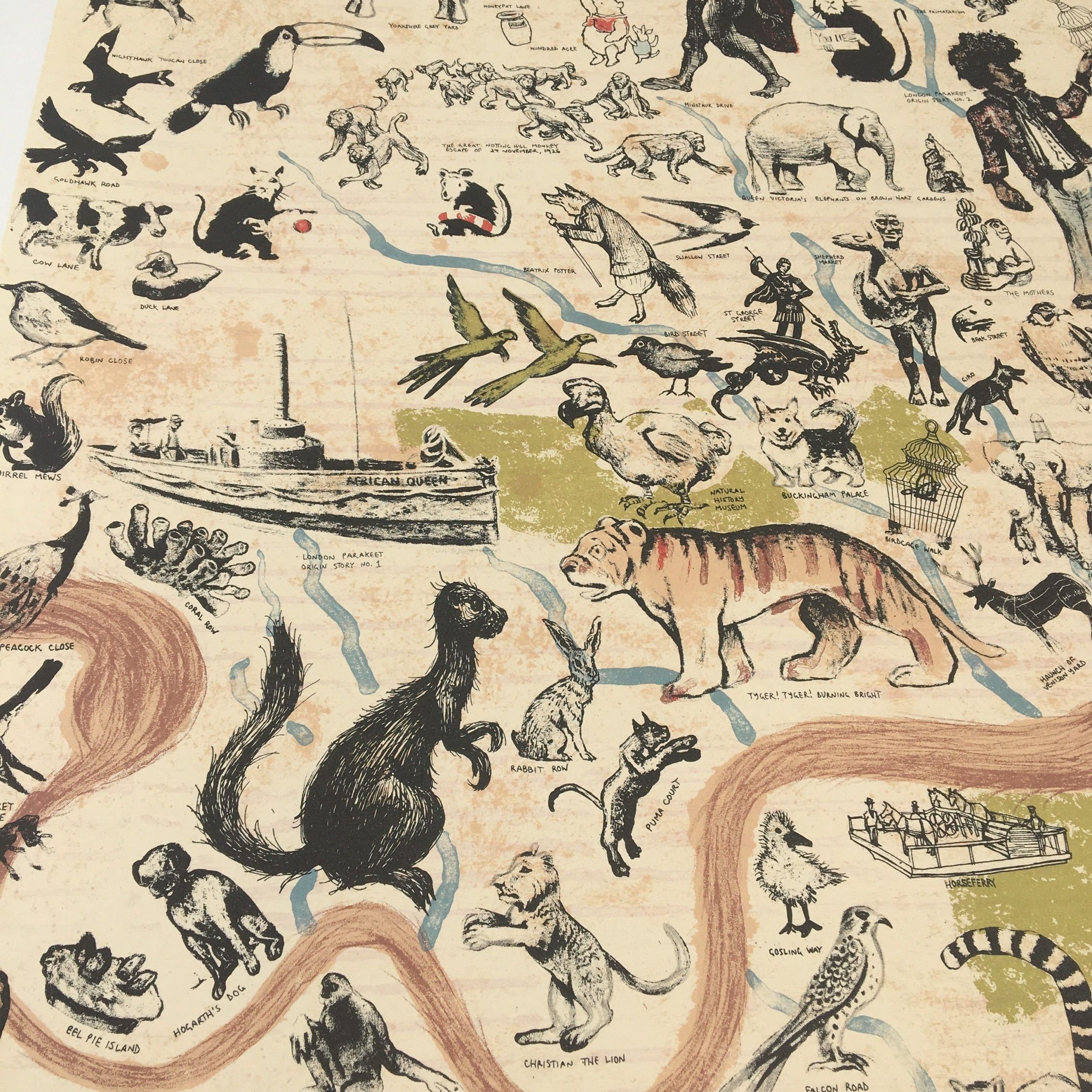 London Bestiary by Mychael Barratt. Limited Edition Silkscreen Print. Edition of 100. Image Size: H 66cm x W 99.7cm. Sheet Size: H 112.1cm x W 76.9cm x D 0.1cm. Signed and titled. Sold Unframed London Bestiary is a limited edition silkscreen print by Mychael Barratt. This beautifully illustrated map portrays an