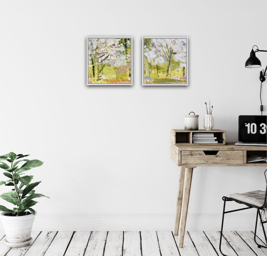 Park Blossom I and Park Blossom II diptych by Natalie Bird. Park Blossom I by Natalie Bird [2021] original Mixed media Image size: H:20 cm x W:20 cm Complete Size of Unframed Work: H:37 cm x W:37 cm x D:3cm Frame Size: H:36 cm x W:36 cm x D:3cm Sold Framed Please note that insitu images are purely