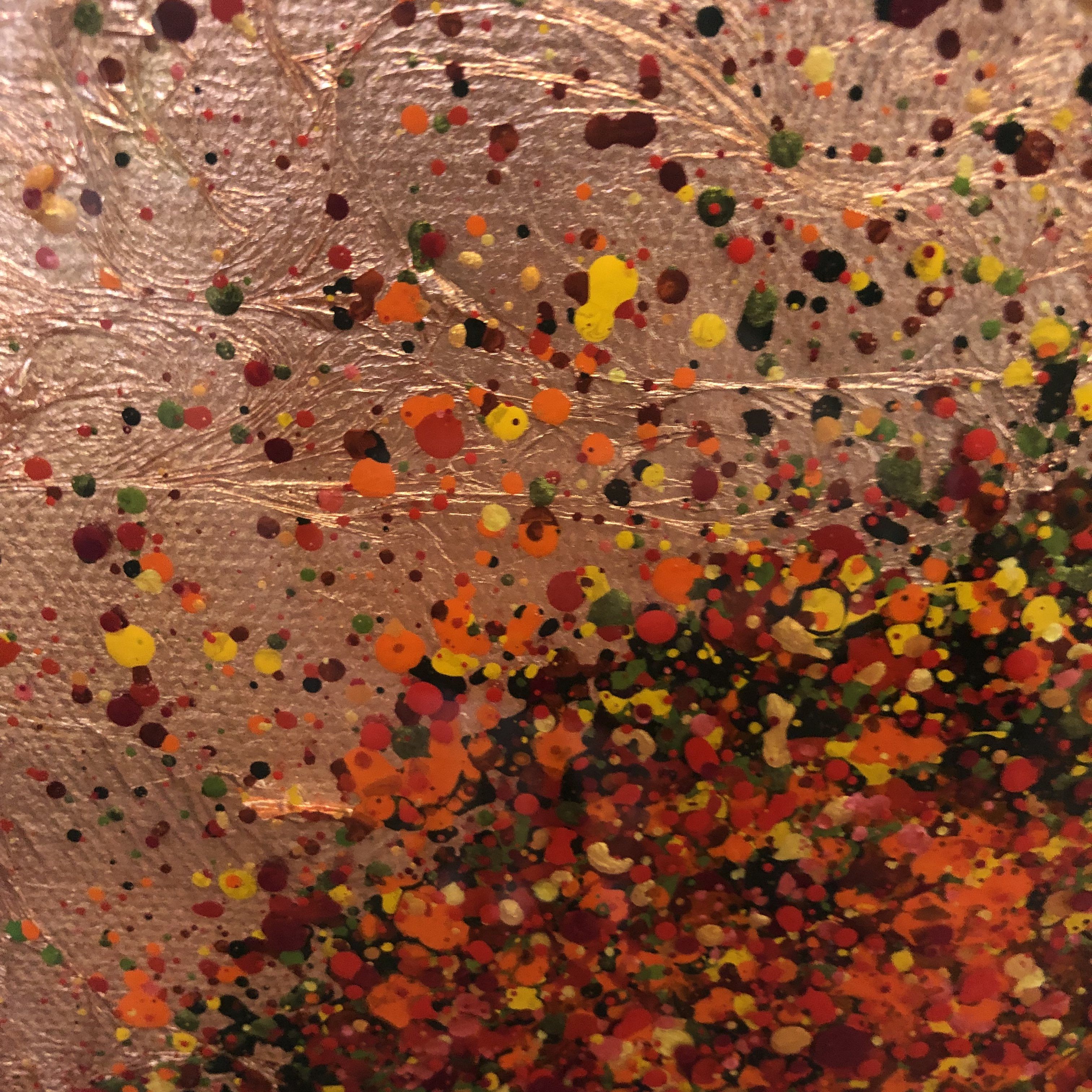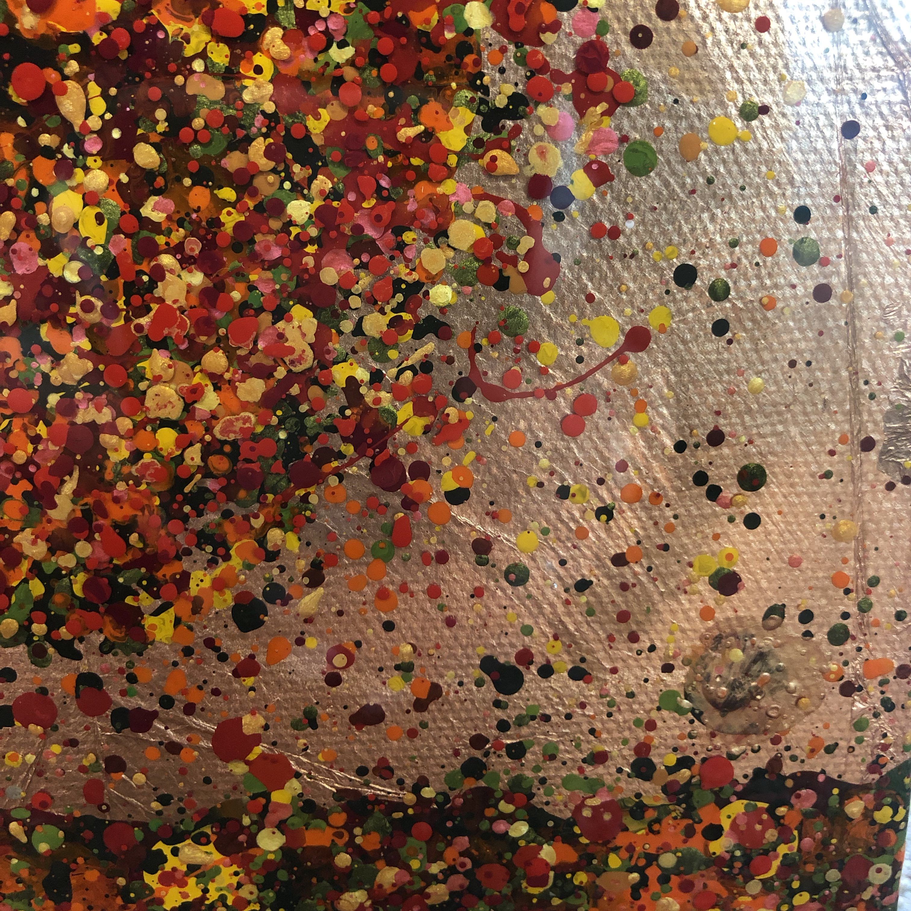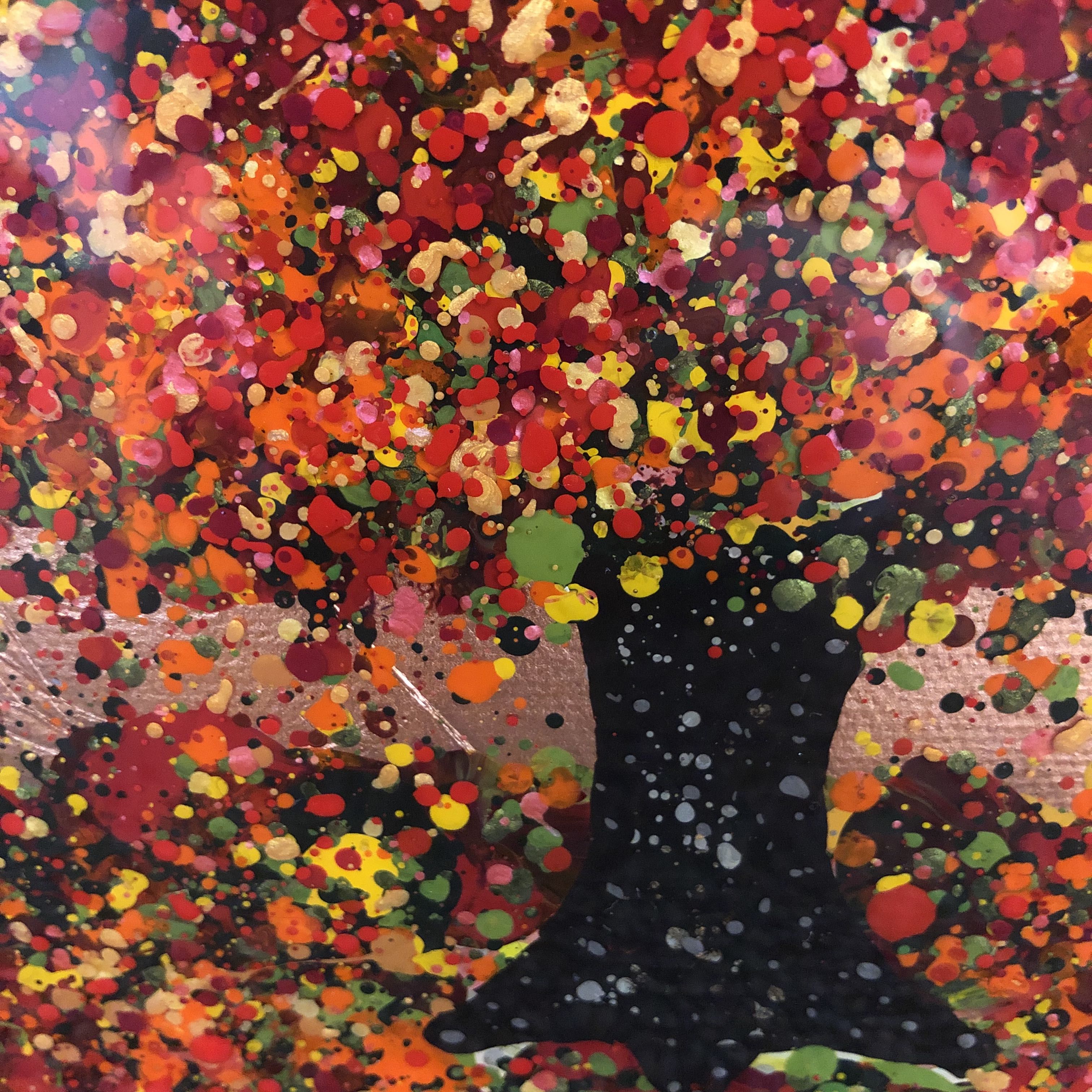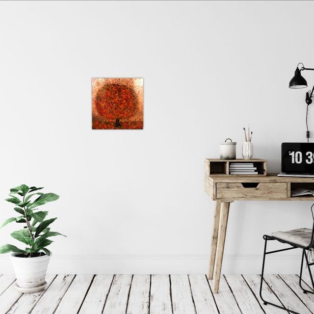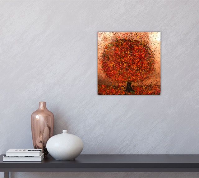Nicky Chubb Happy Red Autumn Original Landscape Painting Acrylic Paint, Copper Leaf and Resin on Canvas Canvas Size: H 30cm x W 30cm x D 4cm Sold Unframed Free Shipping Happy Red Autumn is an original painting by Nicky Chubb. The copper leaf and red paint give the work a warmth. Nicky Chubb artist with Wychwood Art. Nicky Chubb comments