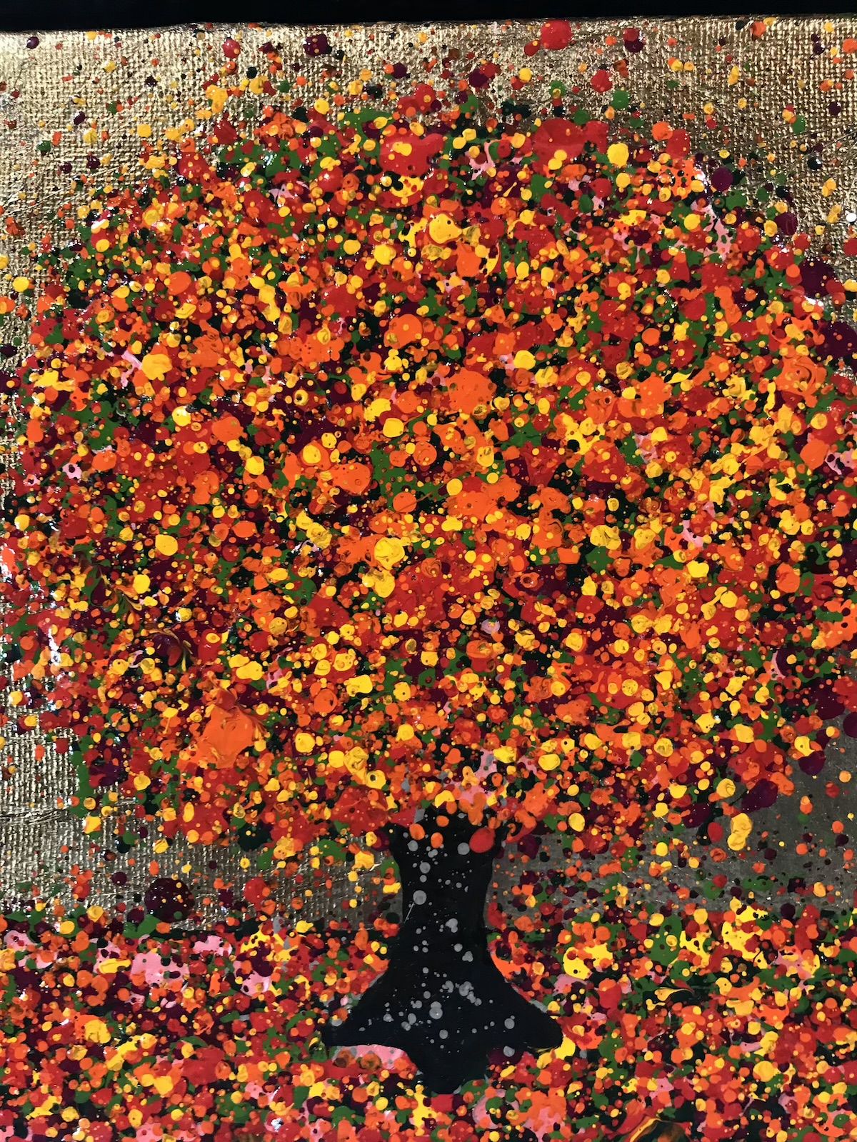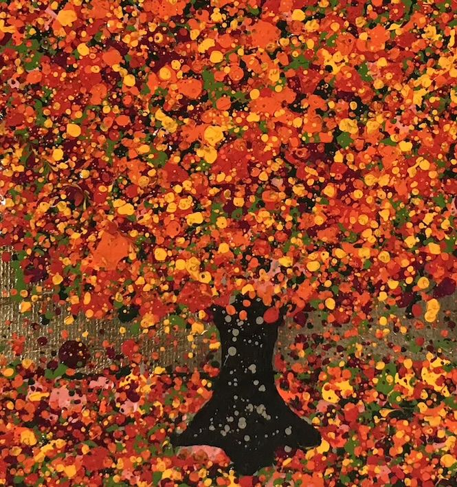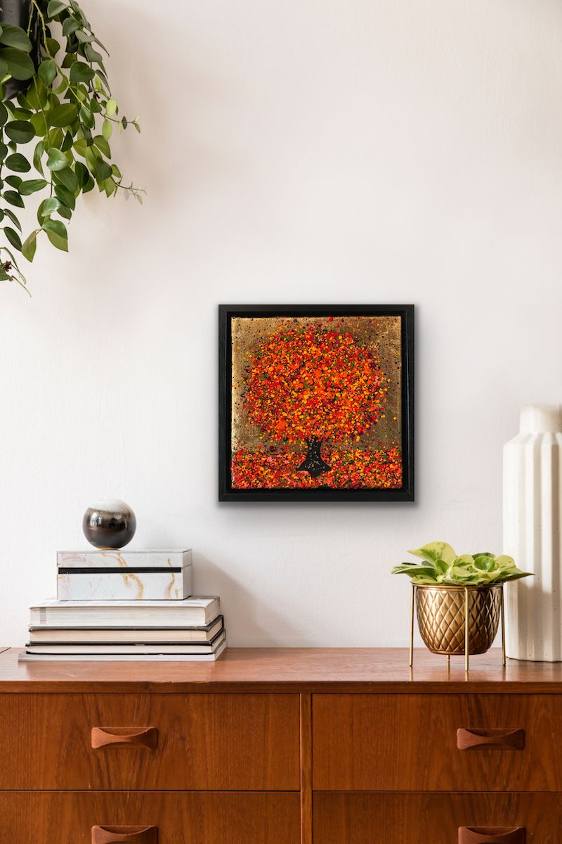 Little Golden Autumn Sunshine is a small scale original landscape painting by artist Nicky Chubb. This painting features her signature stippling and dotting mark making alongside a tree making up the central subject of the painting. The bold orange tree in the foreground harmonised perfectly with the gold background alongside