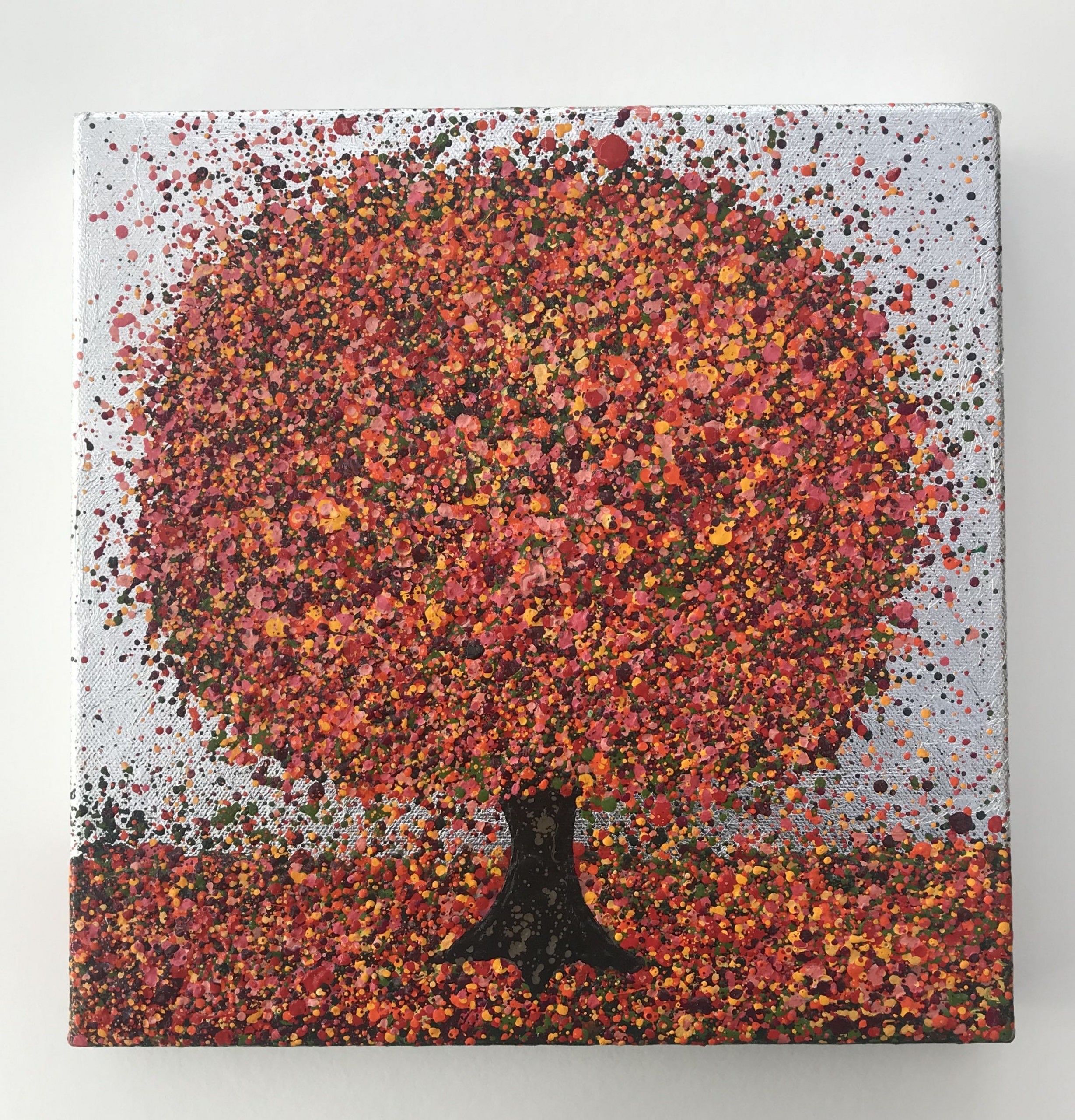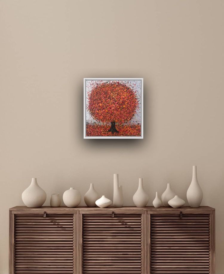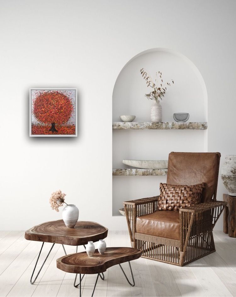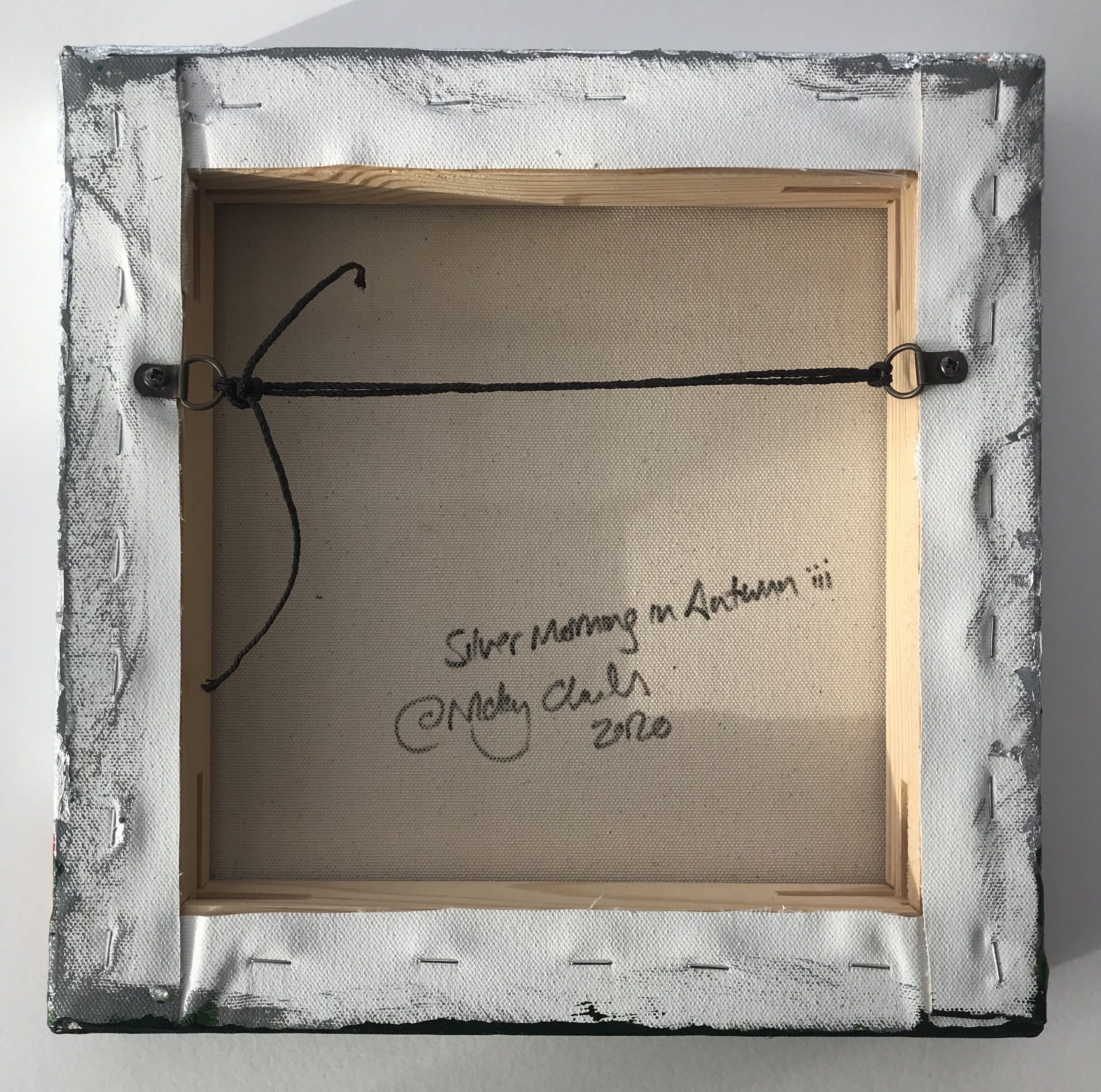 Silver Morning in Autumn III by Nicky Chubb is an original landscape painting featuring beautiful autumnal colours on the tree these are complemented with the contrasting silver background.