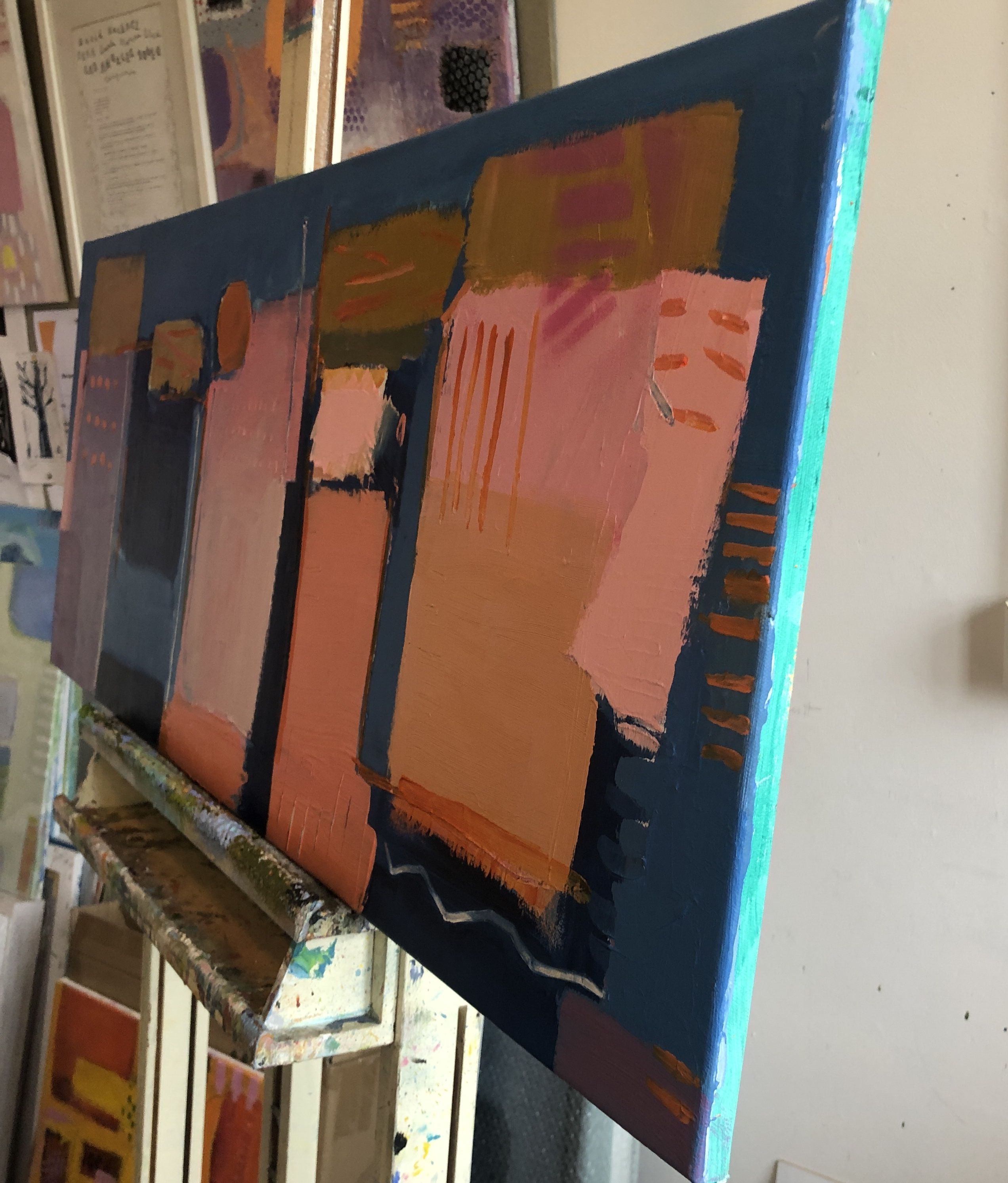 After spending many days studying and sketching the houses in St. Ives, near the home of the artist Alfred Wallis , I put aside my sketchbook and from memory and imagination I work. First finding a palette that appeals to me as colour will always be my starting point ,