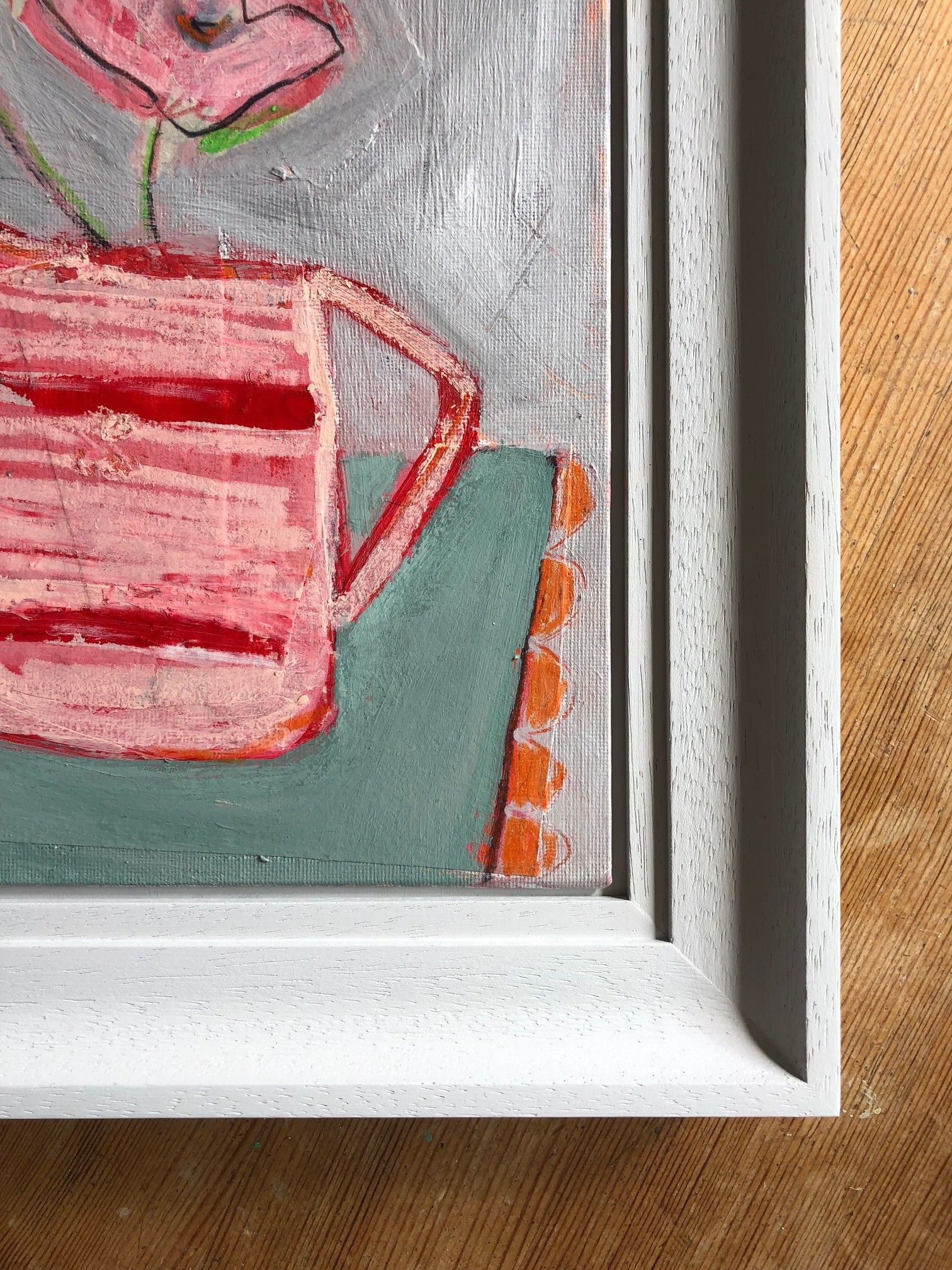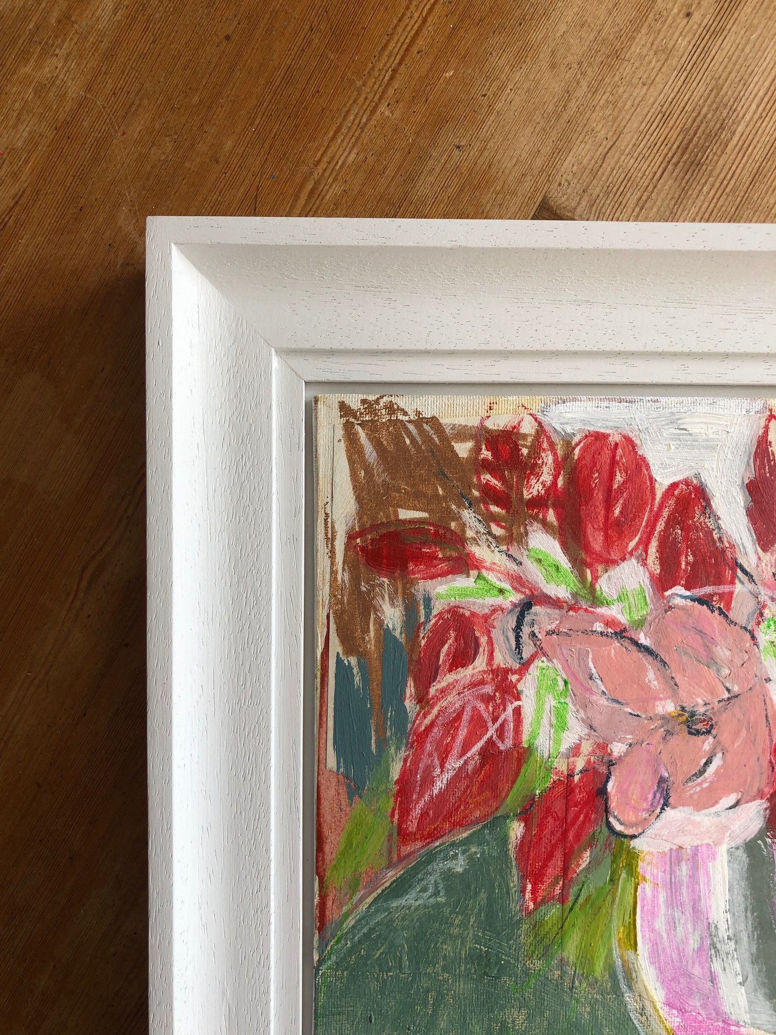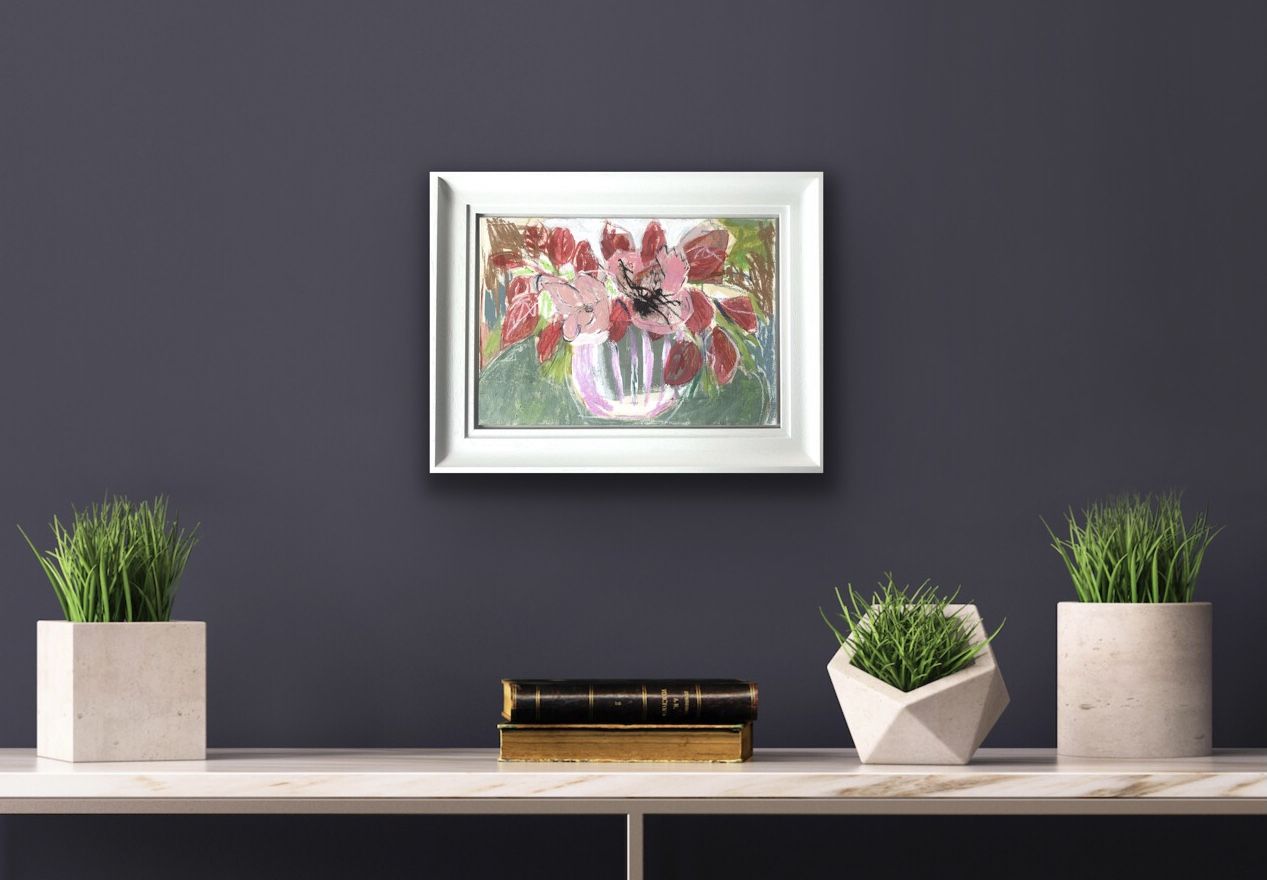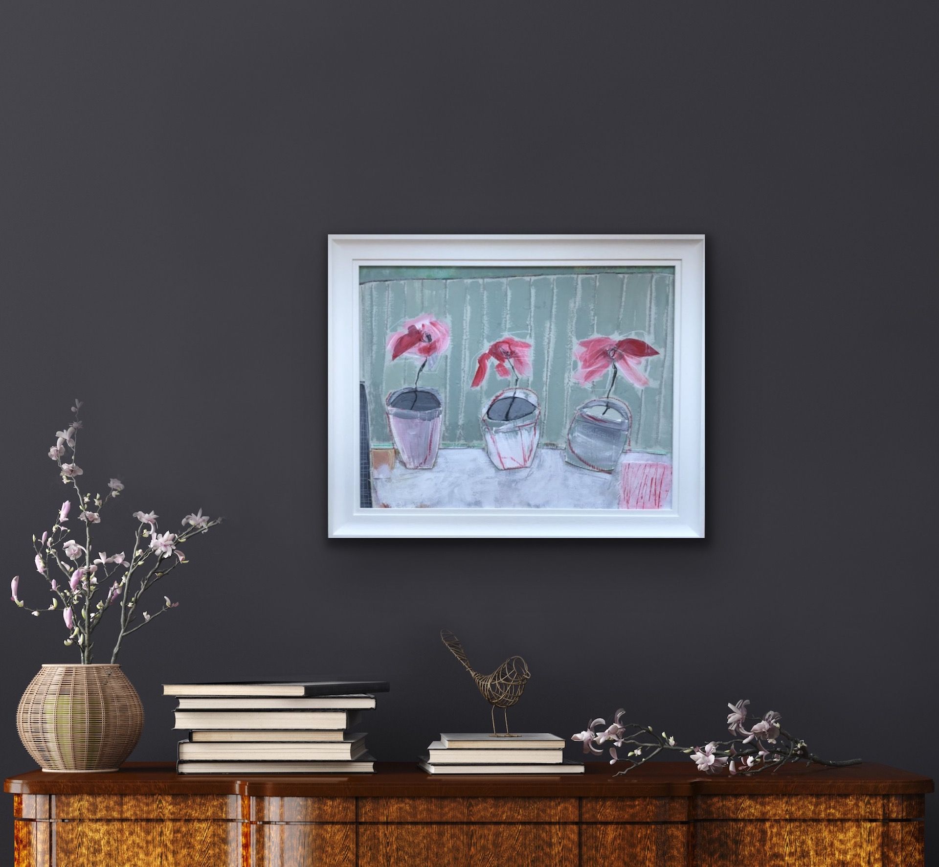An original mixed media Triptych by Diana Forbes containing the works: One Gathering (35.5cm x 45.5cm), Striped Jug (34.2cm x 29.2cm) and Smoke Bush and Anemone (30.2cm x 39.2cm).