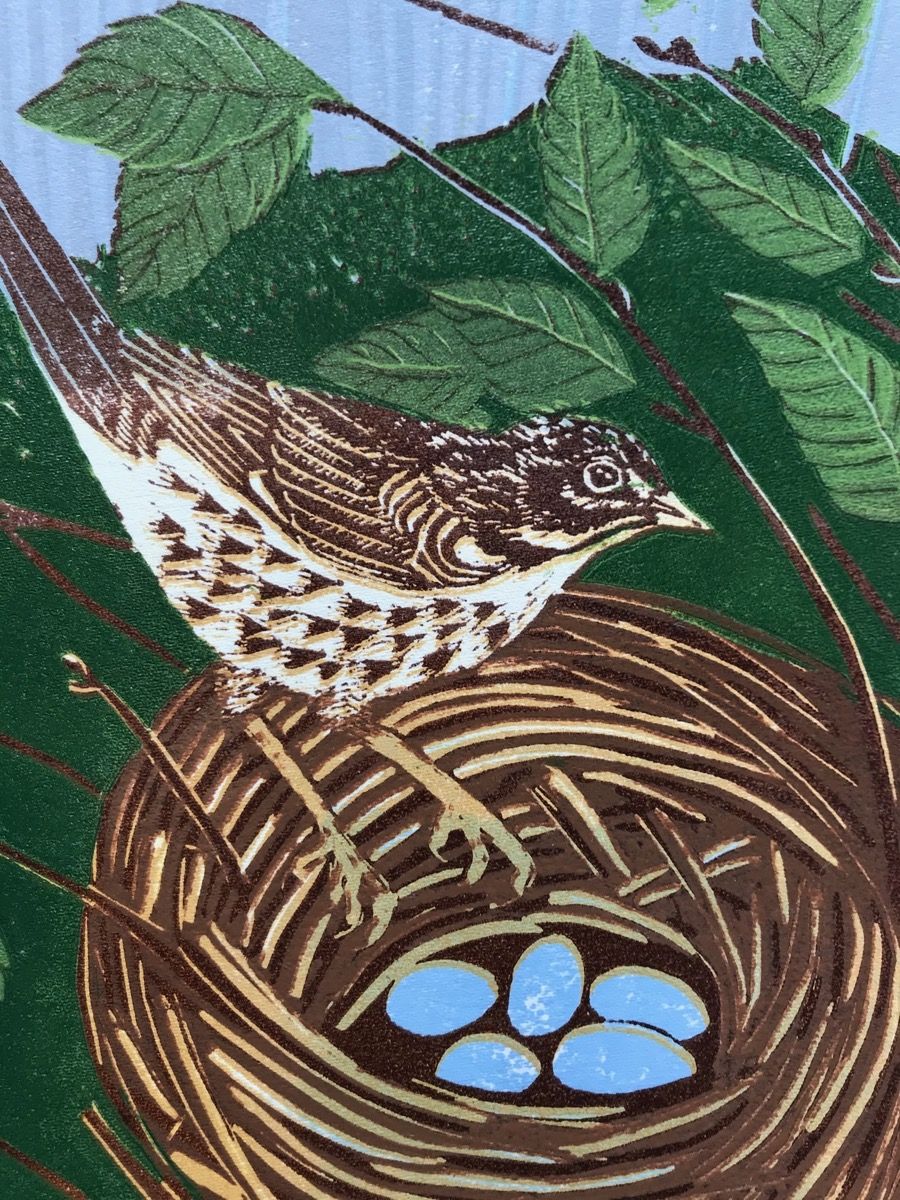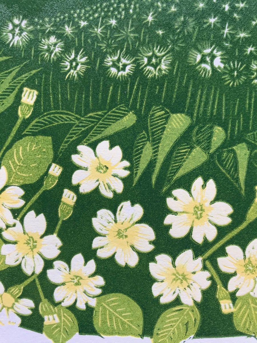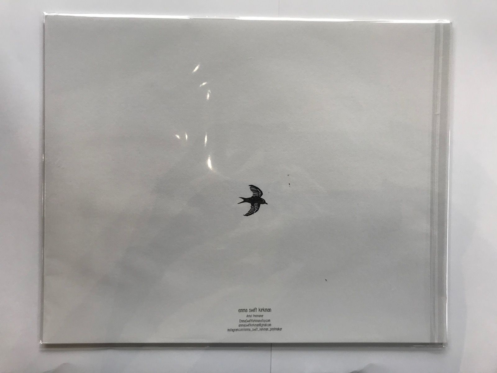 A limited edition linocut reduction print of only 10. Linocut reduction is a method where layers of colour are built up and with each new colour a part of the block is carved away as part of the process, this means that there can be no more prints taken from