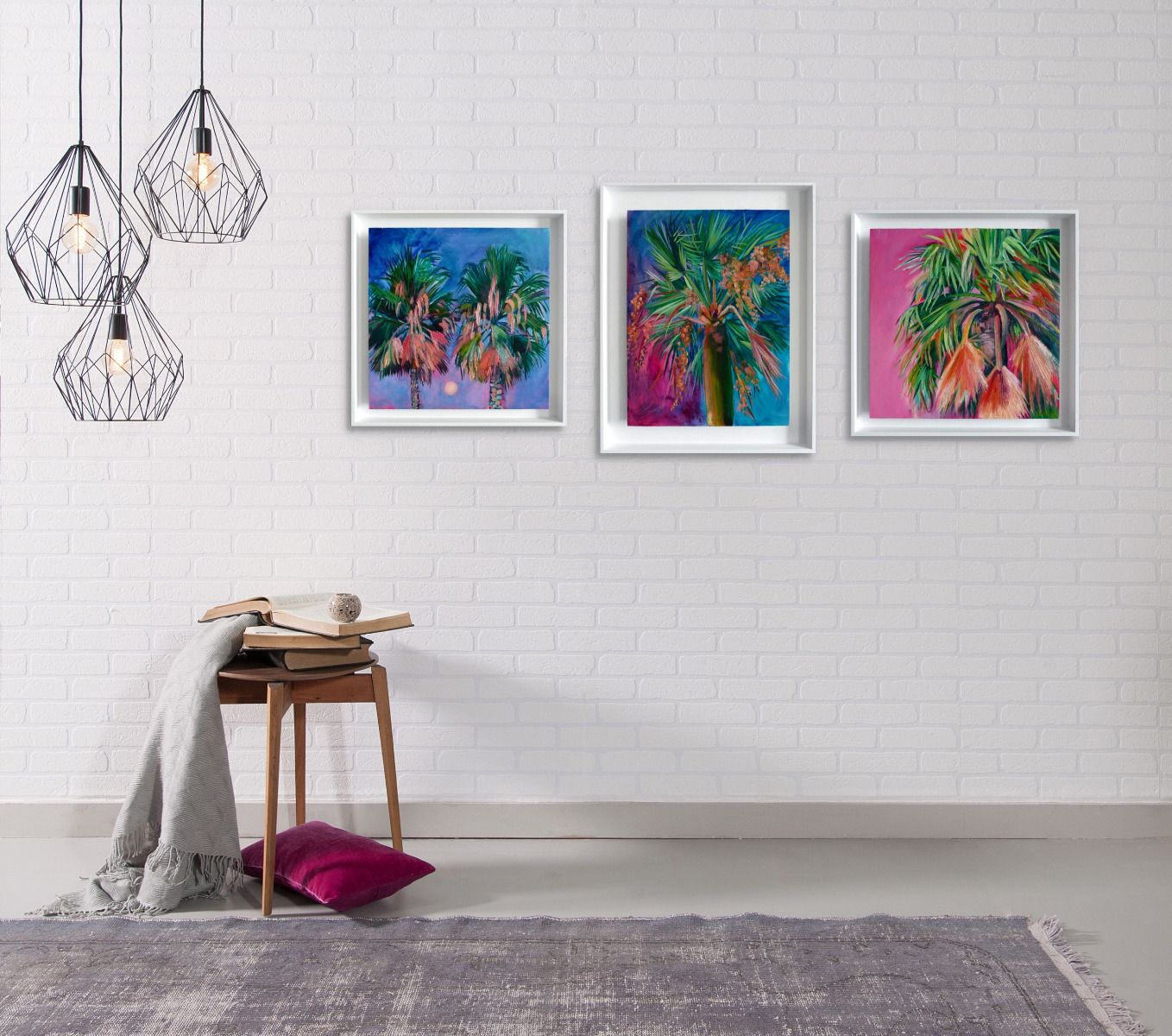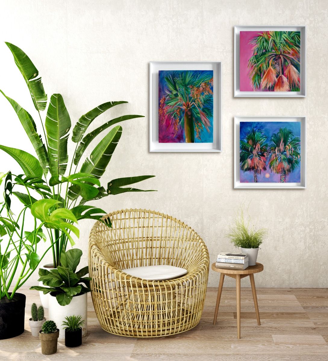 Trio of palm tree oil paintings. 1. 'Mirissa' 26 x 26cm (31 x 31cm framed) 2. 'Bangkok' 26 x 26cm (31 x 31cm framed) 3. 'Honolulu' 23.5 x 31cm (31 x 40cm framed) All framed in a white tray frame, ready to hang. Signed on the back. The buyer will receive all three
