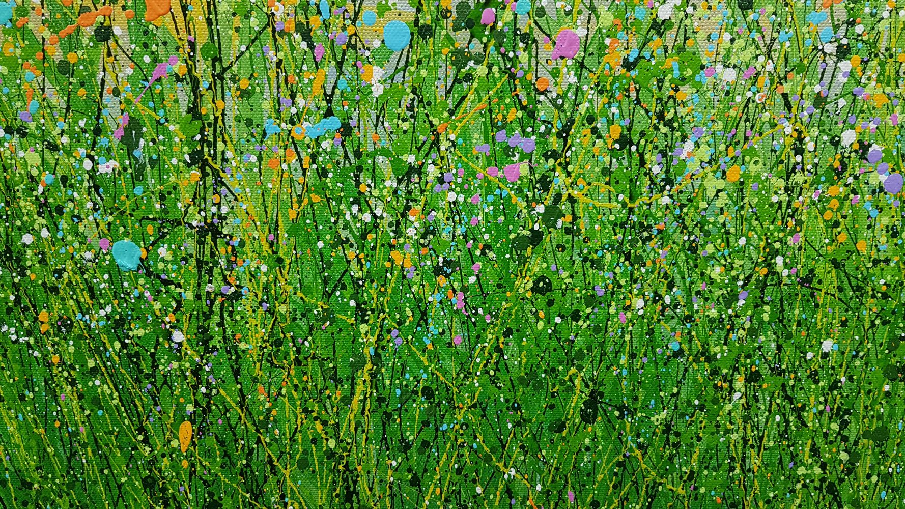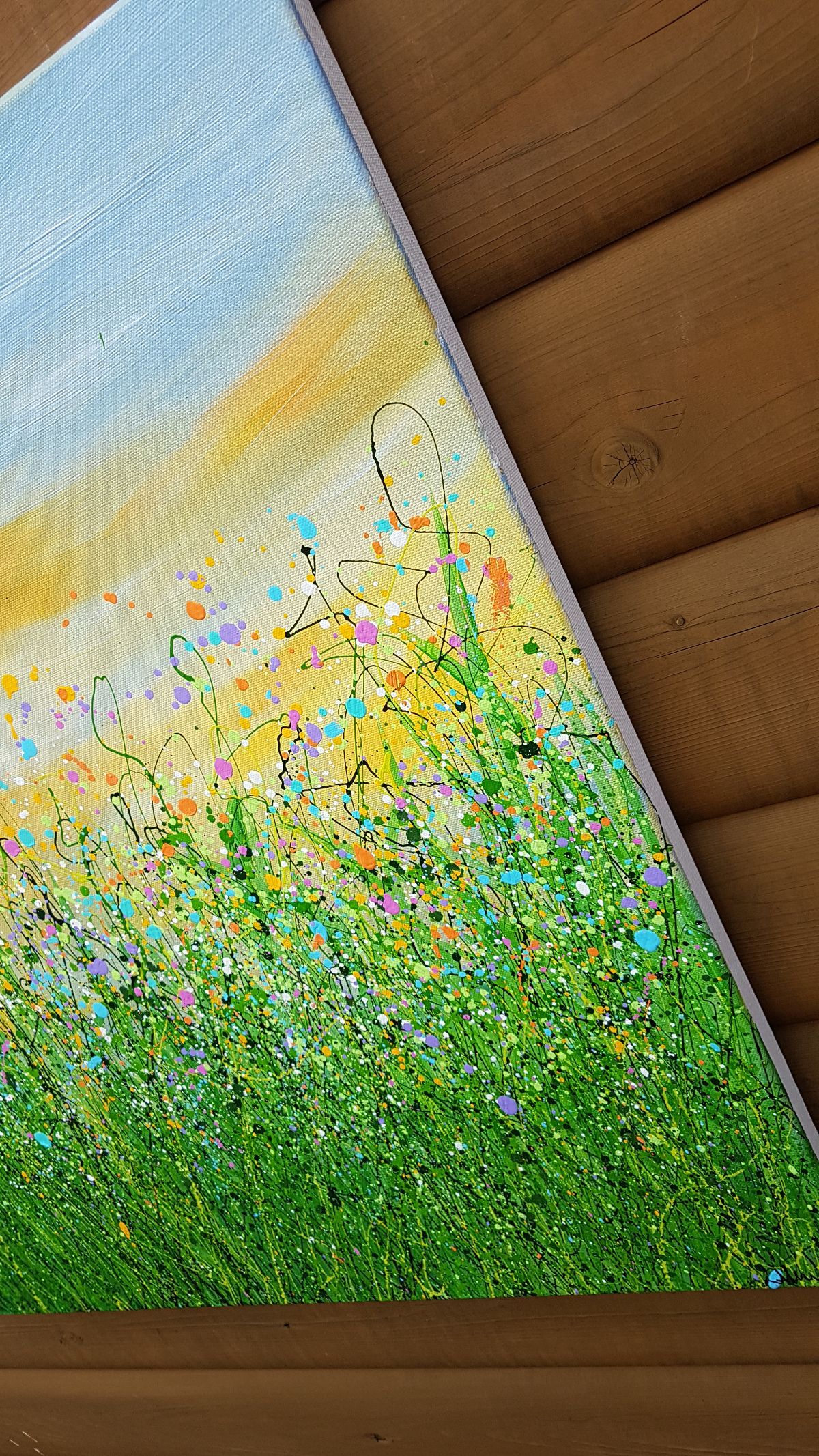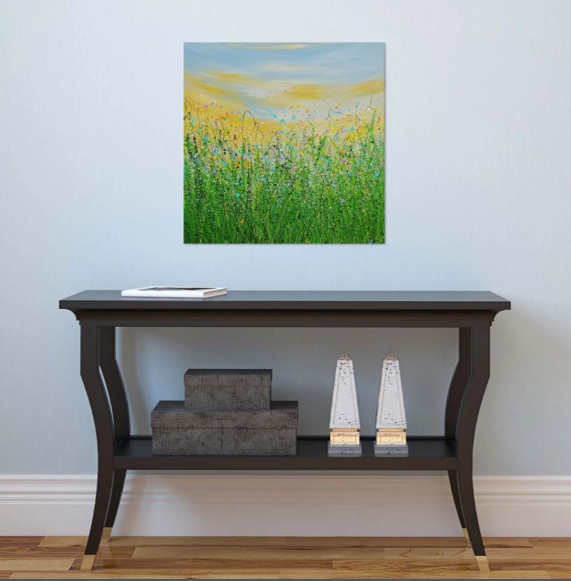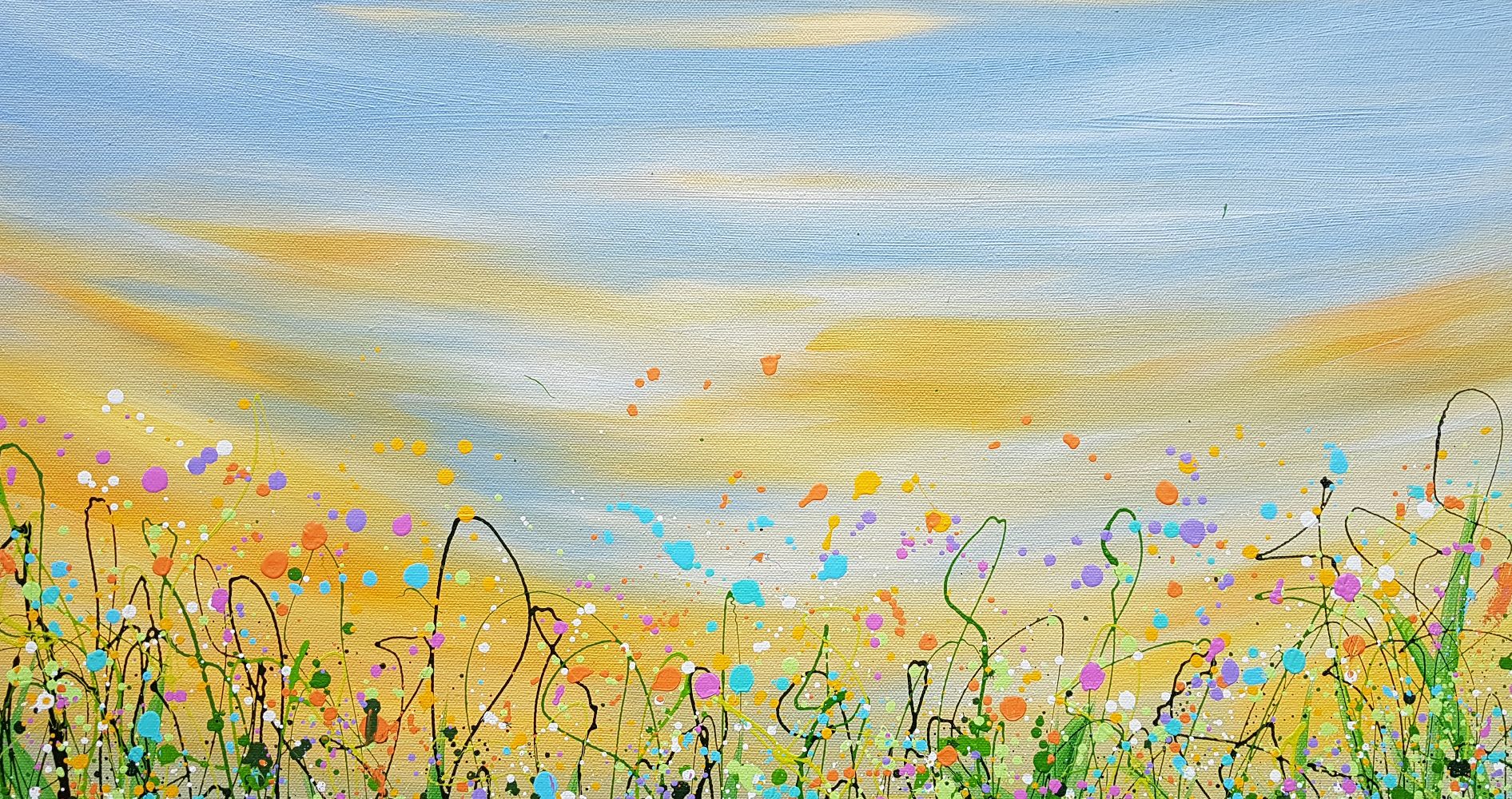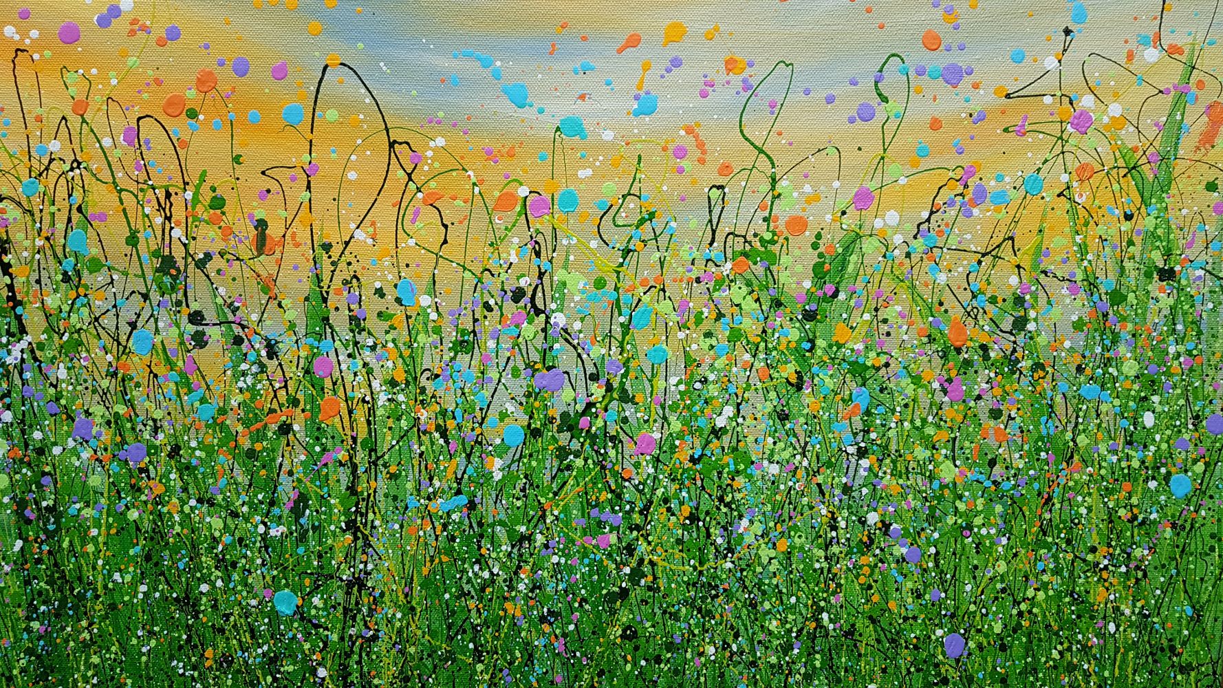 Pastels At Dawn - An Original semi-abstract painting by Lucy Moore. Using her signature string grass technique Lucy has created a semi-abstract twist to her classic meadow paintings. Colourful pastels flowers beneath a sunlit skyline. This piece would brighten any home or office, bring a little of the outside inside.
