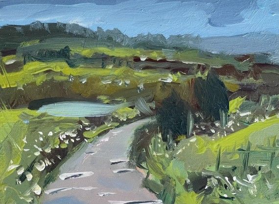 Original Pentland Hills, evening light by Natalie Bird, oil on board painting, in a impressionist style. The landscape composes of green toned hills with. fance running throug the bushes and plants painted on blue sky surrounded by clouds. Additional Information: Original Oil on board Image size: H:20 cm x W:30 cm Complete Size of Unframed