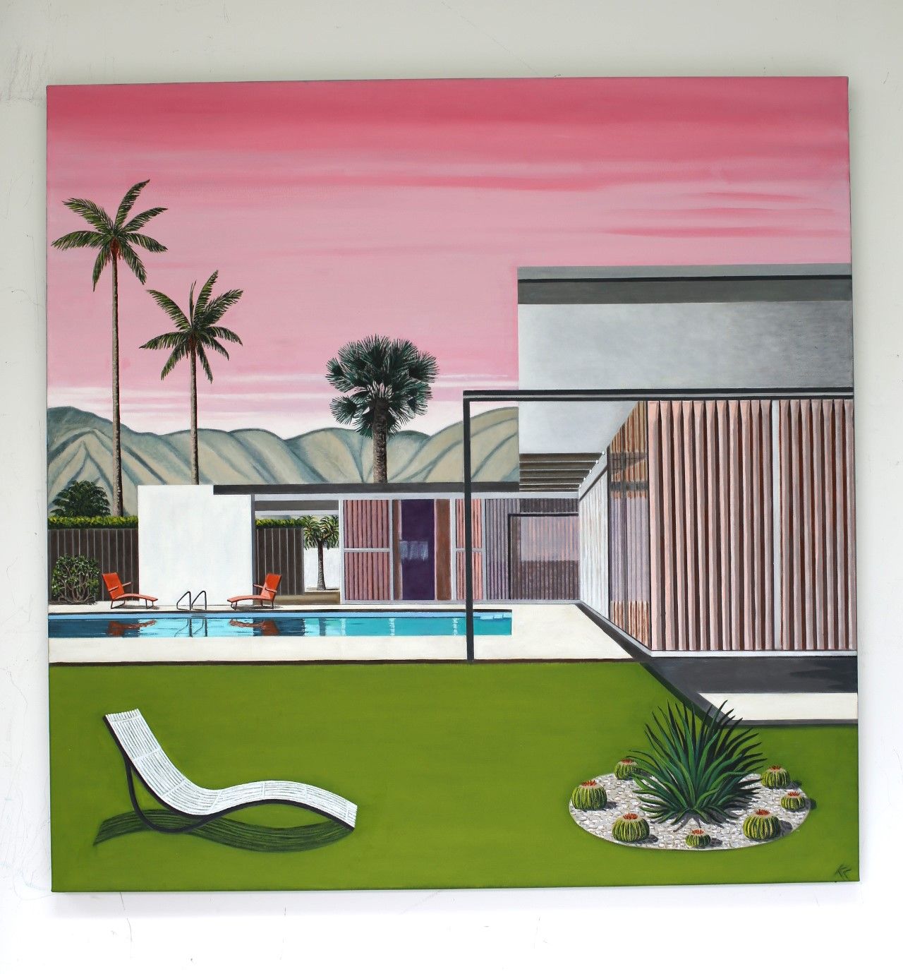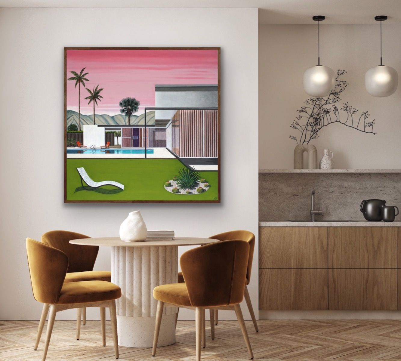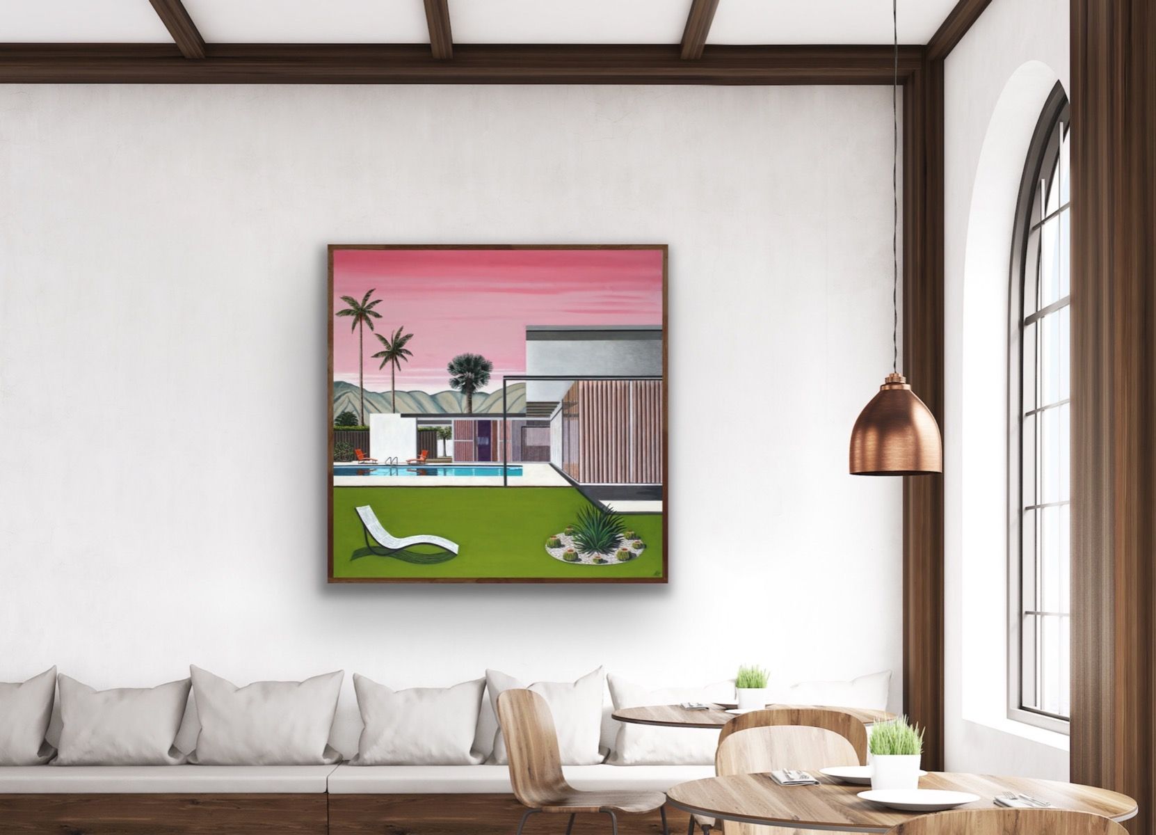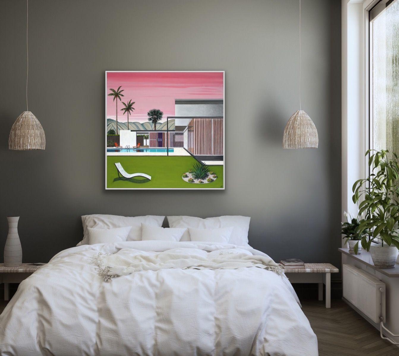 This is a painting from my series of architecural paintings. In this particular painting I have played with colour by adding a striking cinematic pink sky which contrasts against a turquoise pool and a green grass garden. I love mid century architecture, its straight lines with its glass windows giving