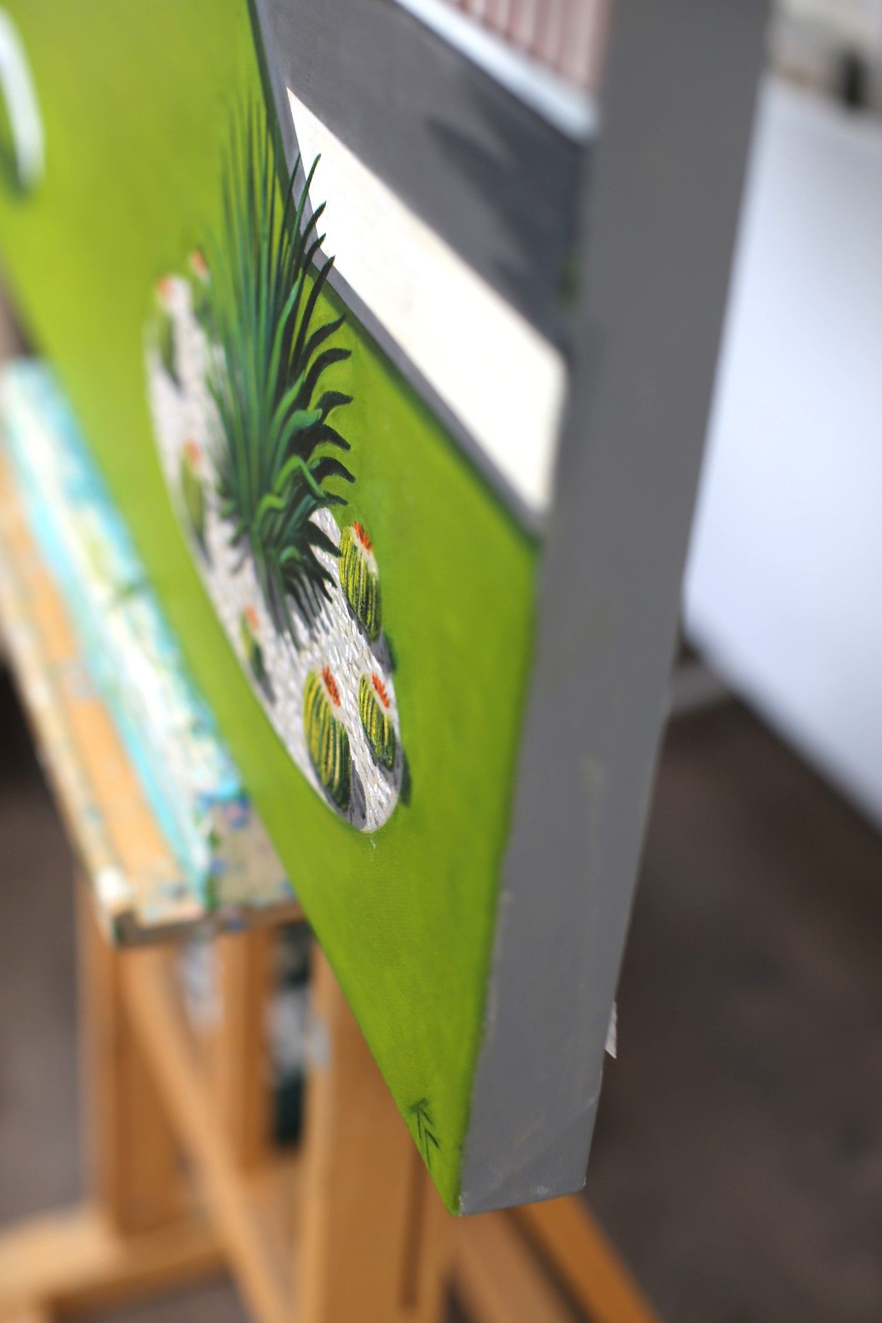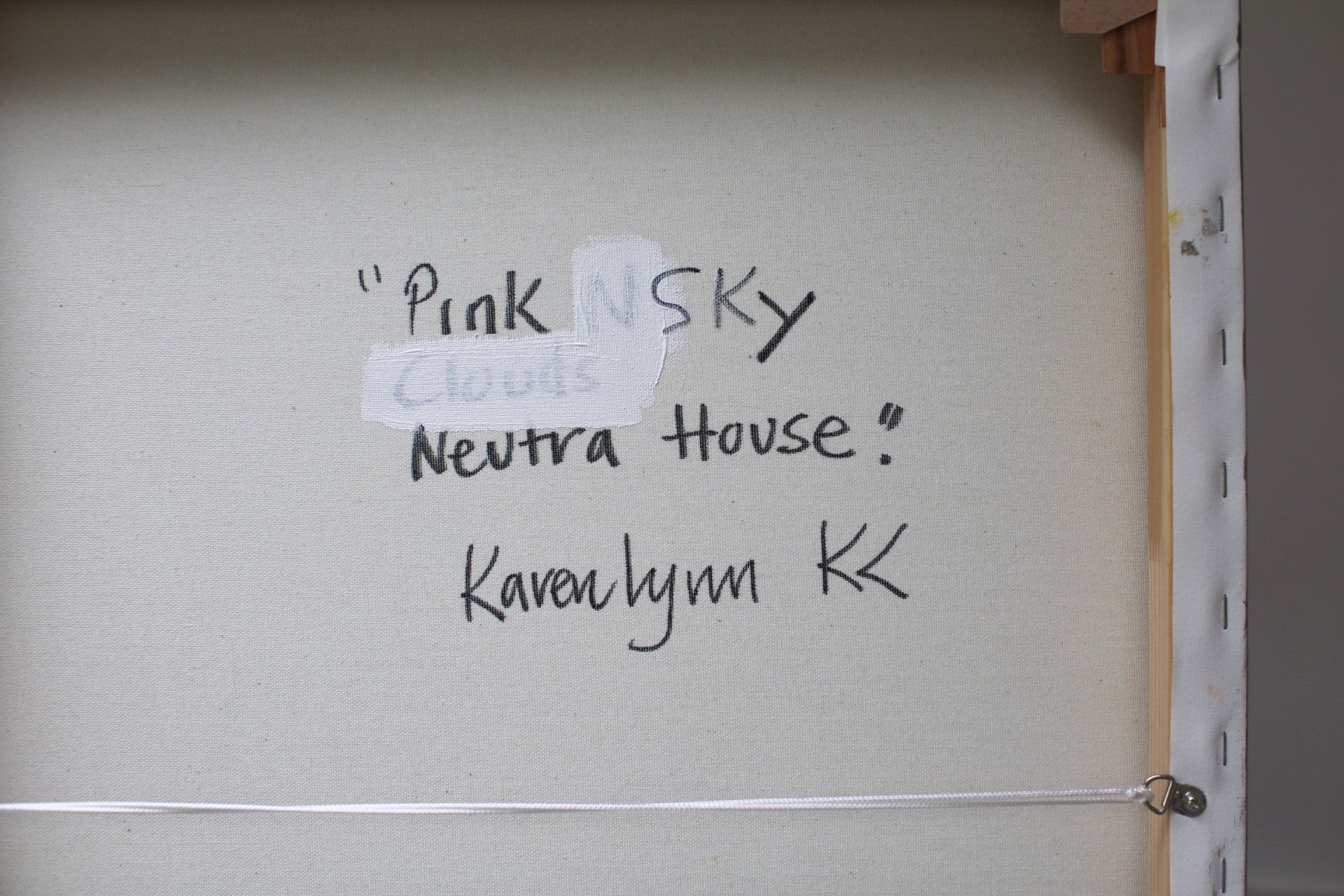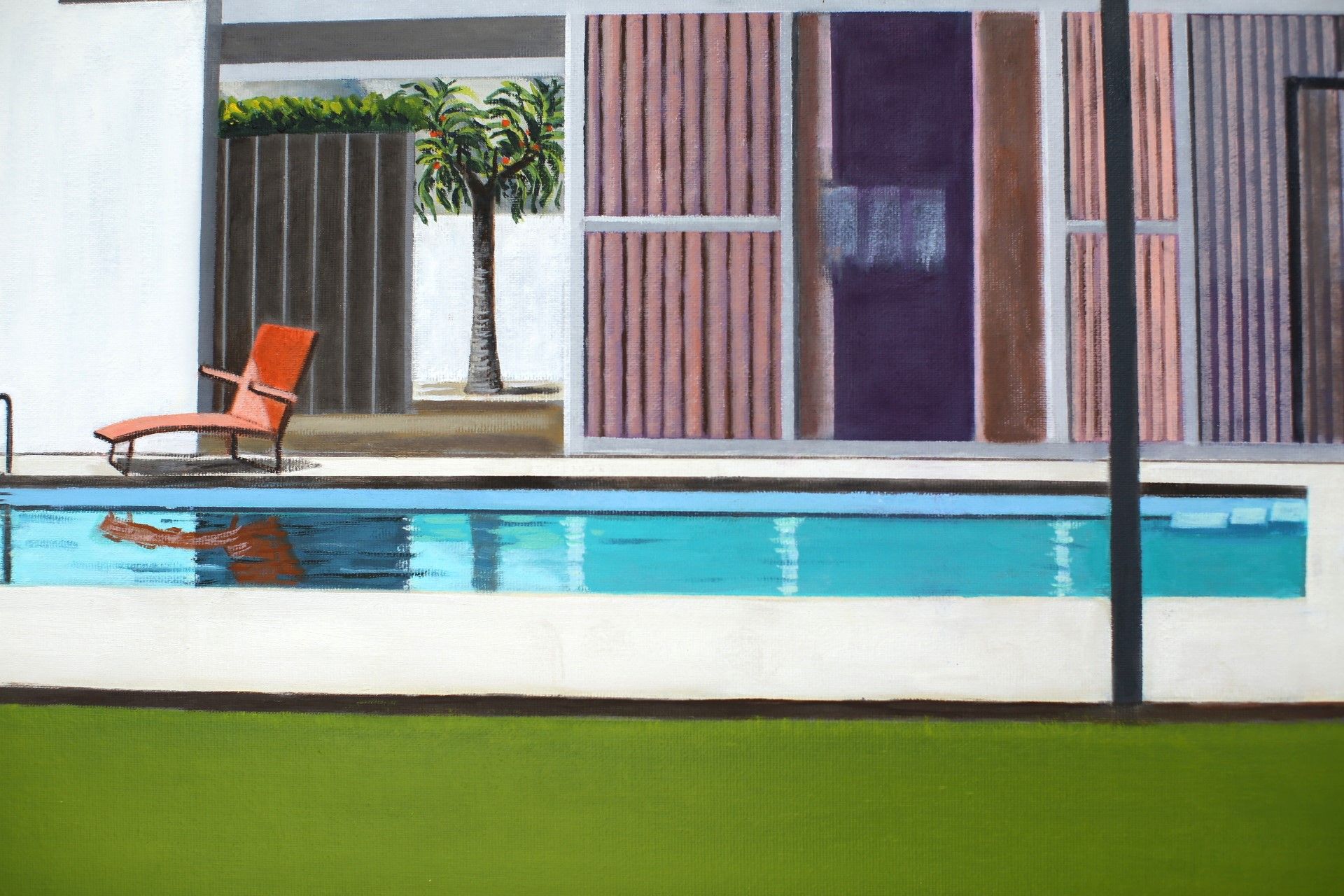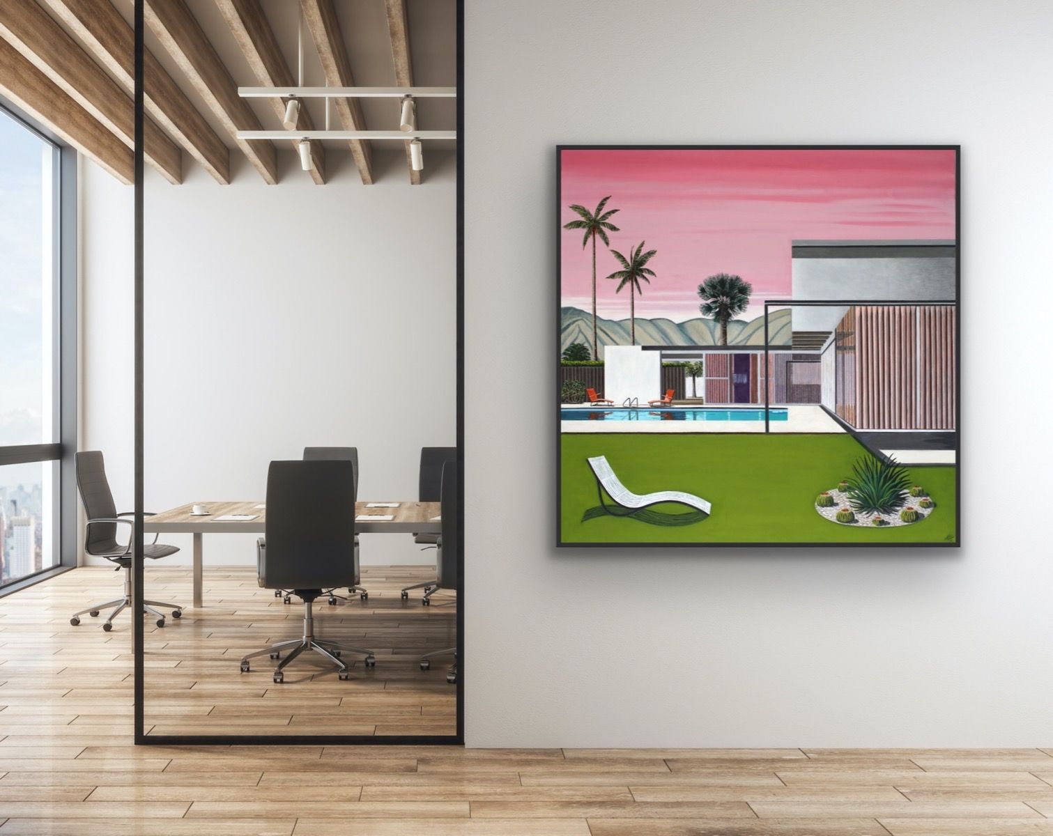 This is a painting from my series of architecural paintings. In this particular painting I have played with colour by adding a striking cinematic pink sky which contrasts against a turquoise pool and a green grass garden. I love mid century architecture, its straight lines with its glass windows giving