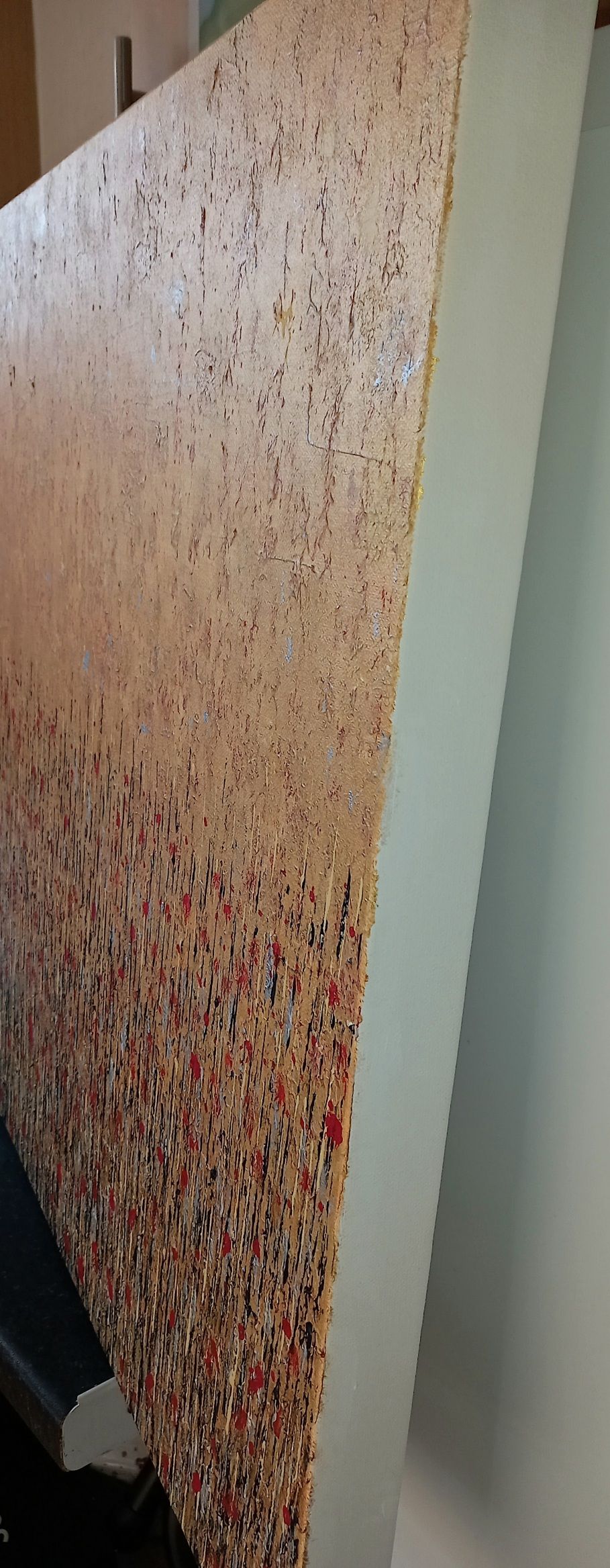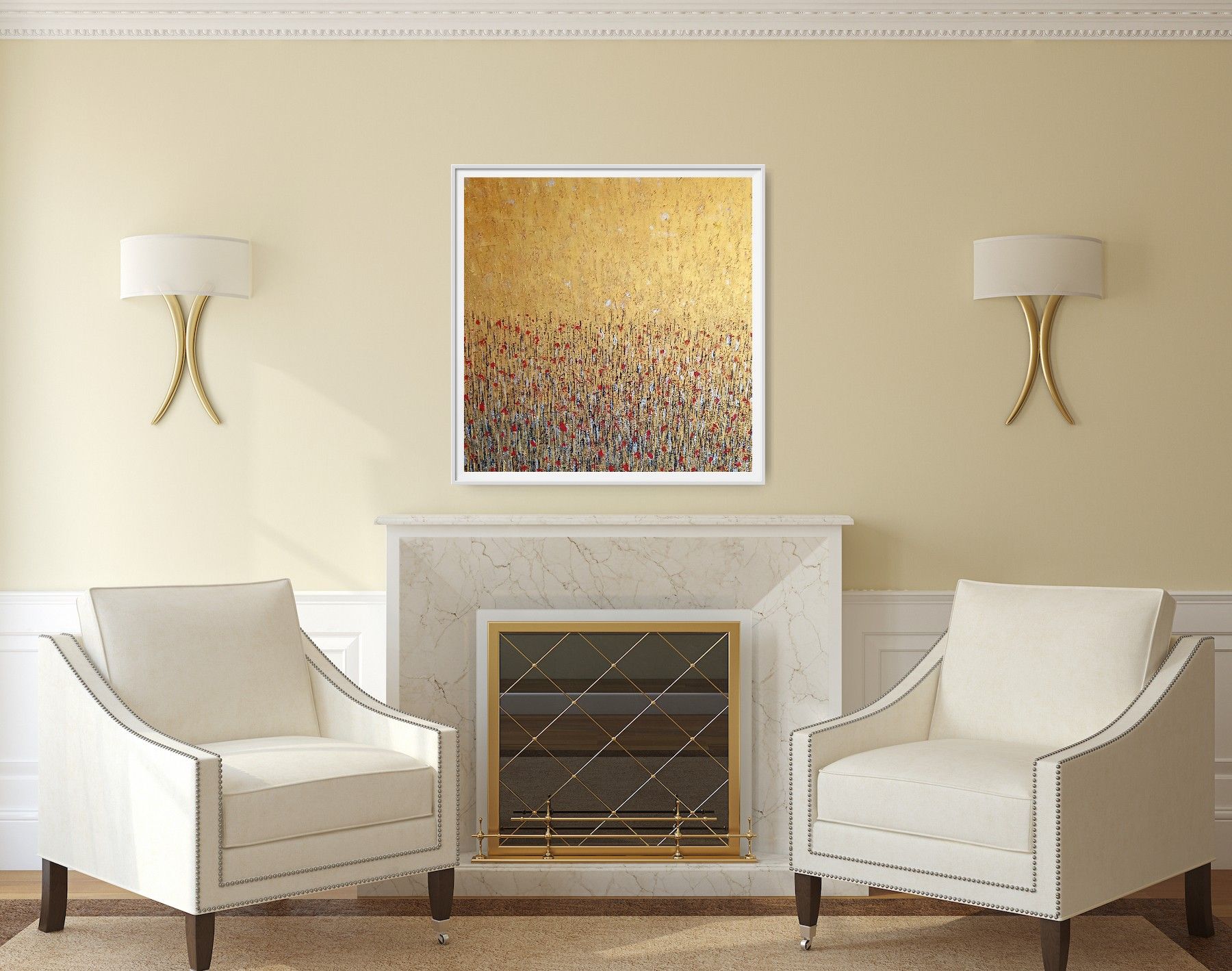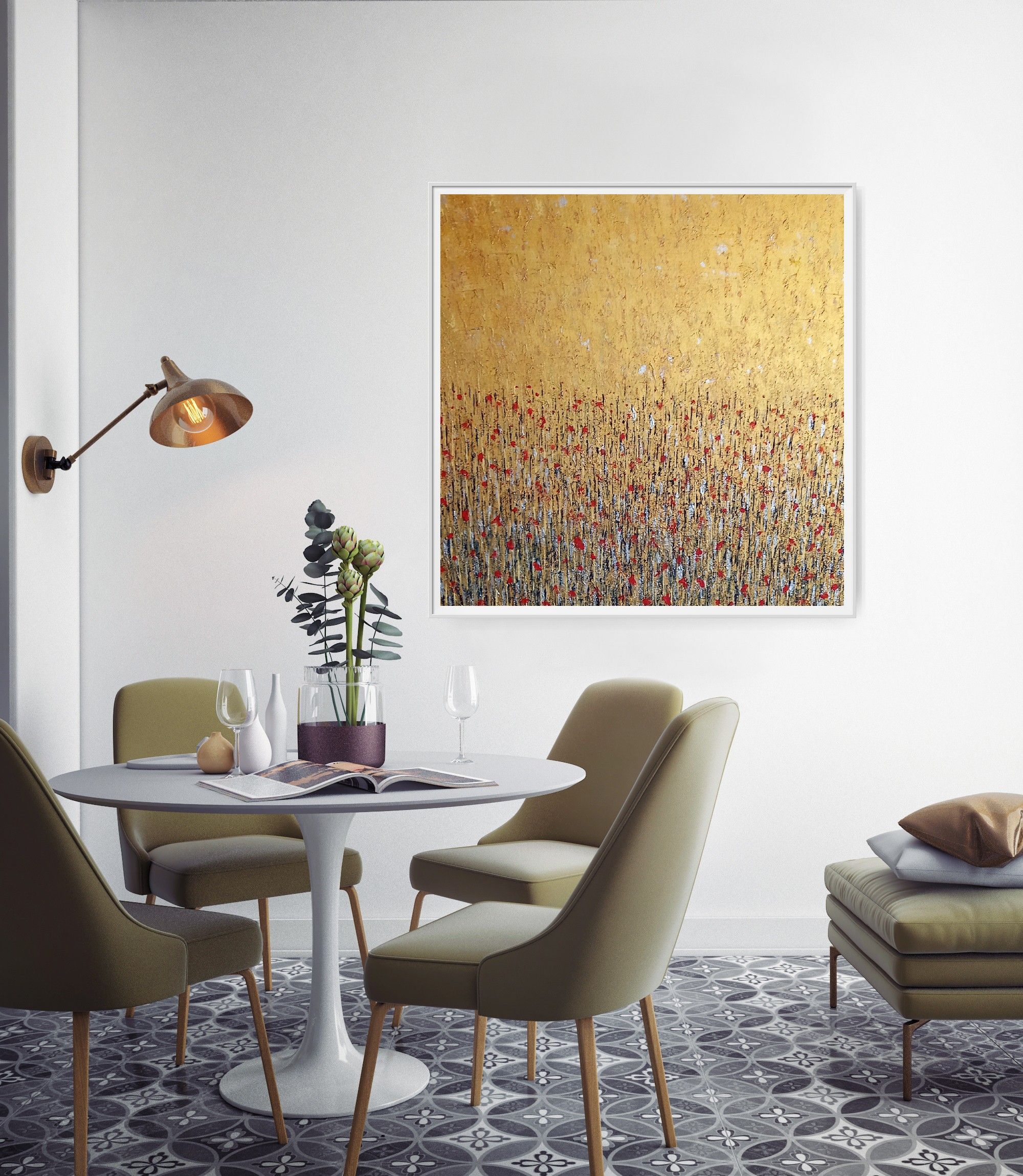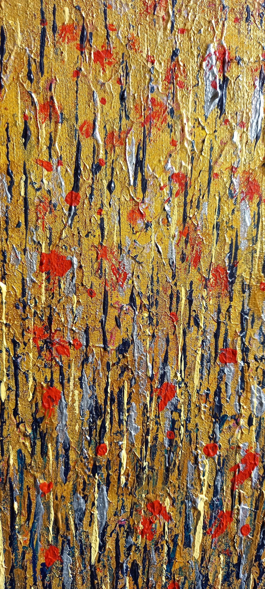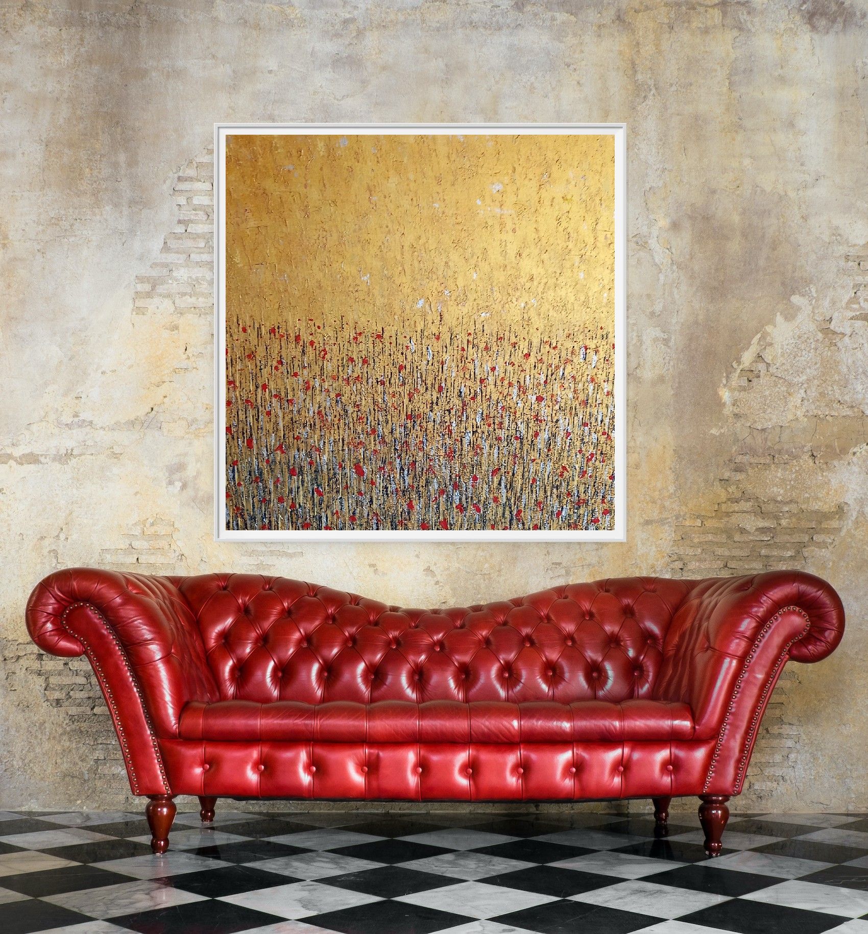 Gold is used boldly and bravely in this painting. Depth is created by layering different shades of gold. The red poppy gives the painting a pop and an elegant finish.