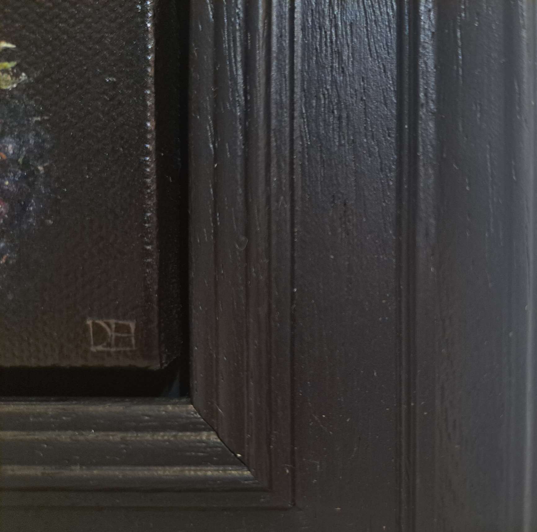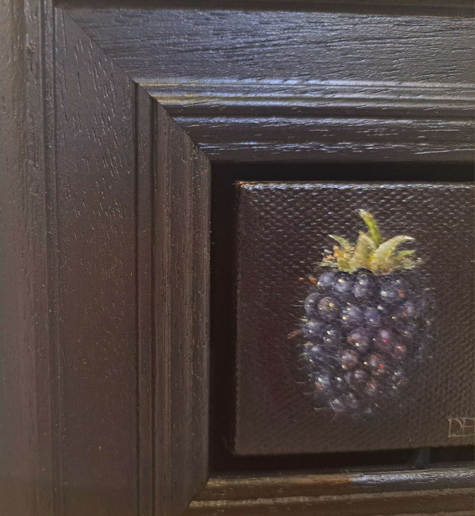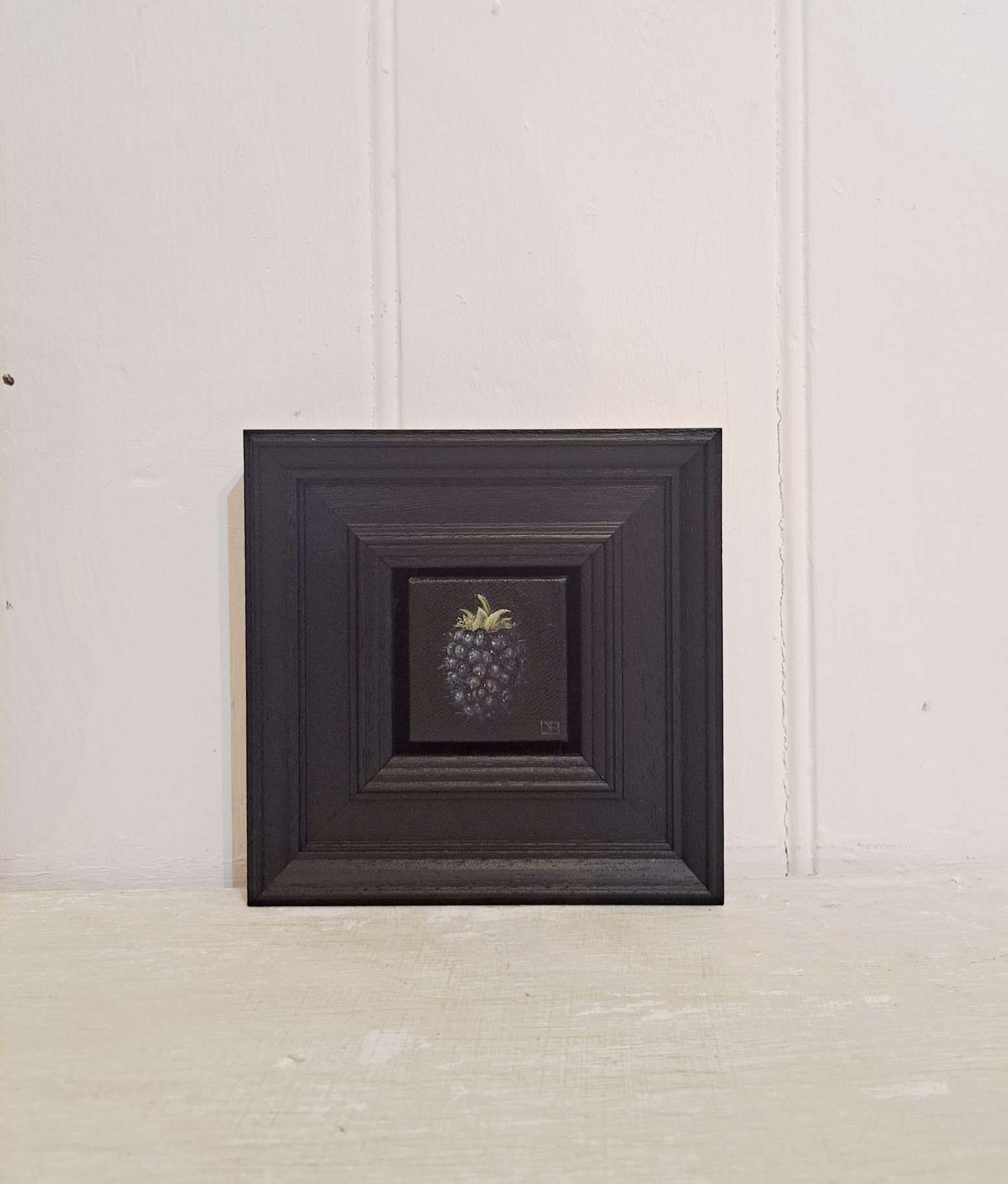 Pocket Blackberry is an original oil painting by Dani Humberstone as part of her Pocket Painting series featuring small scale realistic oil paintings, with a nod to baroque still life painting. The paintings are set in a black wood layered frame.