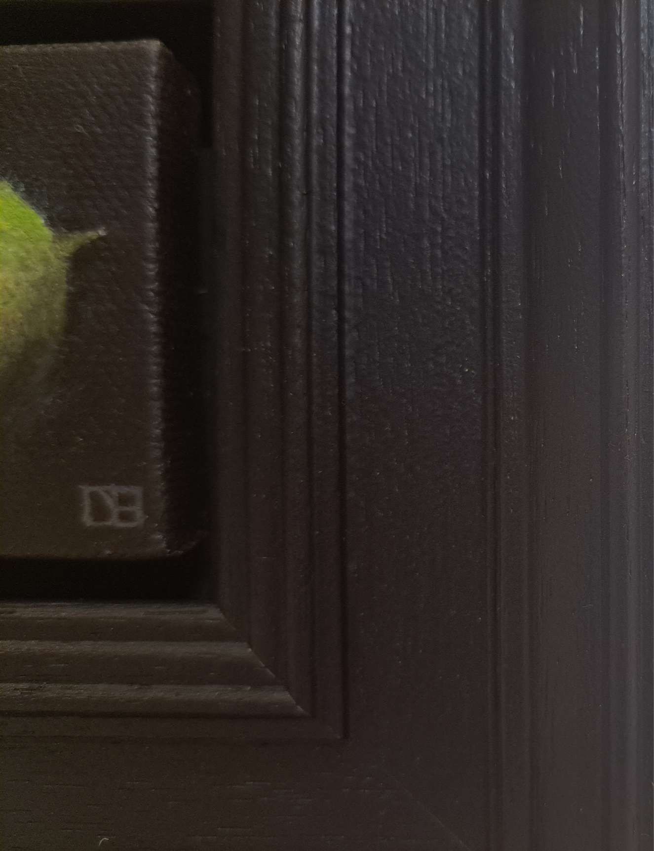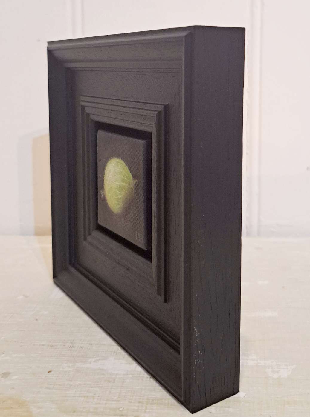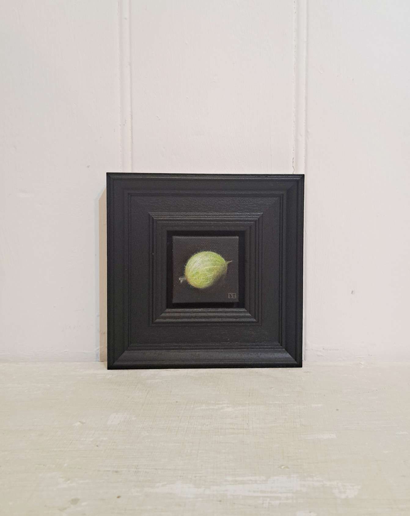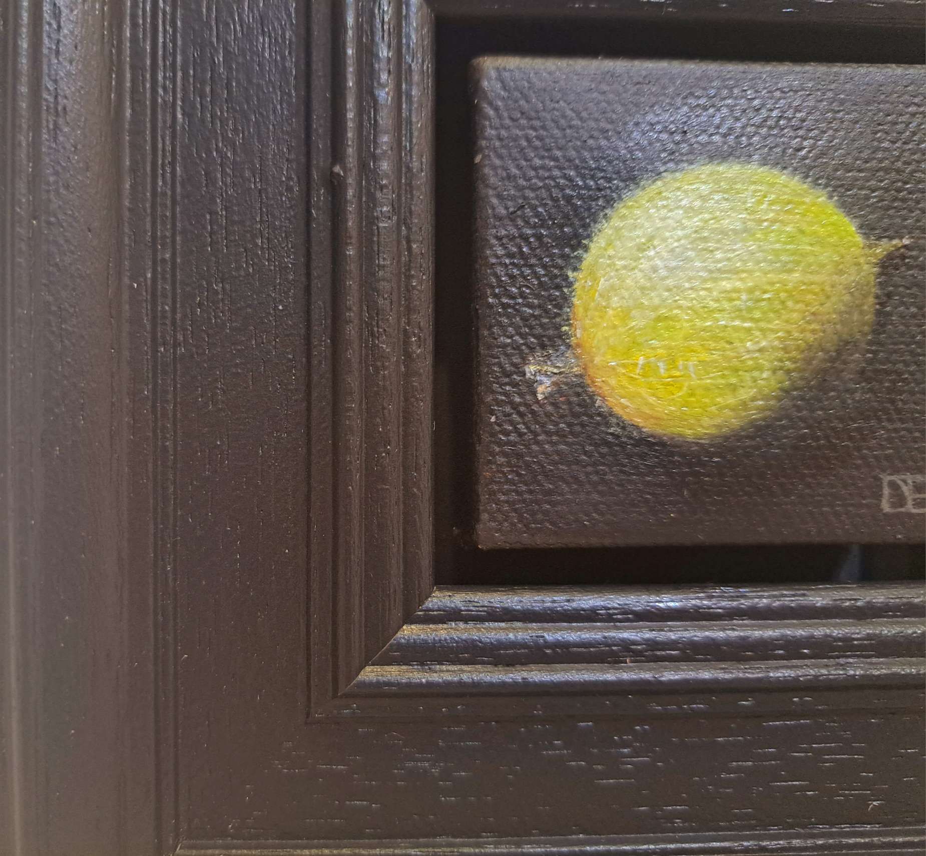 Pocket Gooseberry is an original oil painting by Dani Humberstone as part of her Pocket Painting series featuring small scale realistic oil paintings, with a nod to baroque still life painting. The paintings are set in a black wood layered frame.