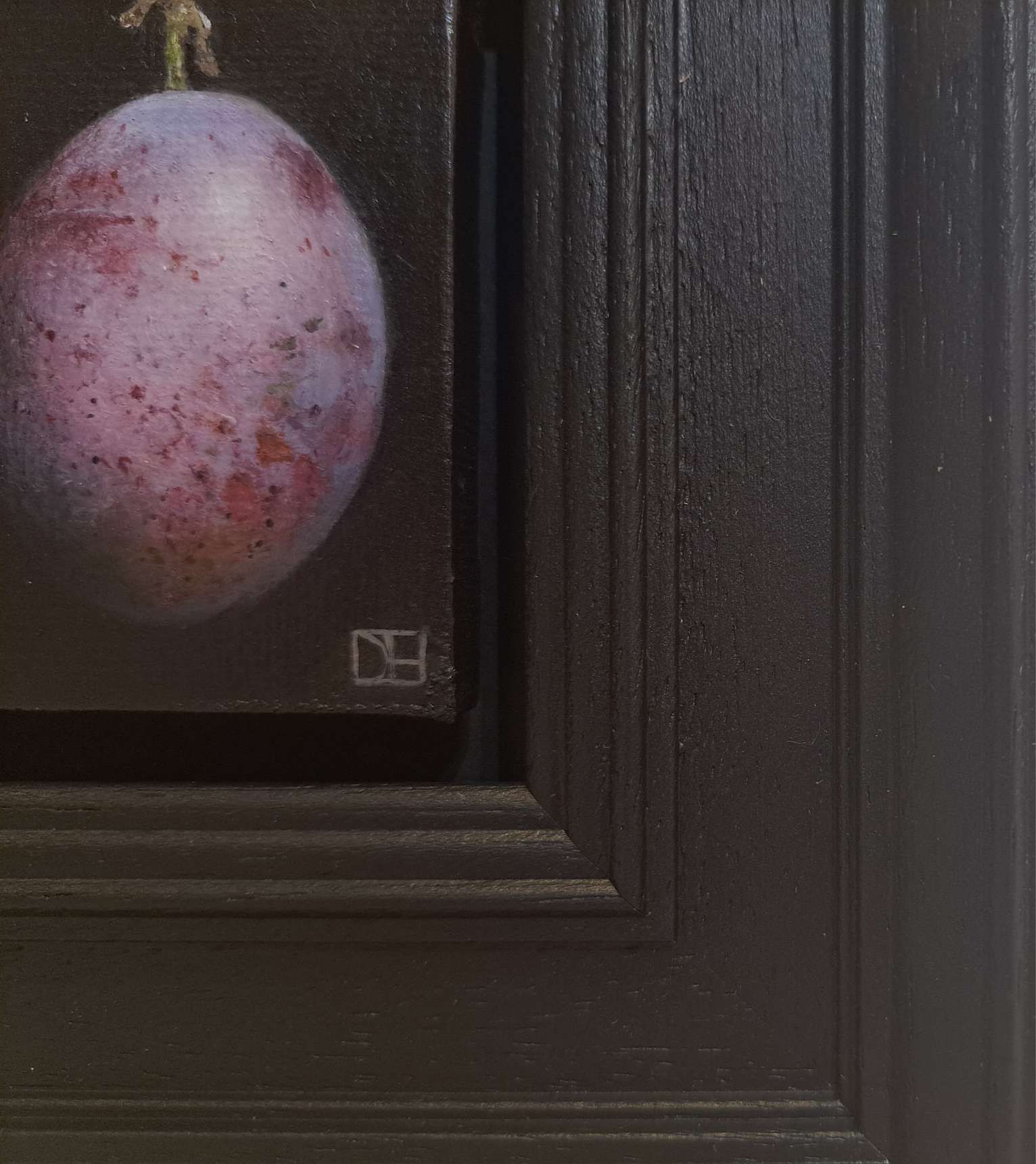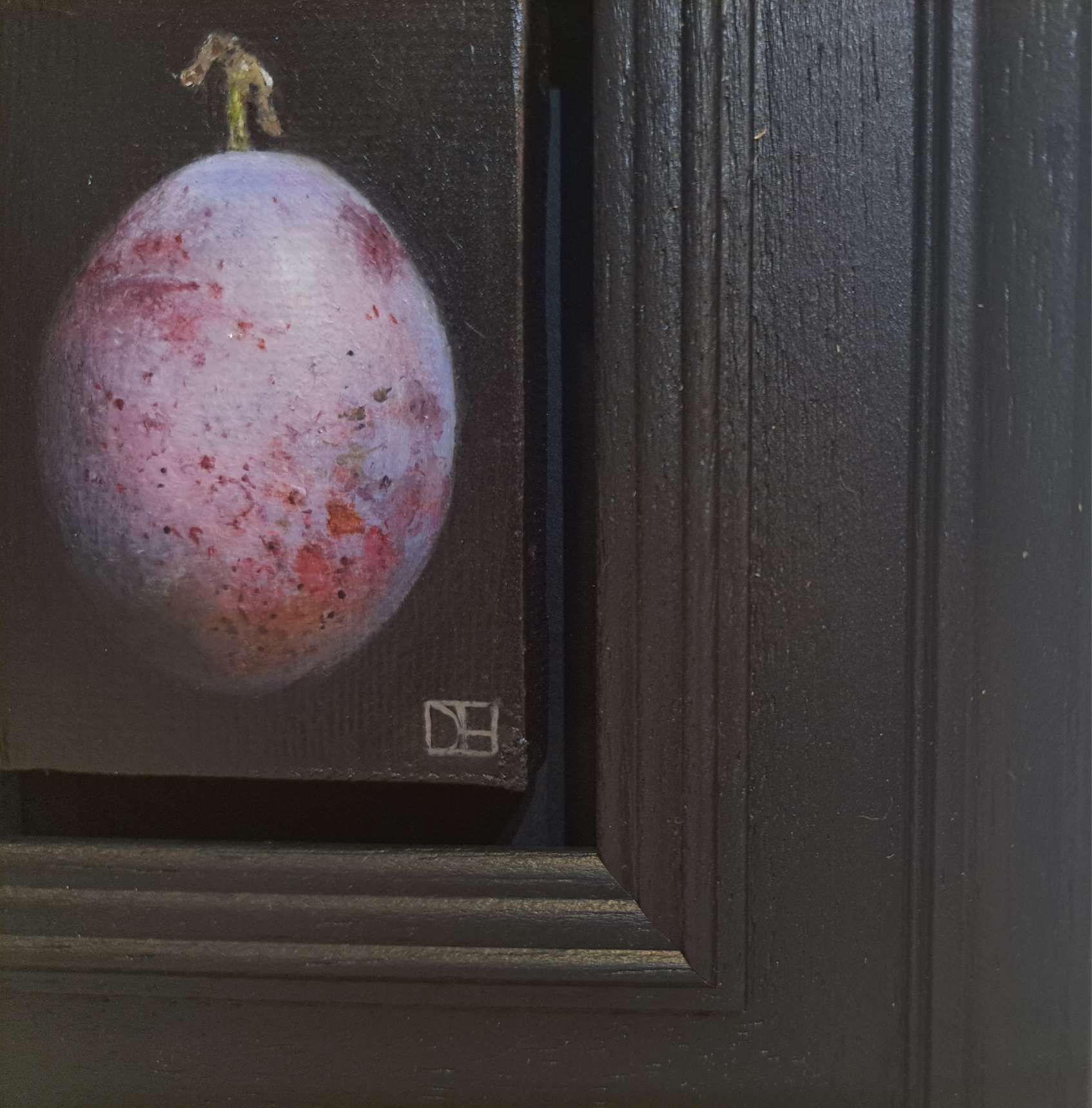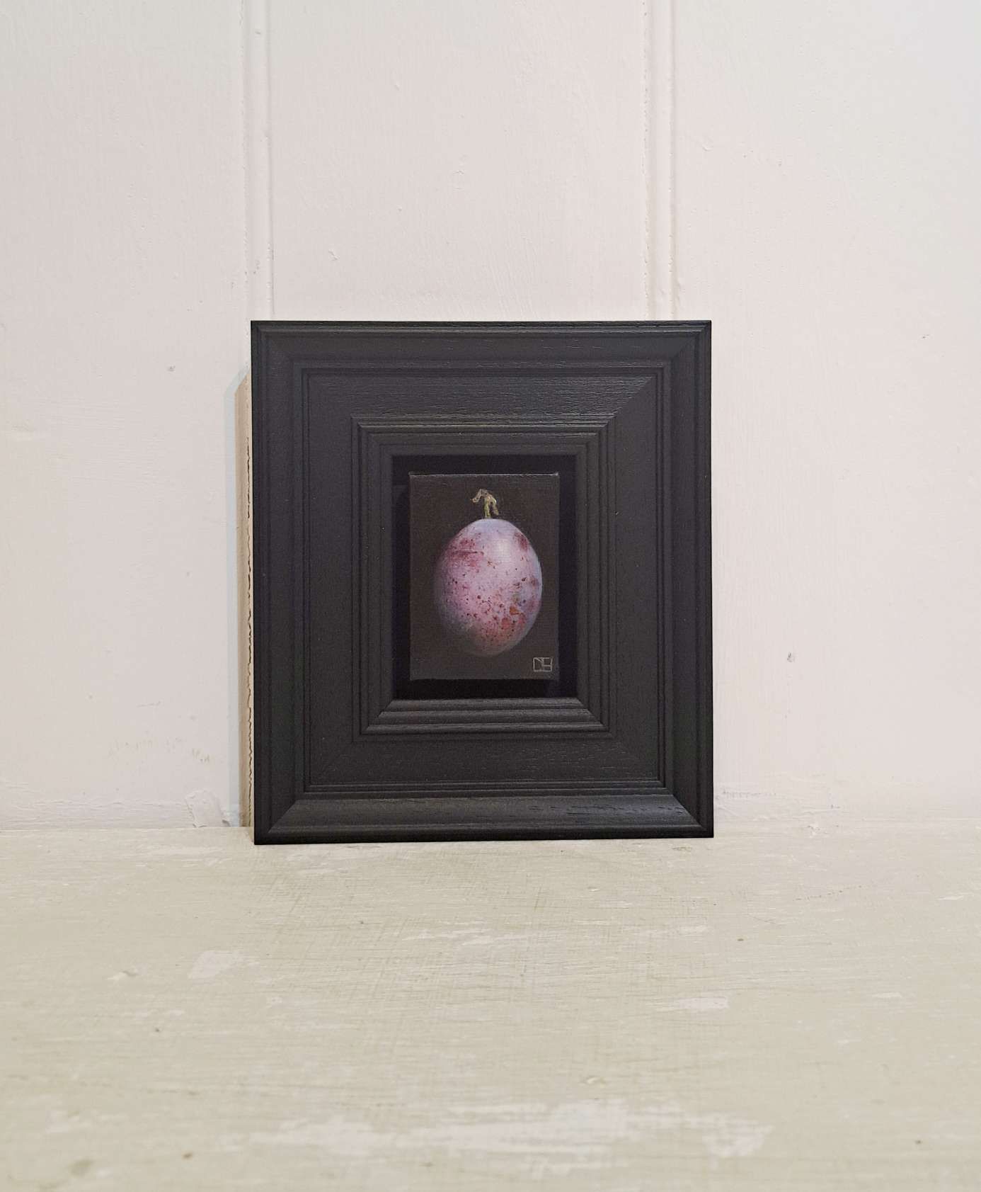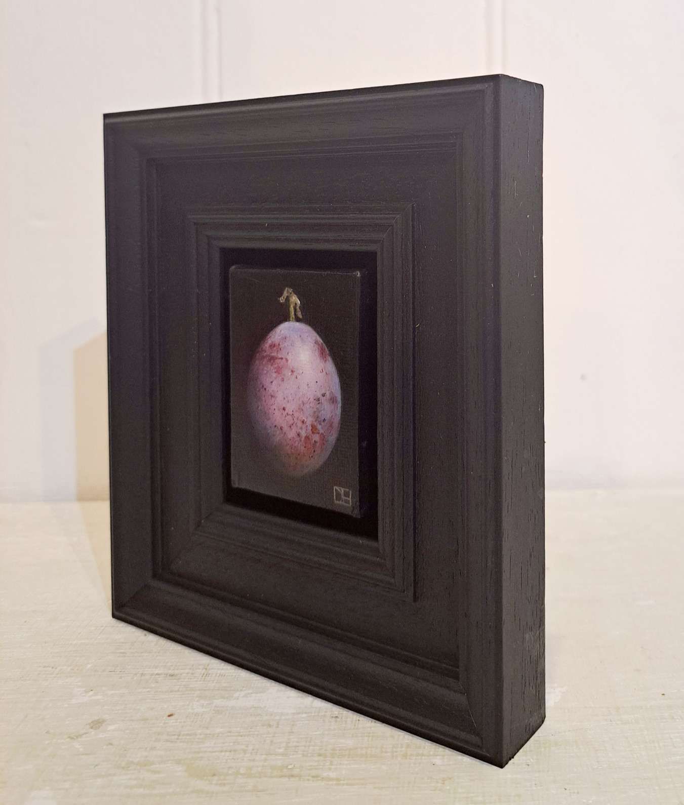 Pocket Mauve Damson is an original oil painting by Dani Humberstone as part of her Pocket Painting series featuring small scale realistic oil paintings, with a nod to baroque still life painting. The paintings are set in a black wood layered frame.