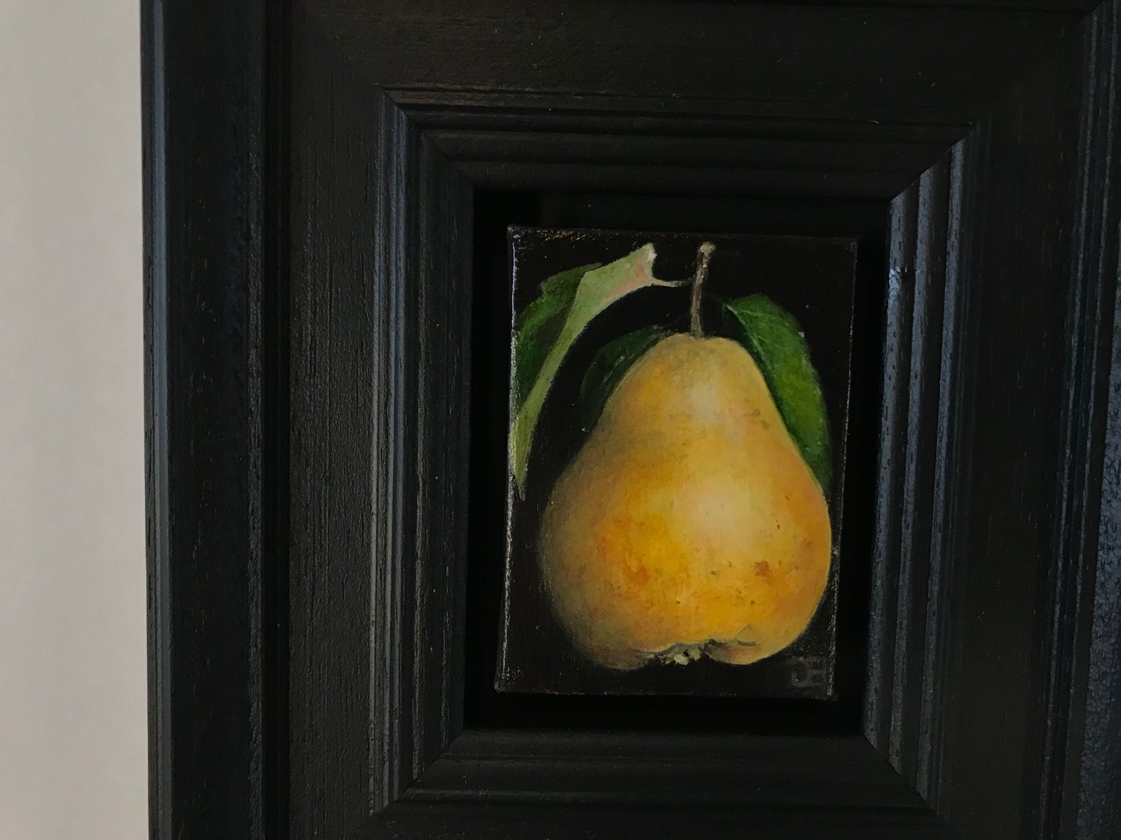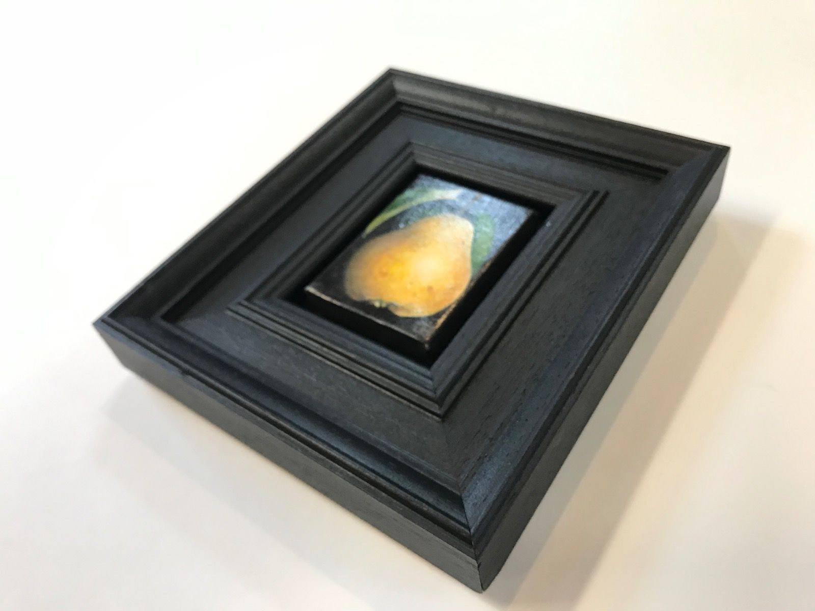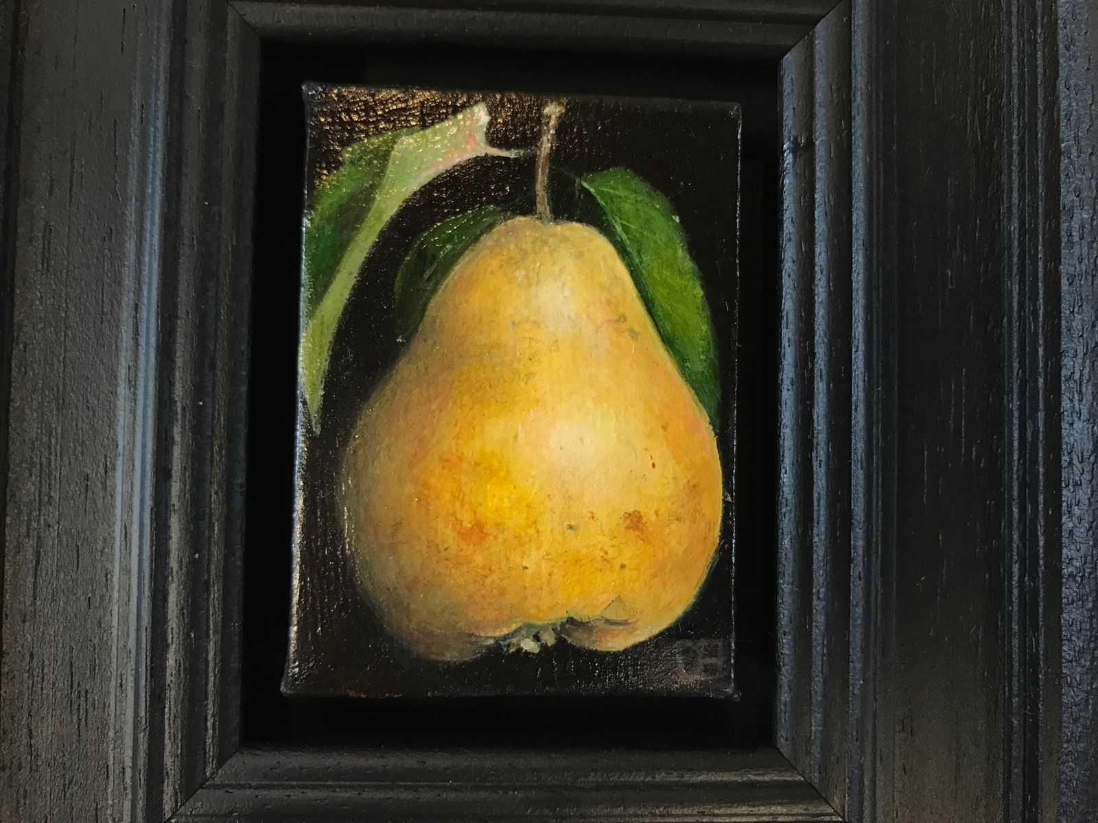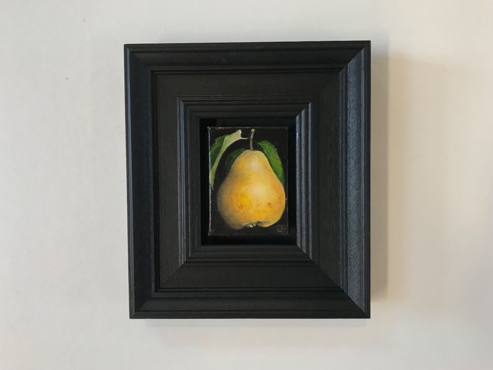 Pocket Deep Yellow Quince is an original oil painting by Dani Humberstone as part of her Pocket Painting series featuring small scale realistic oil paintings, with a nod to baroque still life painting. The paintings are set in a black wood layered frame.