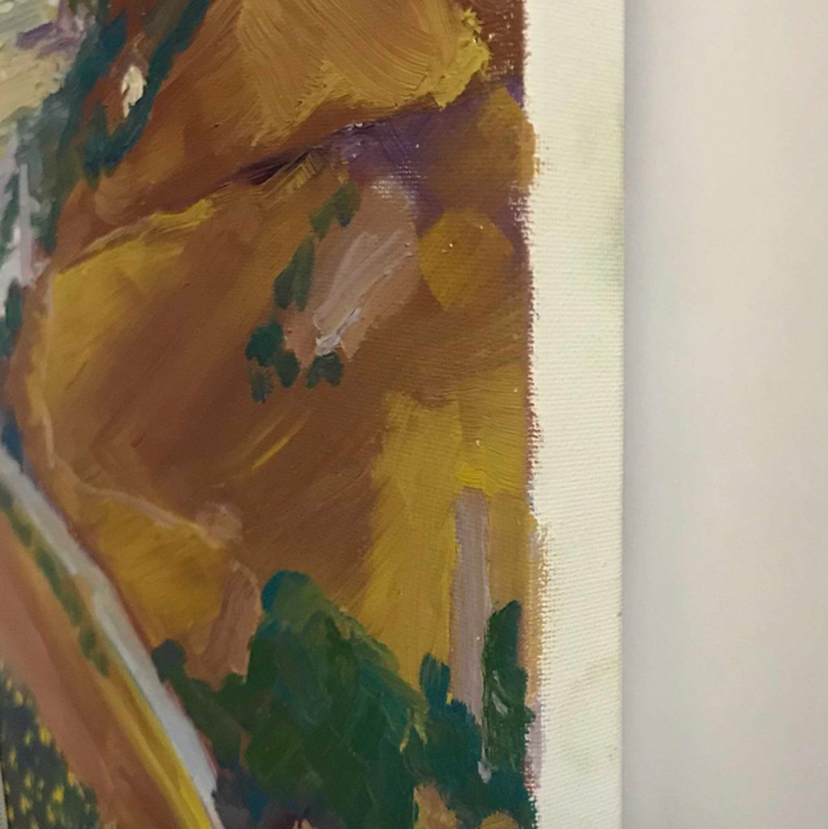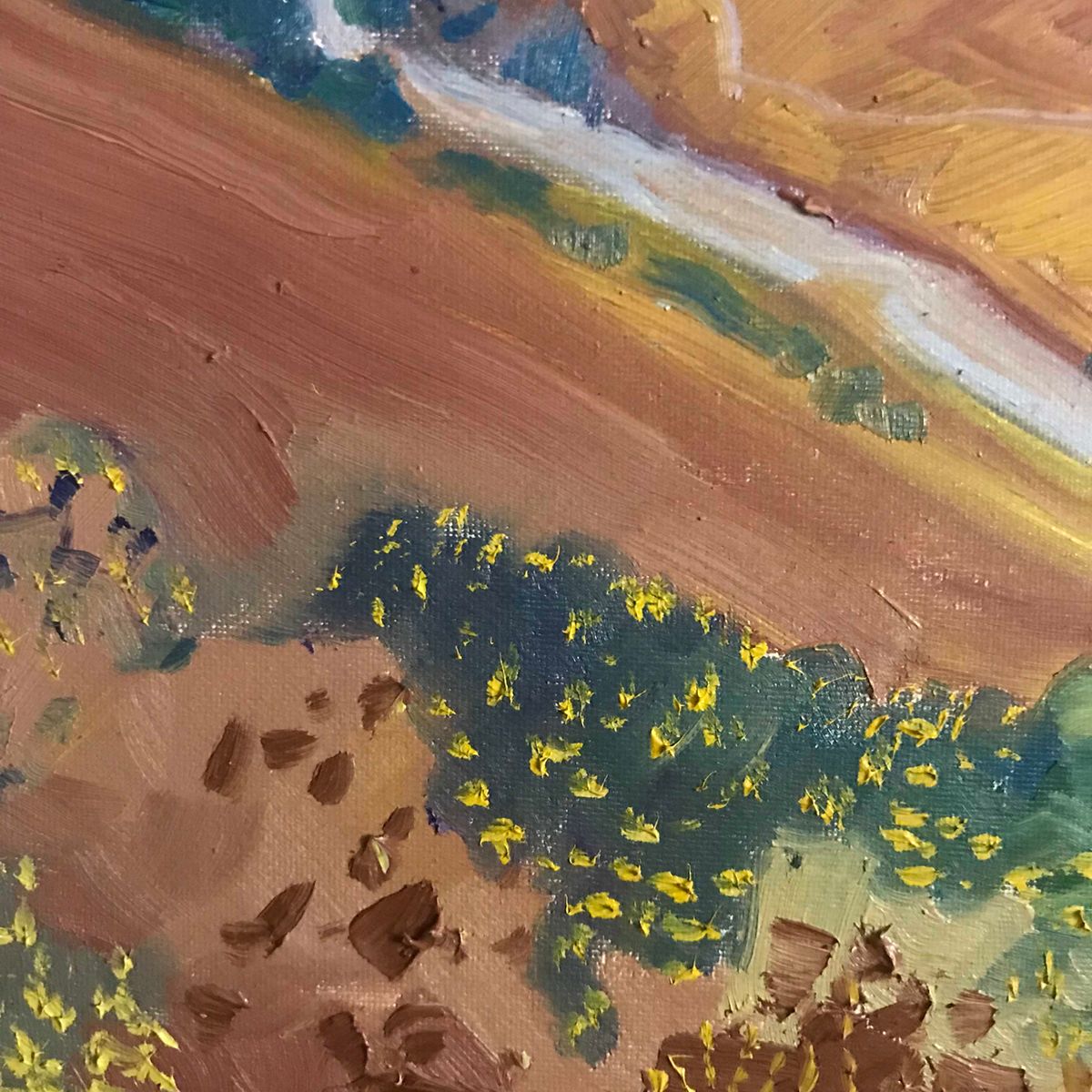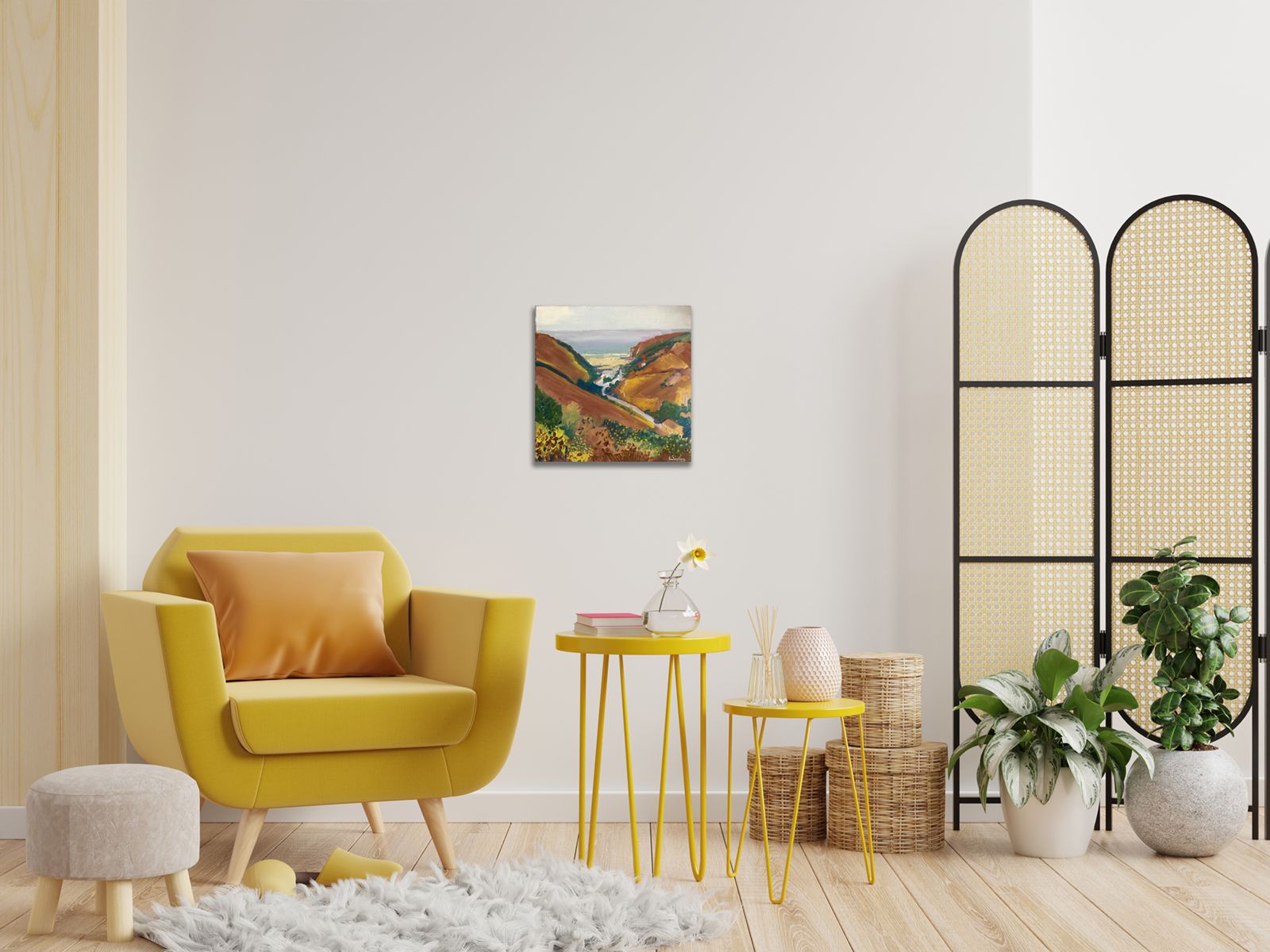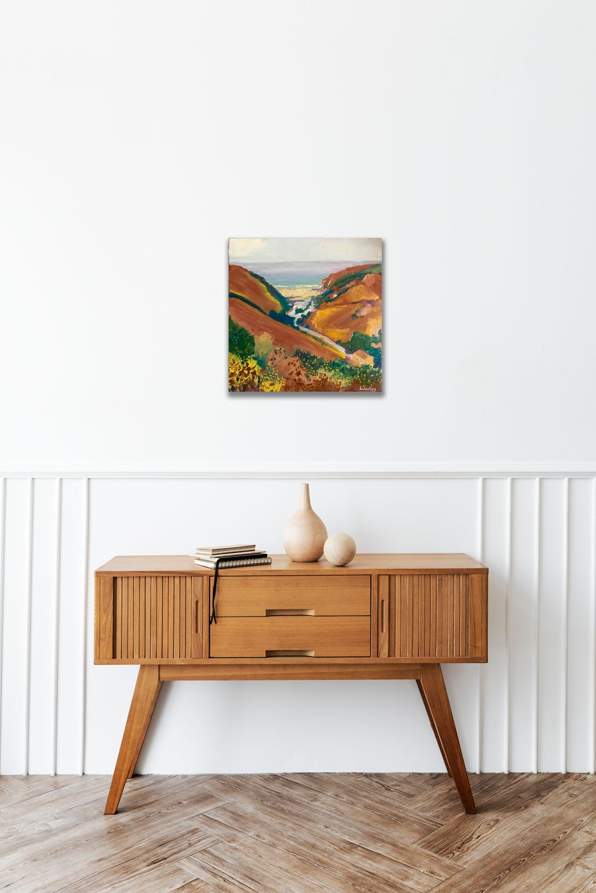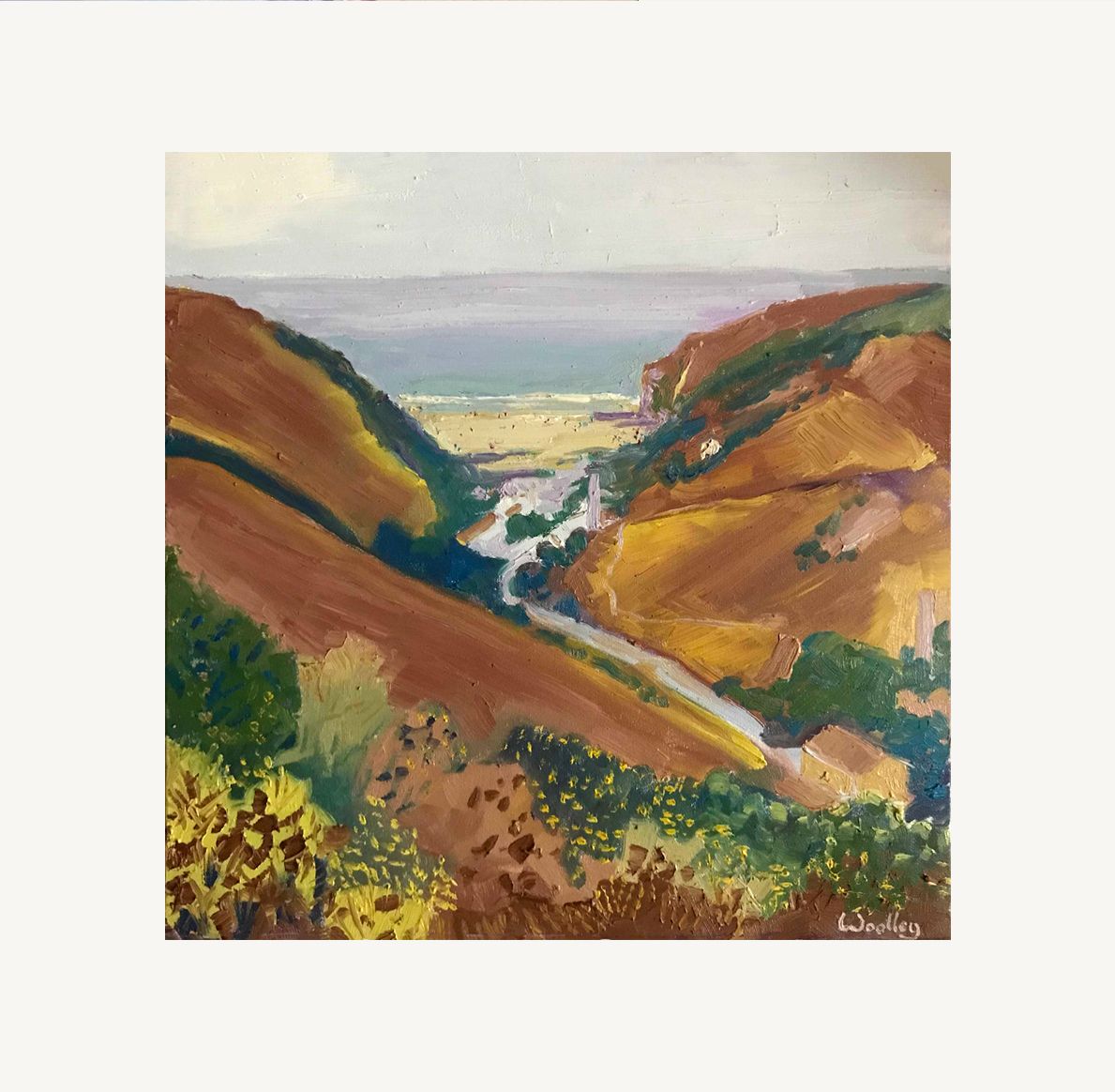 Porthtowan Heather is an Original Painting by Eleanor Woolley. Painted of Porthtowan headland and finished in the Artist's Gloucestershire Studio, this Painting depicts the russet heather hillside descending to Porthtowan beach. The copper coloured heather leads us down to the beach dotted with its colourful swimmers. In the foreground the