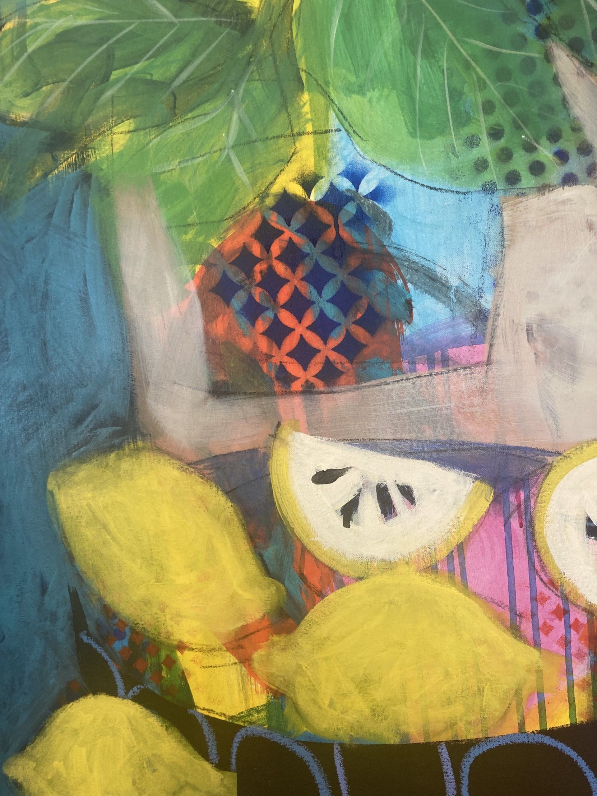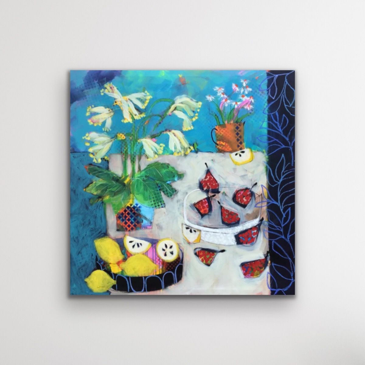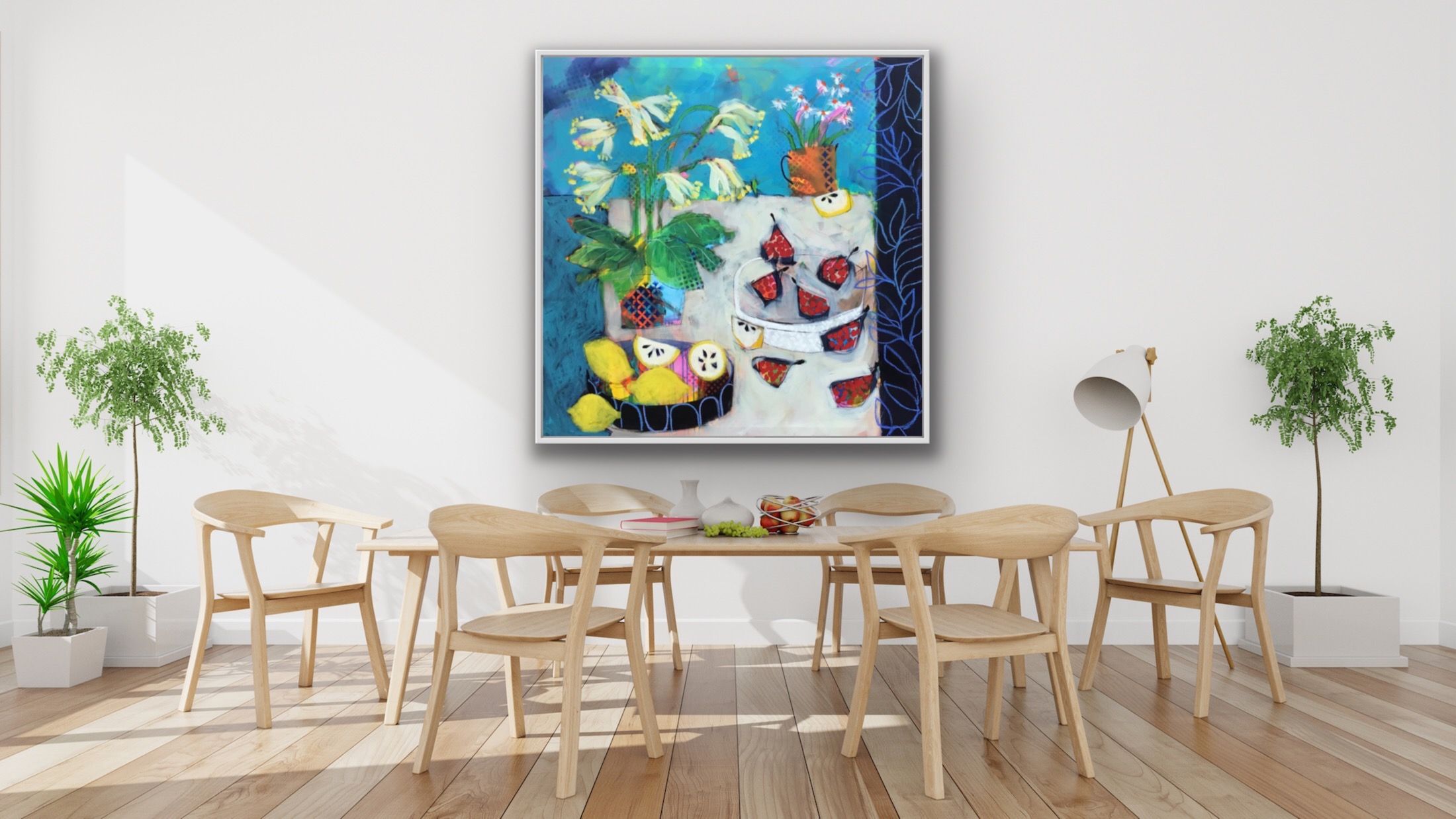 An original still life painting by Relton and Marine which features their signature use of lines at the focal point of the piece, and bright colours.