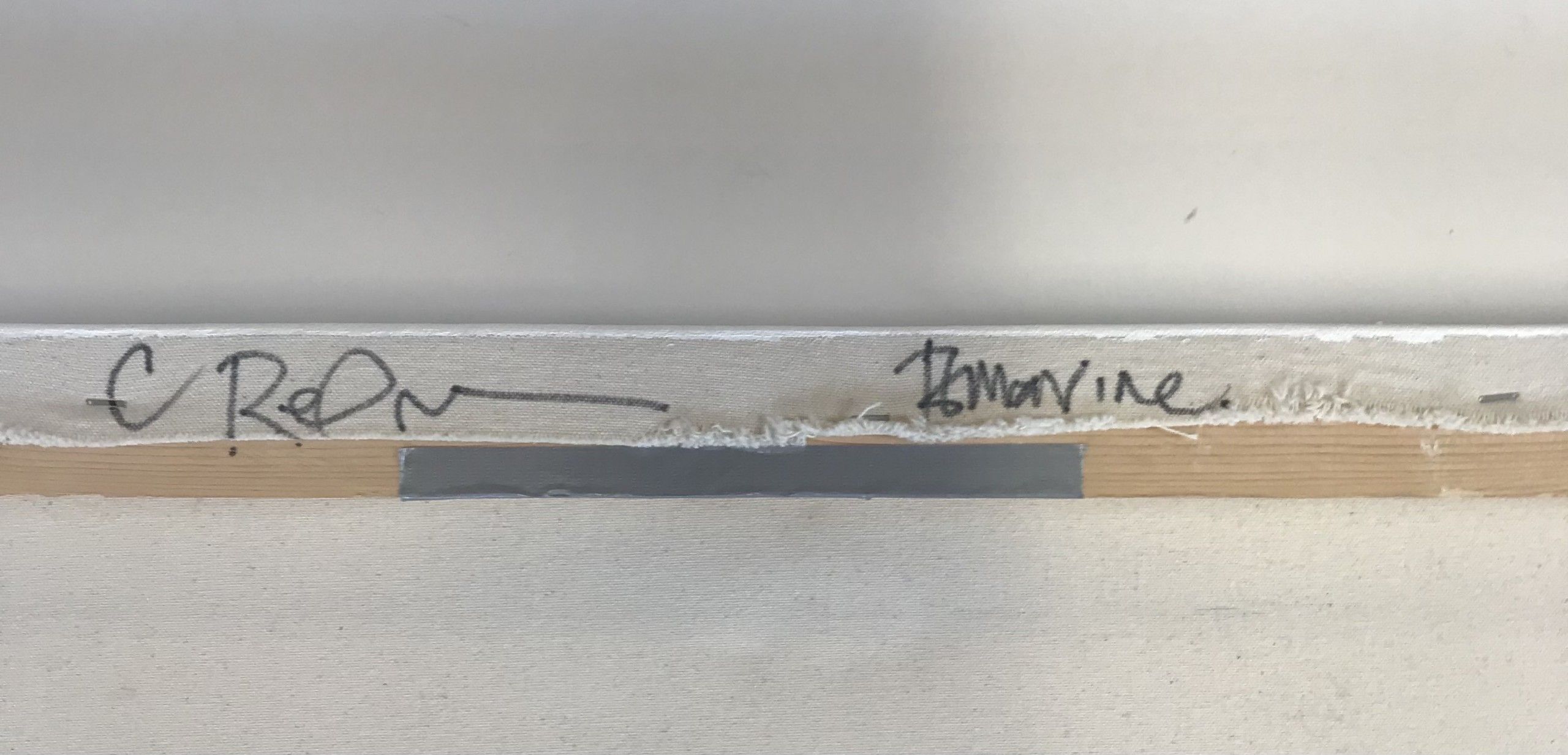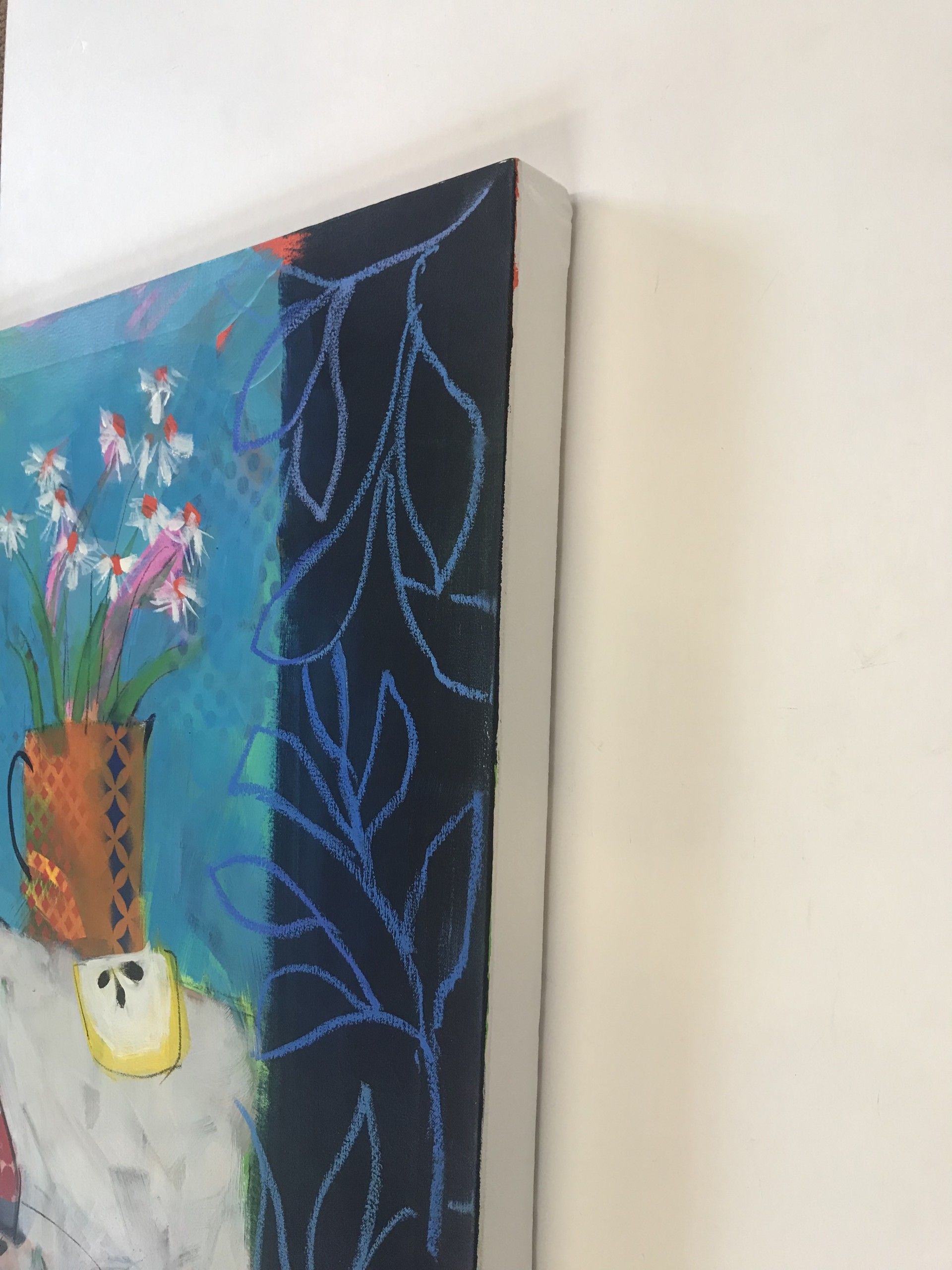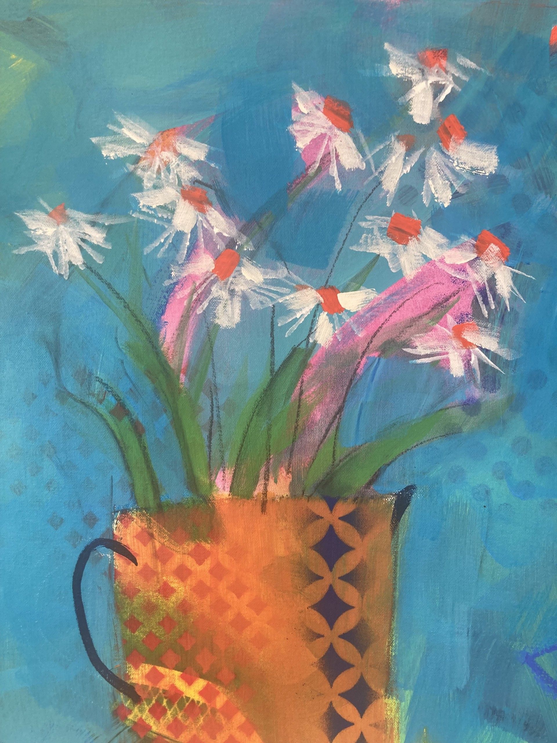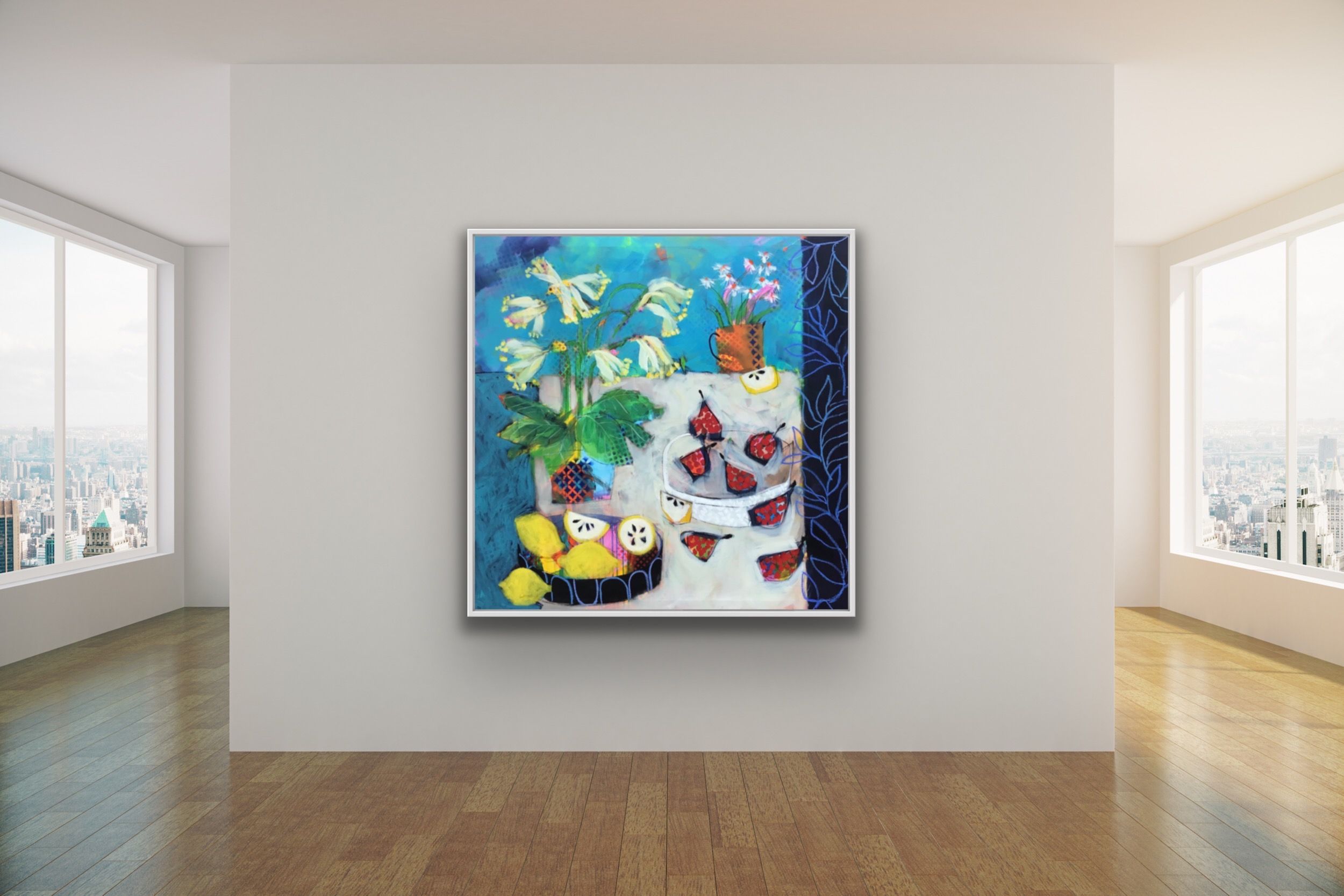 An original still life painting by Relton and Marine which features their signature use of lines at the focal point of the piece, and bright colours.