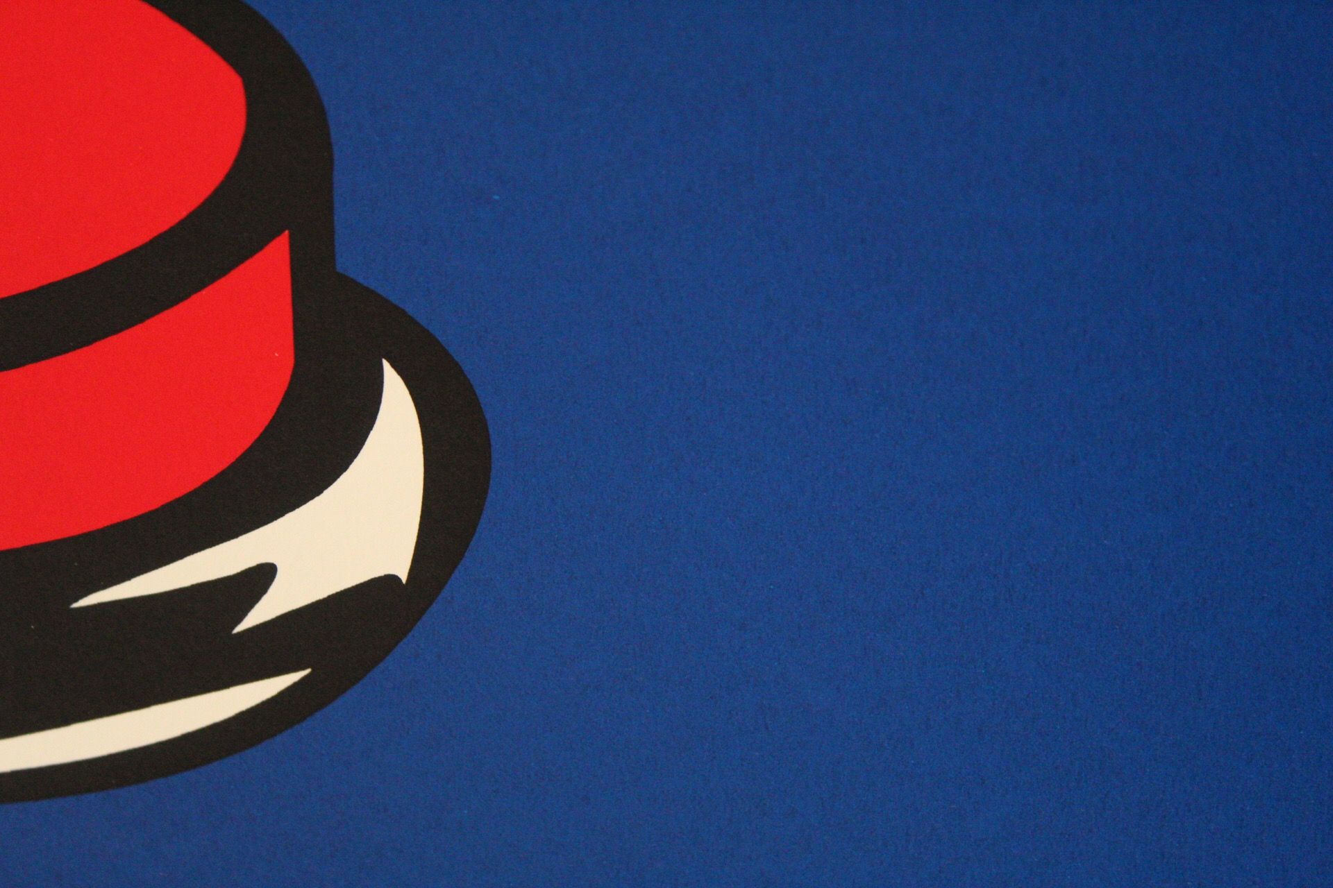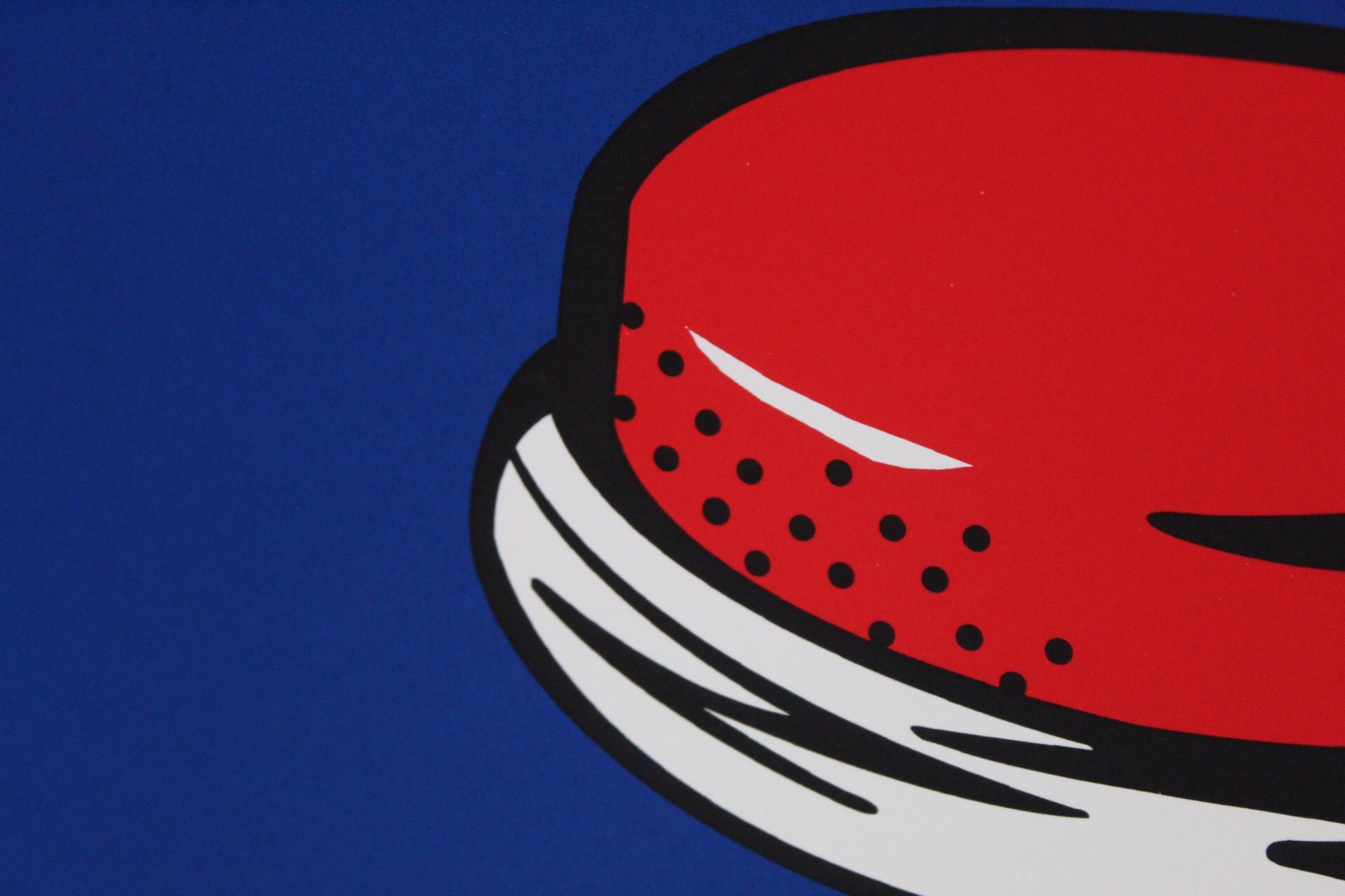 Masters of War (Blue) by Pure Evil is a political image featuring Donald Trump and Kim Jong Un's red button. 70 x 75 cm on 330gsm Fedrigoni Paper Signed editon of 100 4 colour signed screenprint