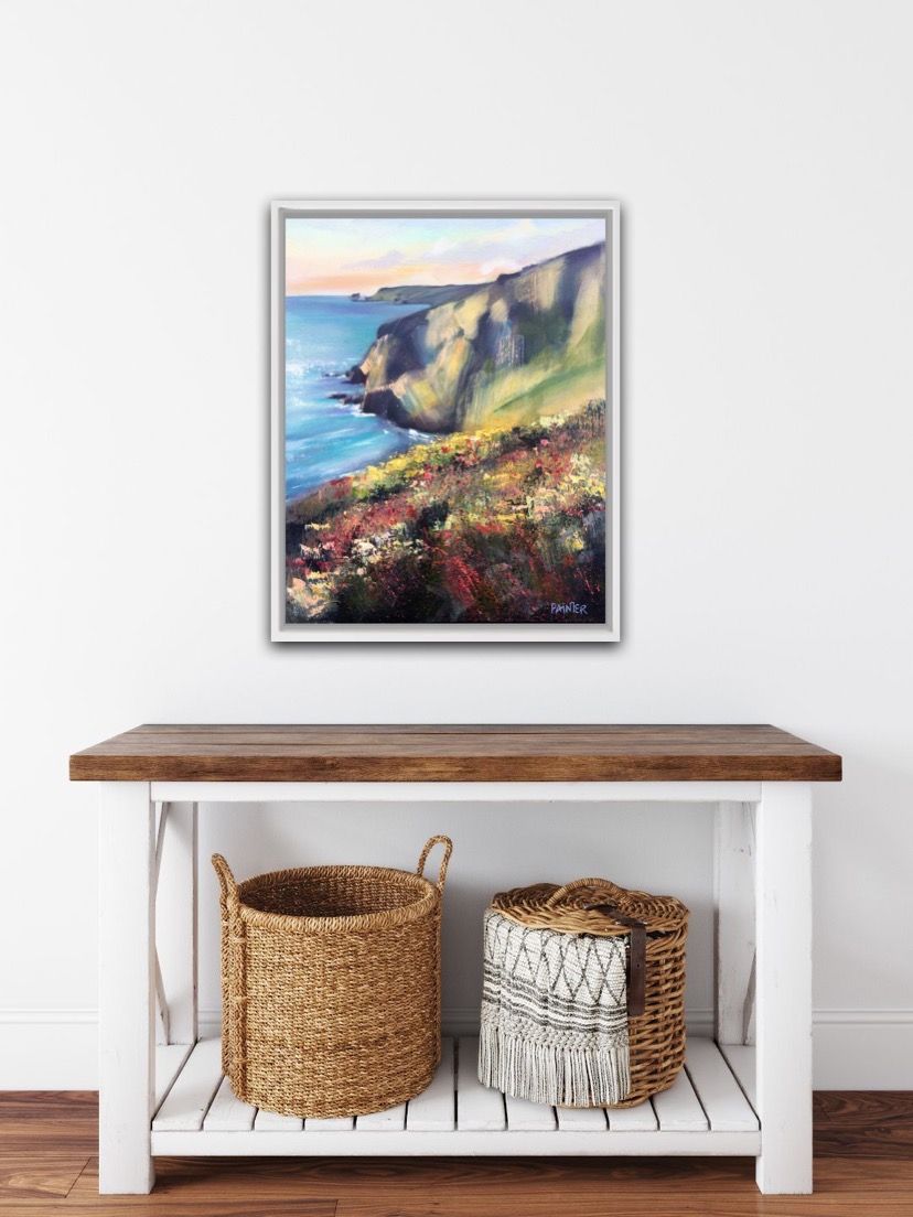 Rachel Painter Cliffs At Porthtowan Original Landscape Painting Oil On Board Image Size: 50 x 40 x 0.5 cm Sold Unframed Free Shipping Please note that in situ images are purely an indication of how a piece may look. Feel the warm glow of the setting sun on the heather in ‘Cliffs Of Porthtowan’, an original landscape oil