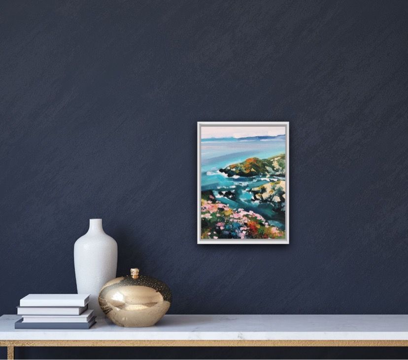 Rachel Painter The Water & Horizon No.4 Original Landscape Painting Oil On Board Image Size: 15 x 20 x 0.3 cm Sold Unframed Free Shipping Please note that in situ images are purely an indication of how a piece may look. ‘The Water & Horizon No.4’, an original landscape oil painting of Halzephron Cliff, near Gunwallow in Cornwall