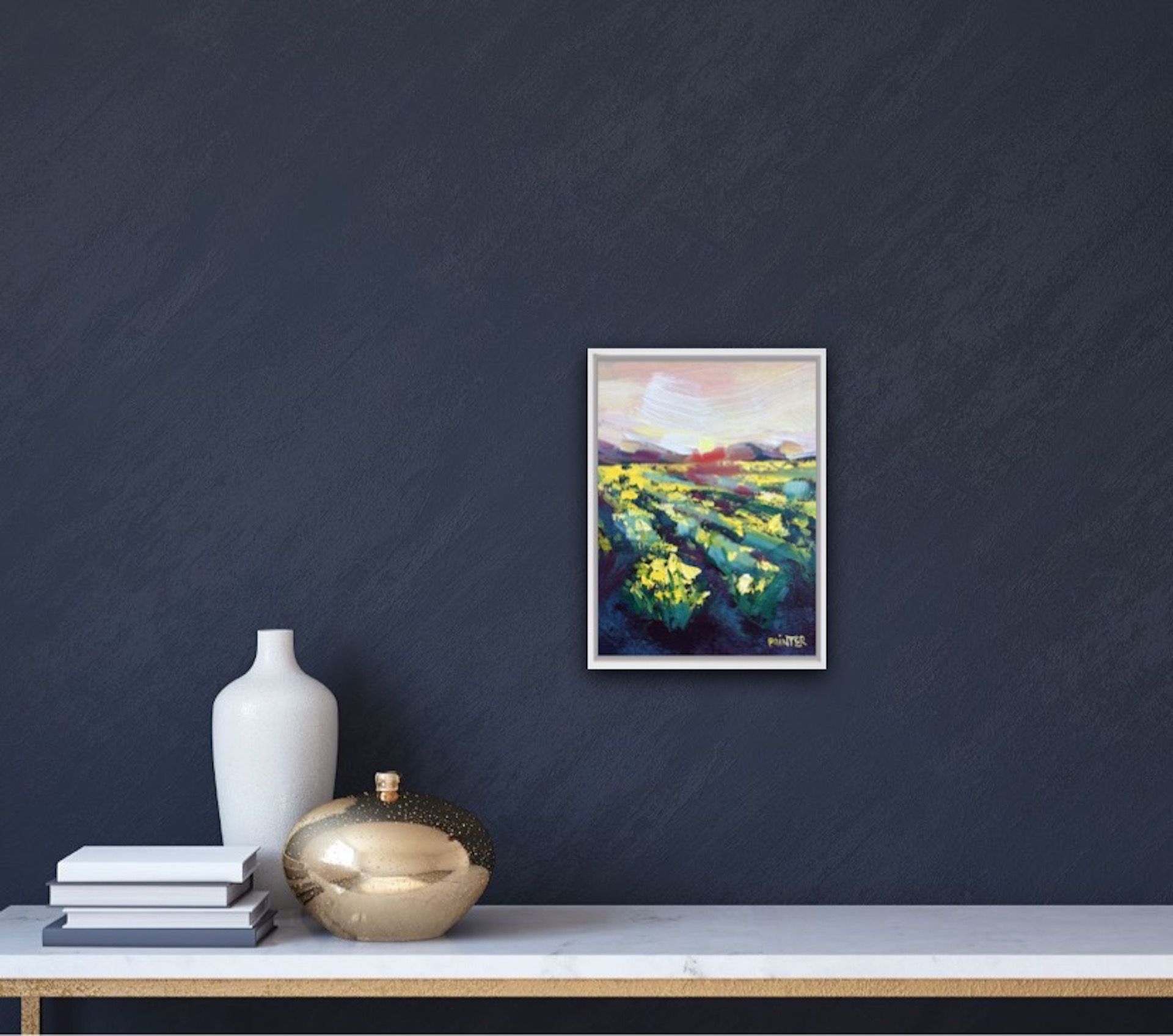 Rachel Painter Wings Of Dawn Original Landscape Painting Oil On Board Image Size: H 20cm x W 15cm x 0.3 cm Sold Unframed Free Shipping Please note that in situ images are purely an indication of how a piece may look. Feel the warm glow of the setting sun on the Cornish daffodils in ‘Wings Of Dawn’,