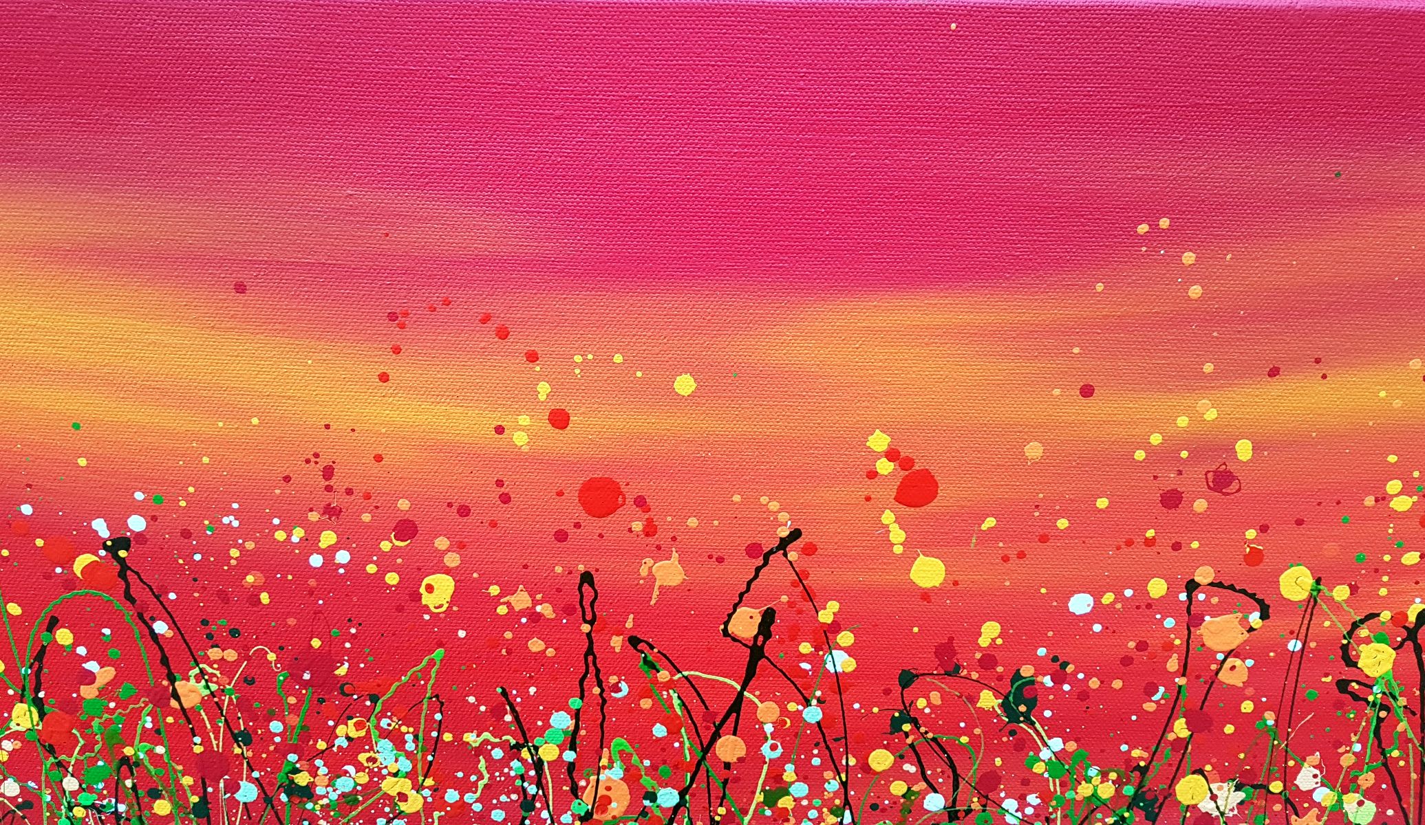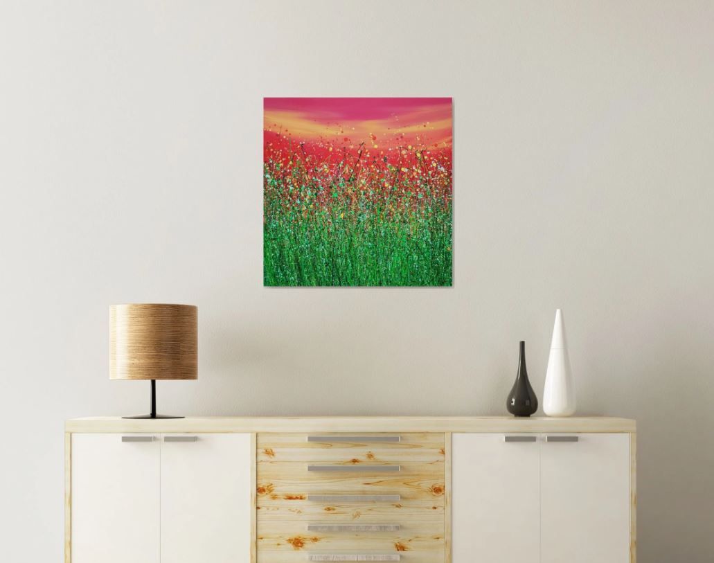 Red Sky At Night #7 - Using Red and orange to depict a vibrant skyline over a figurative meadow . An Original semi-abstract painting by Lucy Moore. Using her signature string grass technique Lucy has created a semi-abstract twist to her classic meadow paintings. Colourful pastels flowers beneath a sunlit